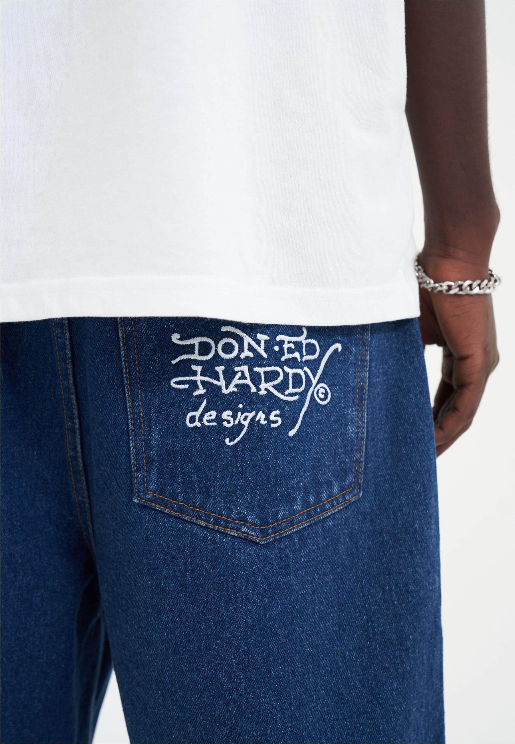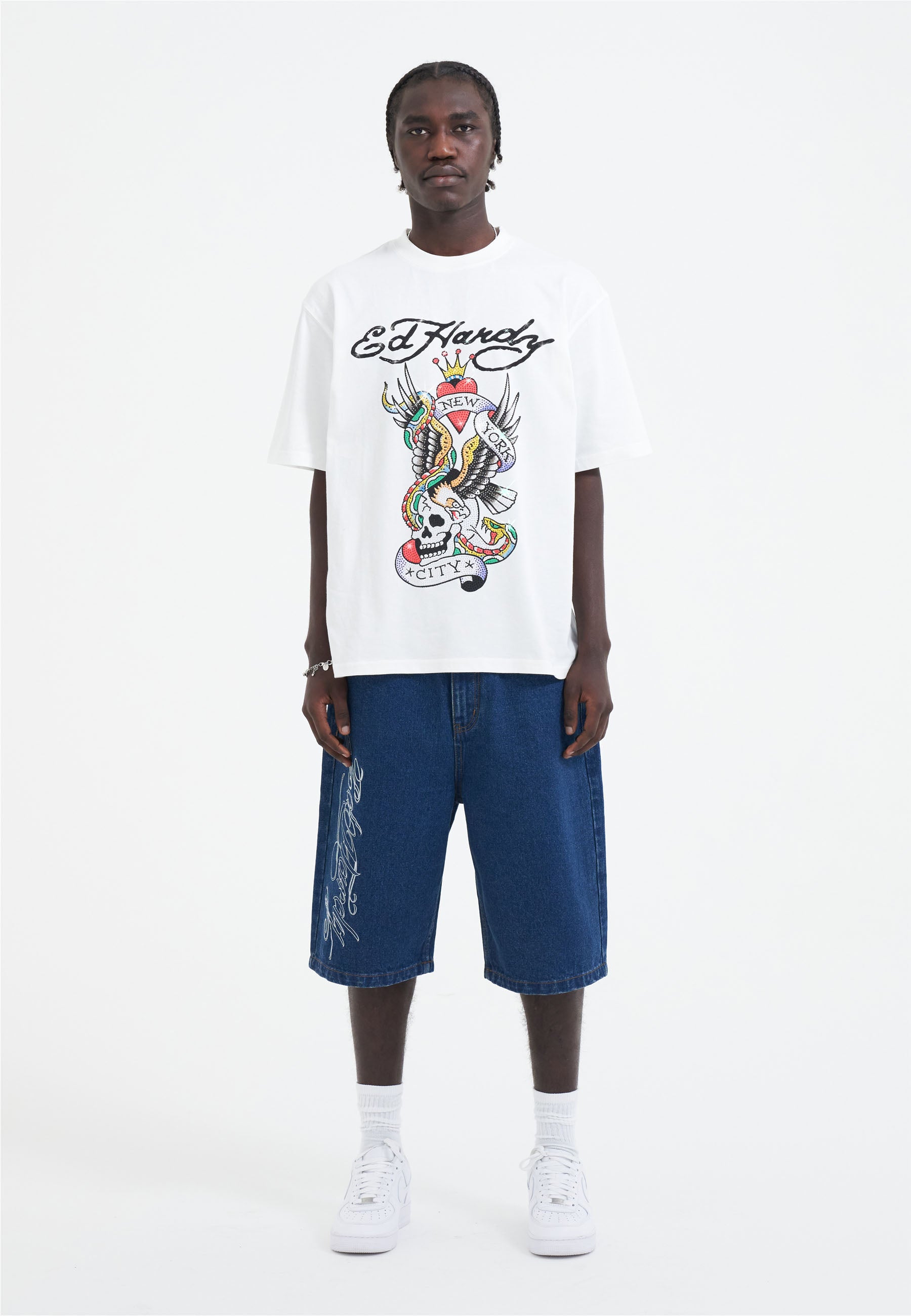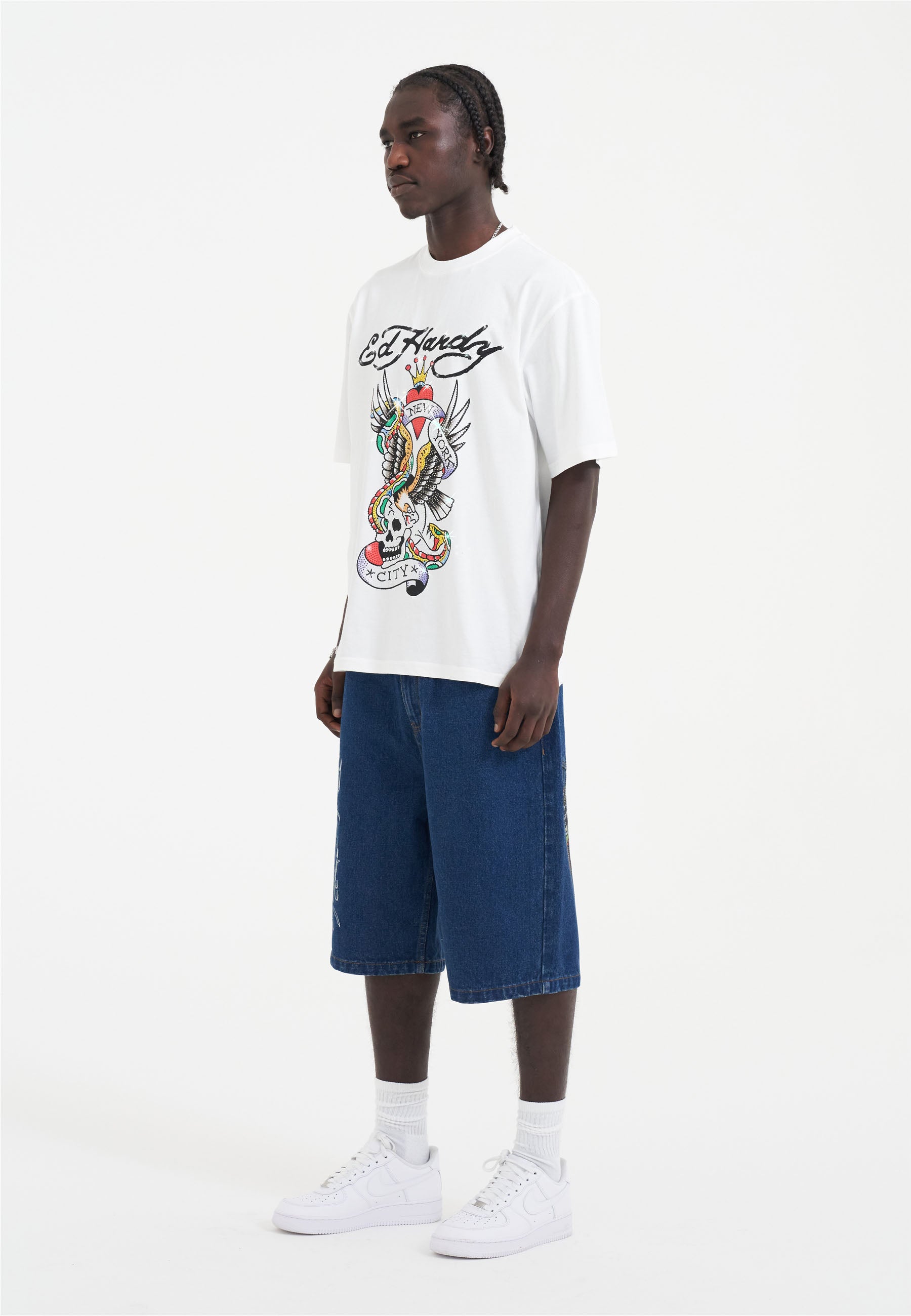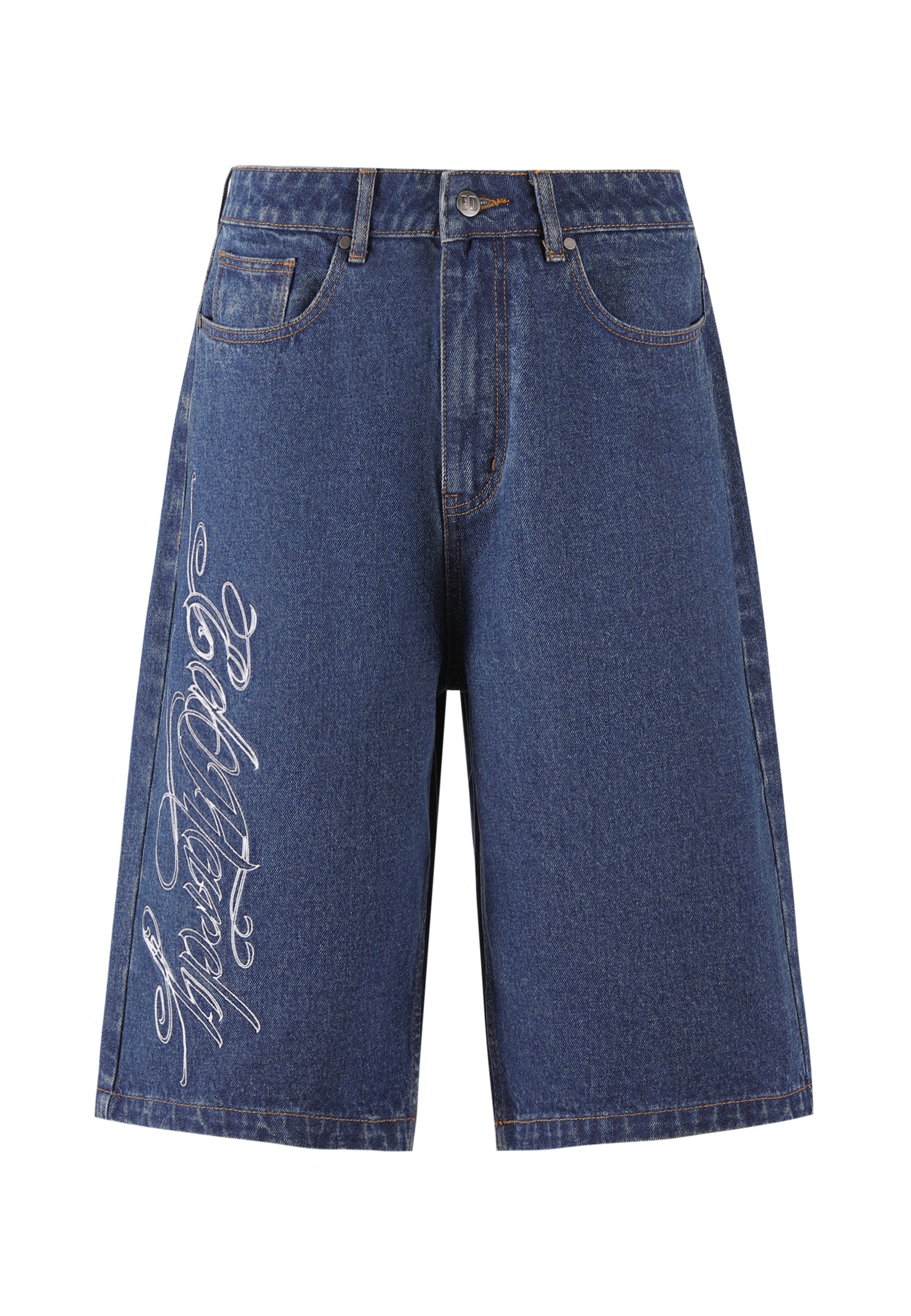 Mens Panther Snake Diamante Denim Jorts Shorts - Indigo