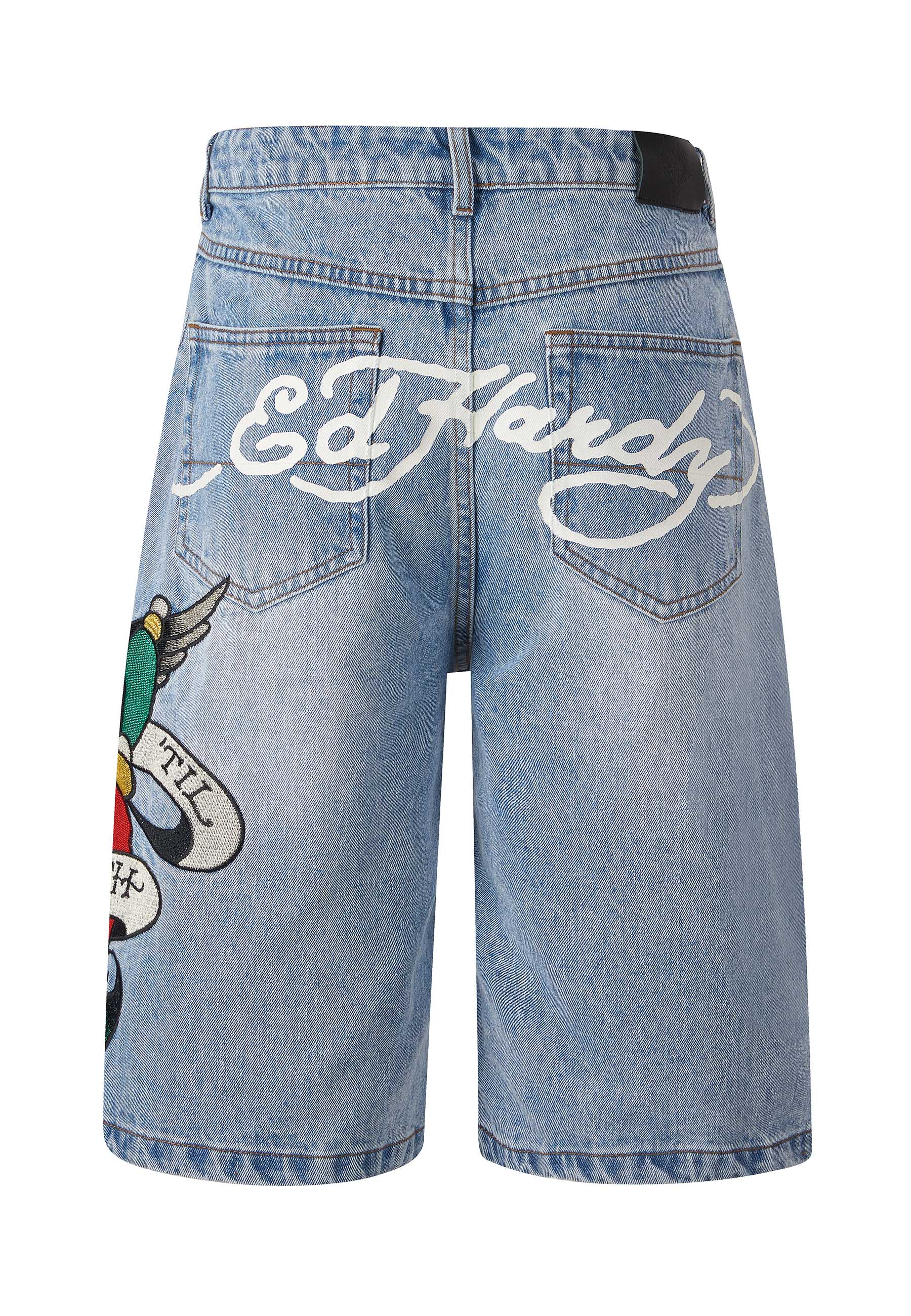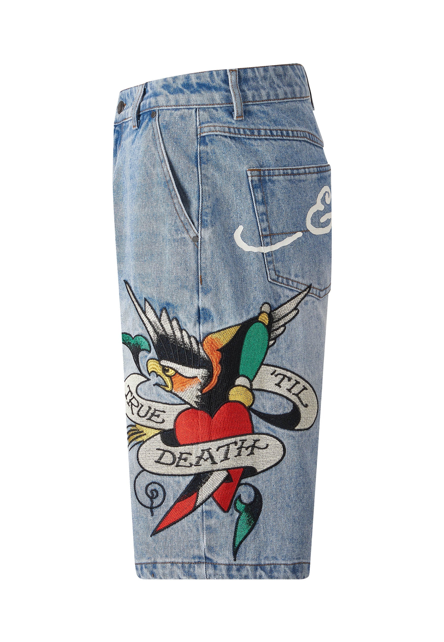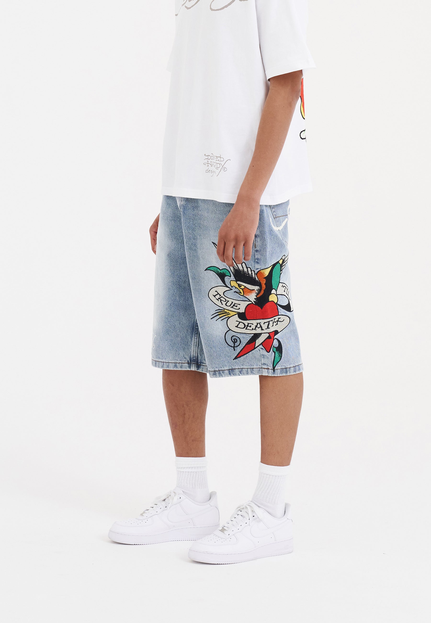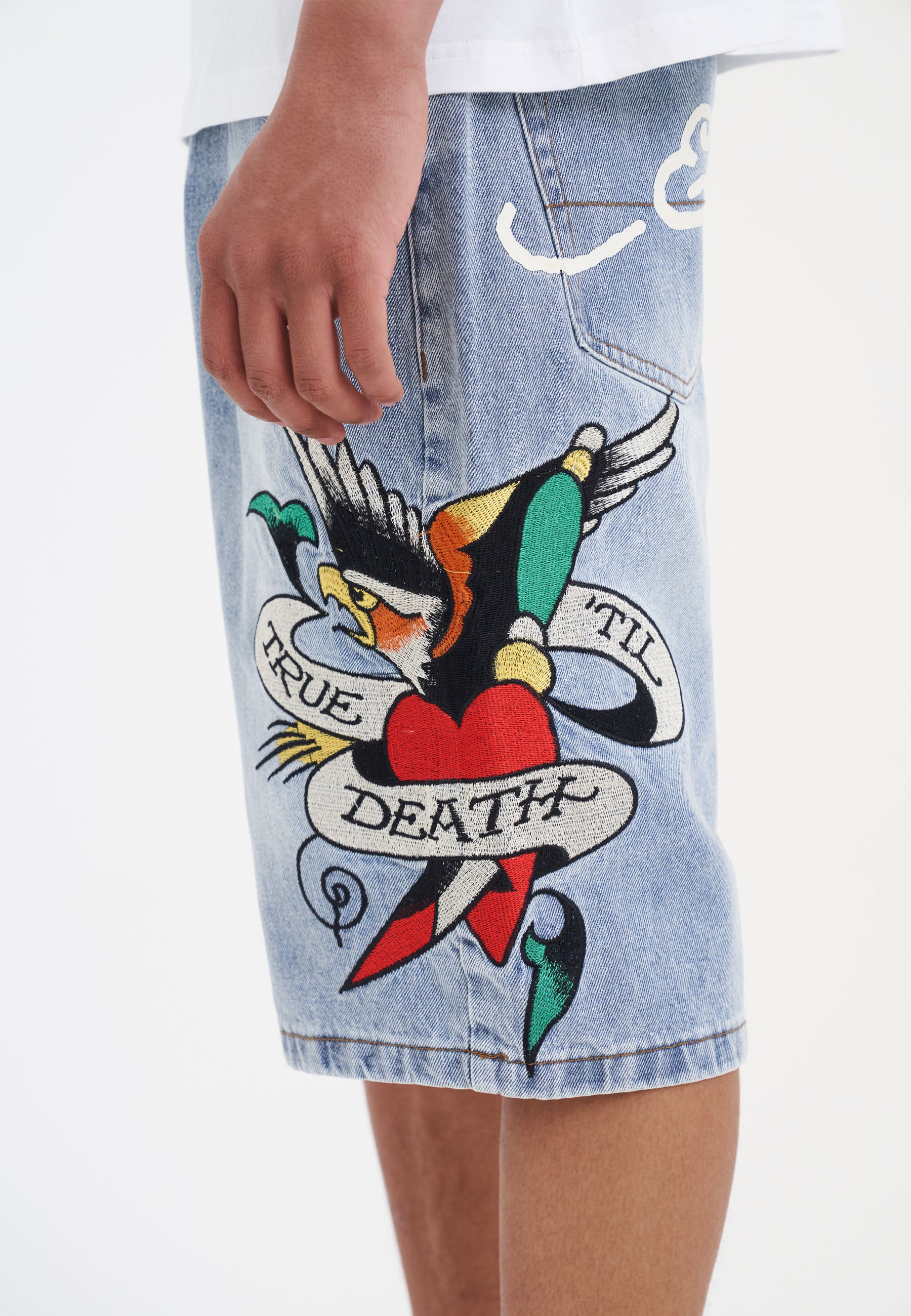 Com o logotipo branco de Ed Hardy na parte superior das costas e uma intensa tatuagem de coração de águia “TRUE TIL DEATH” bordada na perna esquerda, estes shorts casuais com lavagem alvejante são o epítome do jeans de qualidade moda urbana.
