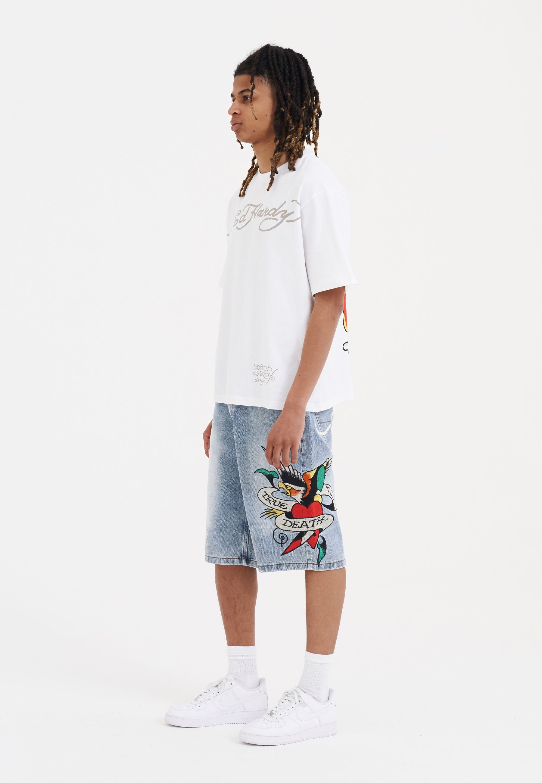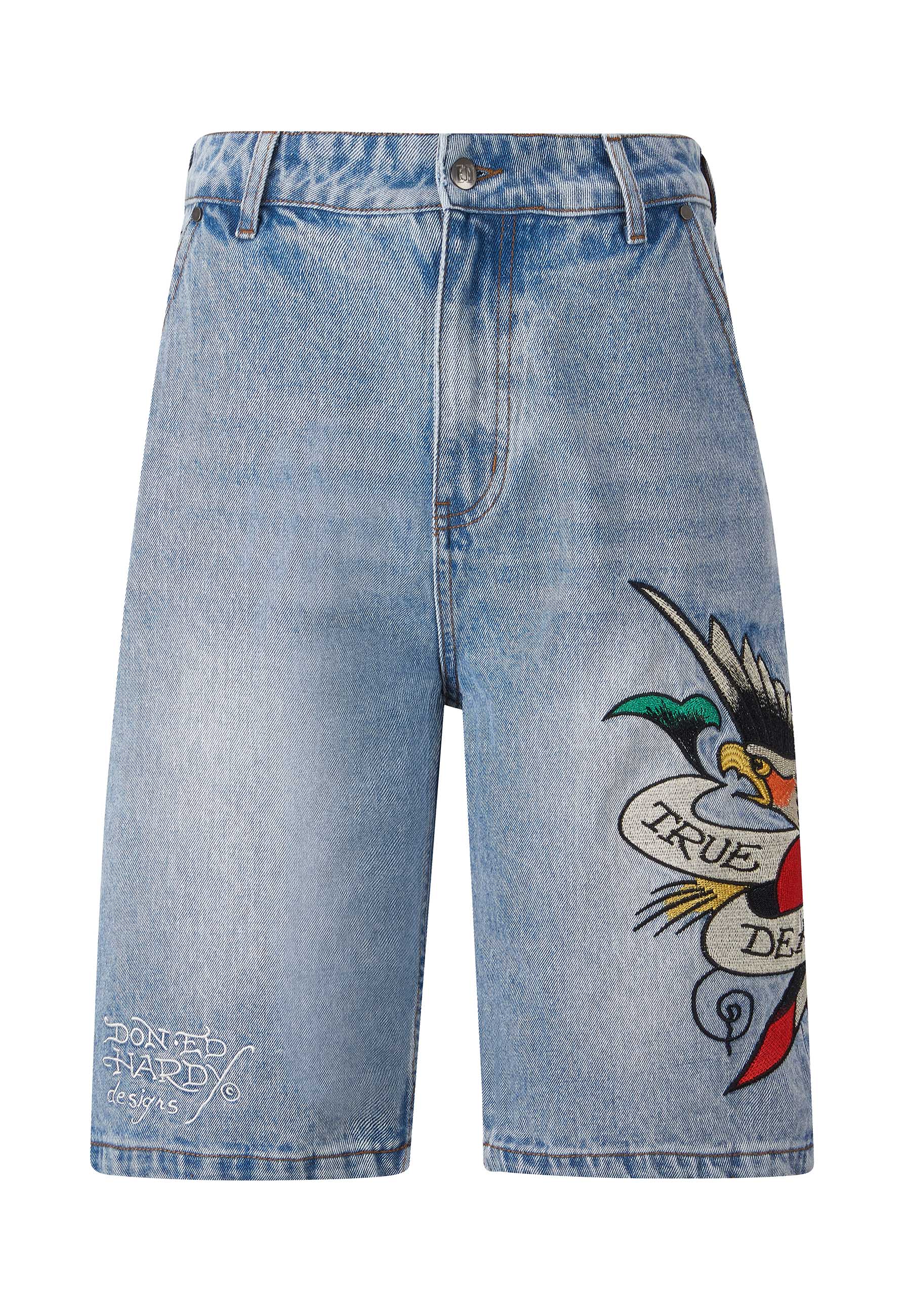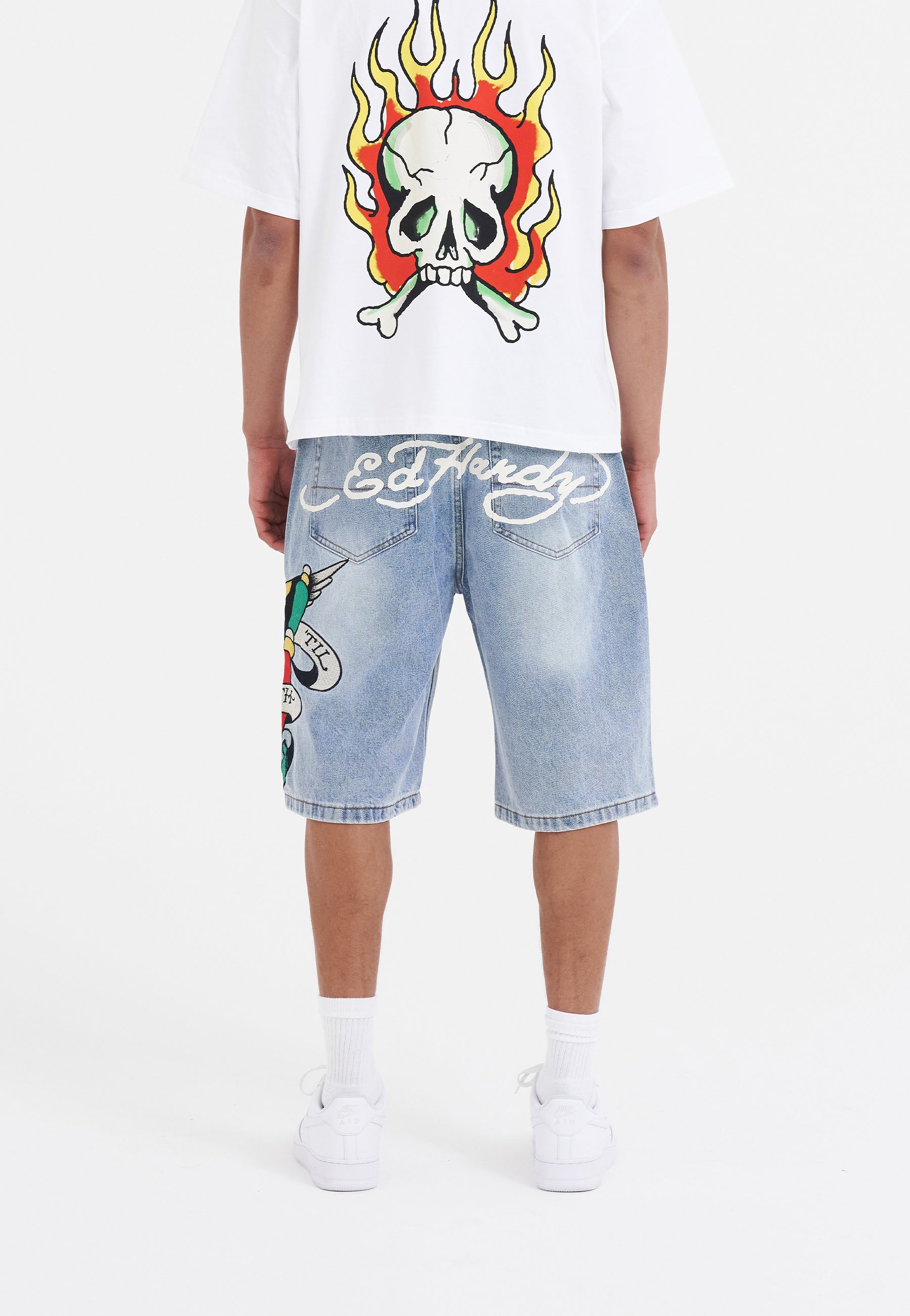 Com o logotipo branco de Ed Hardy na parte superior das costas e uma intensa tatuagem de coração de águia “TRUE TIL DEATH” bordada na perna esquerda, estes shorts casuais com lavagem alvejante são o epítome do jeans de qualidade moda urbana.