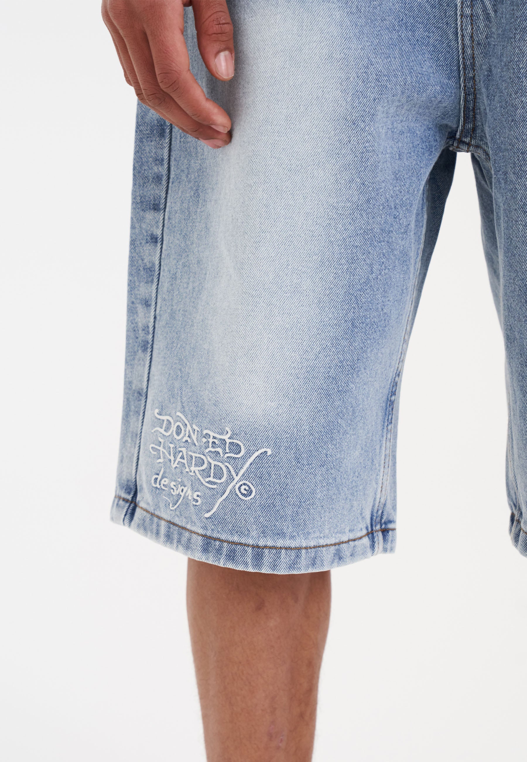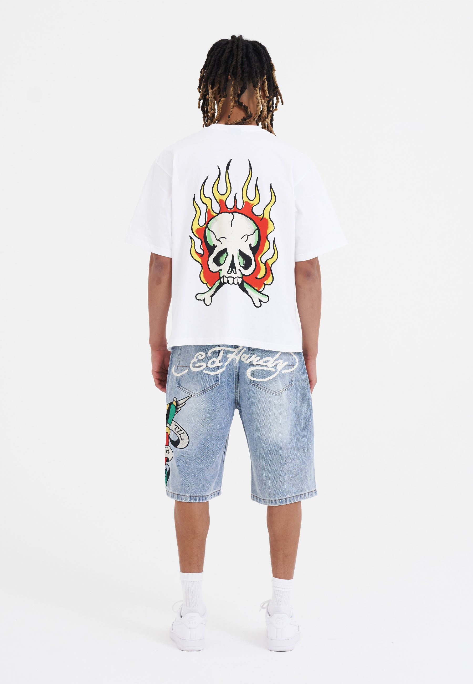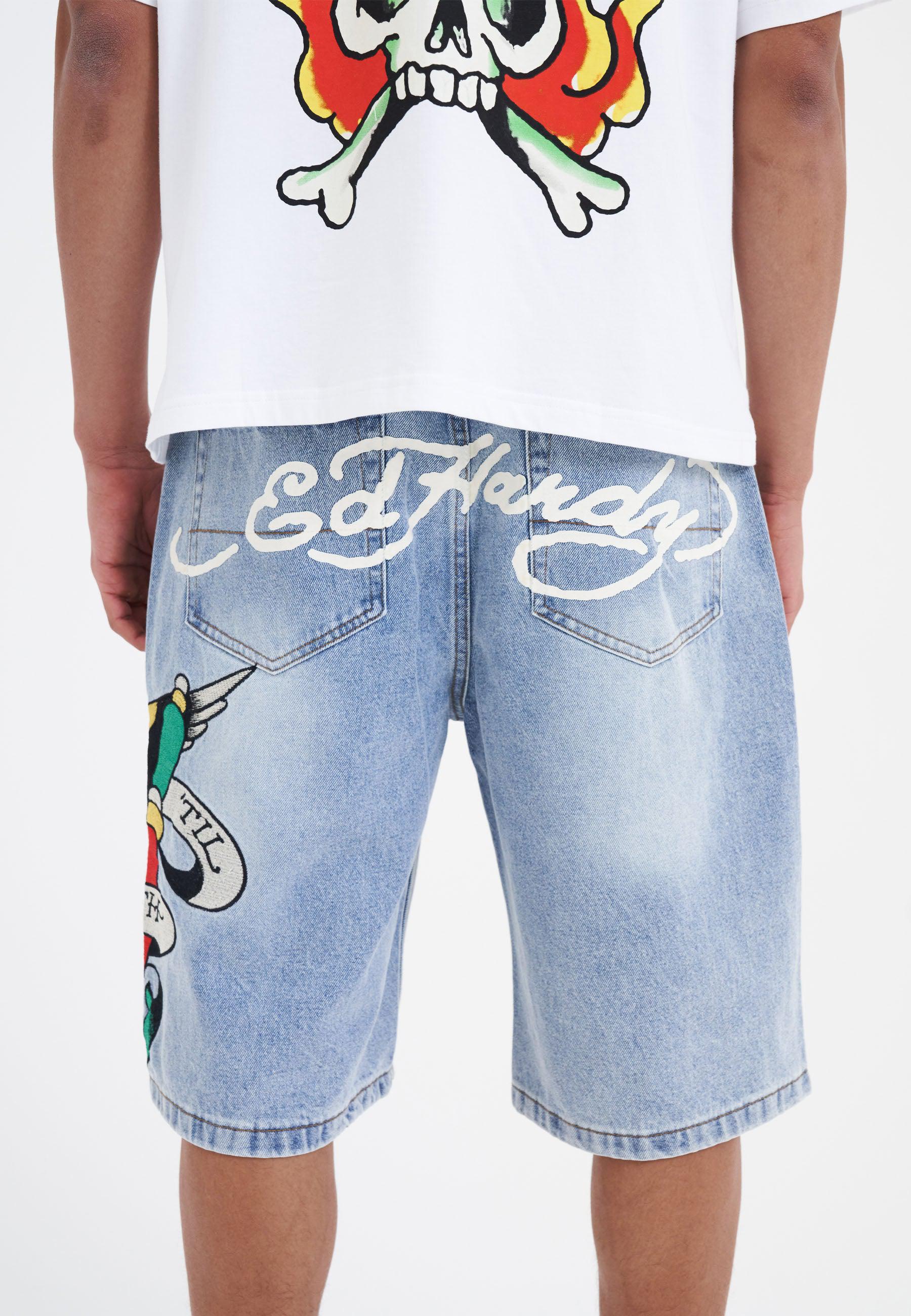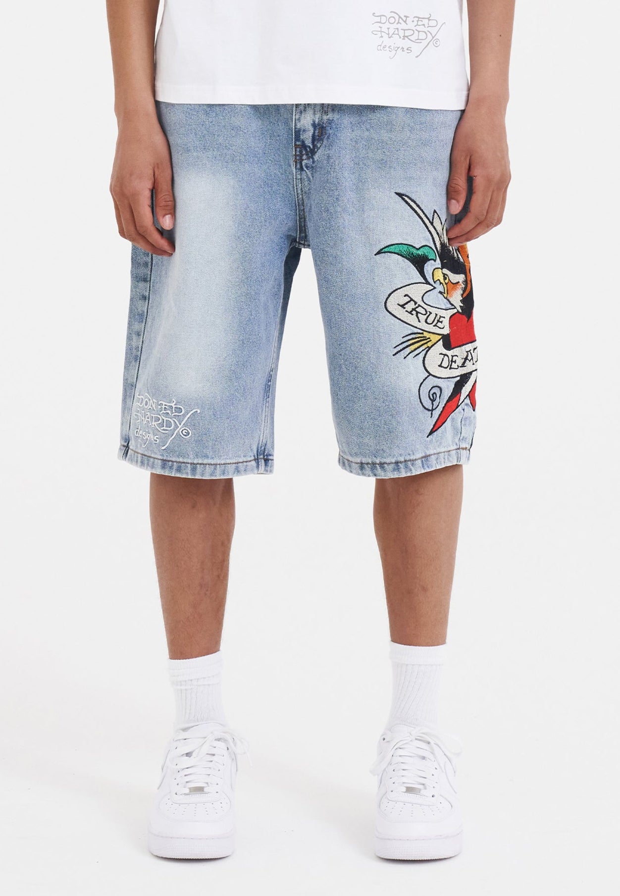Com o logotipo branco de Ed Hardy na parte superior das costas e uma intensa tatuagem de coração de águia “TRUE TIL DEATH” bordada na perna esquerda, estes shorts casuais com lavagem alvejante são o epítome do jeans de qualidade moda urbana.