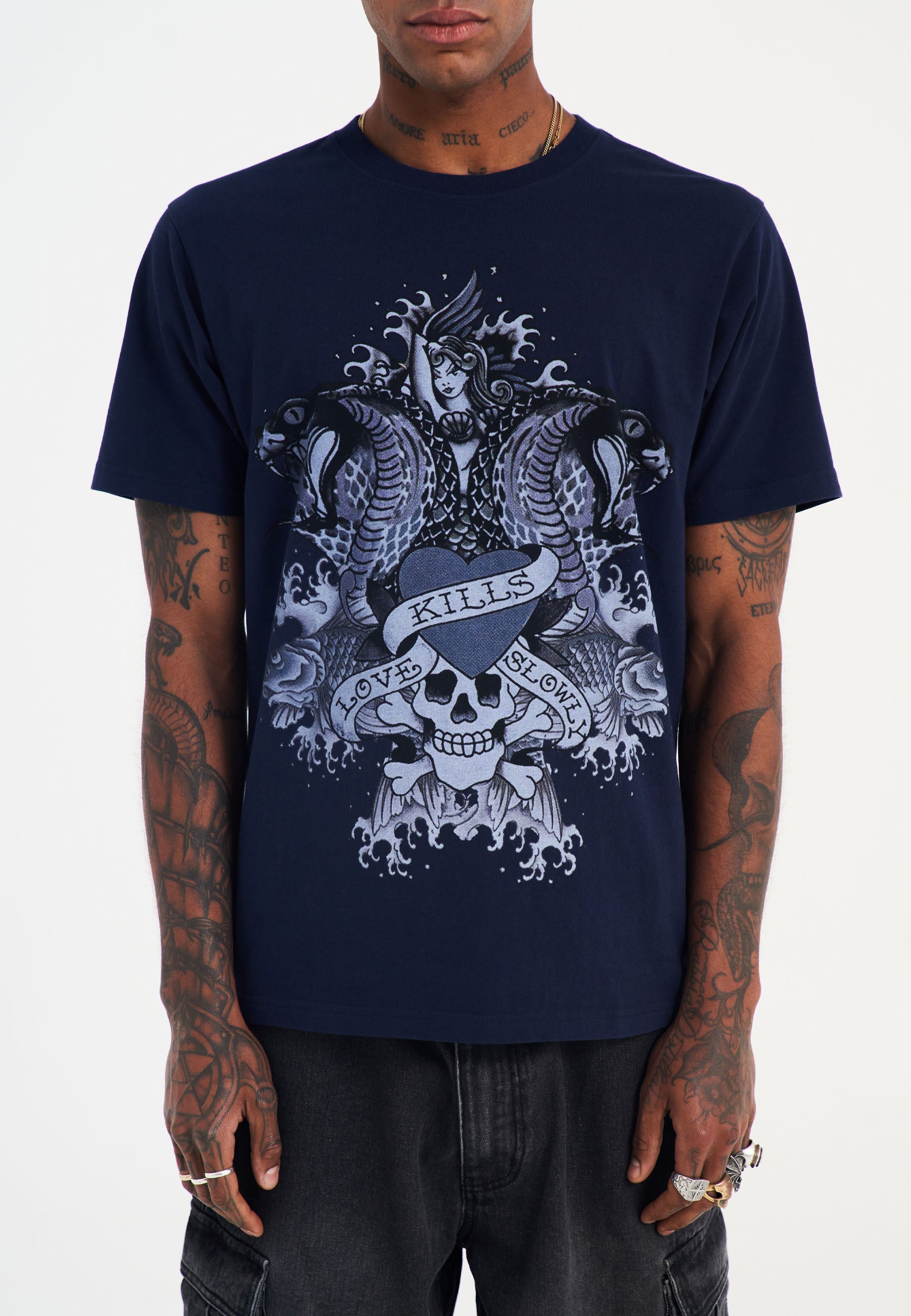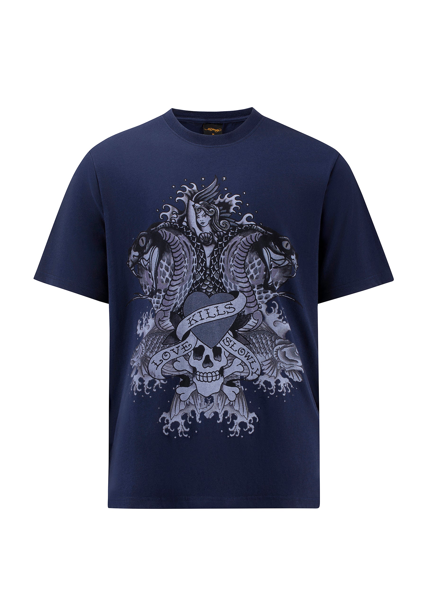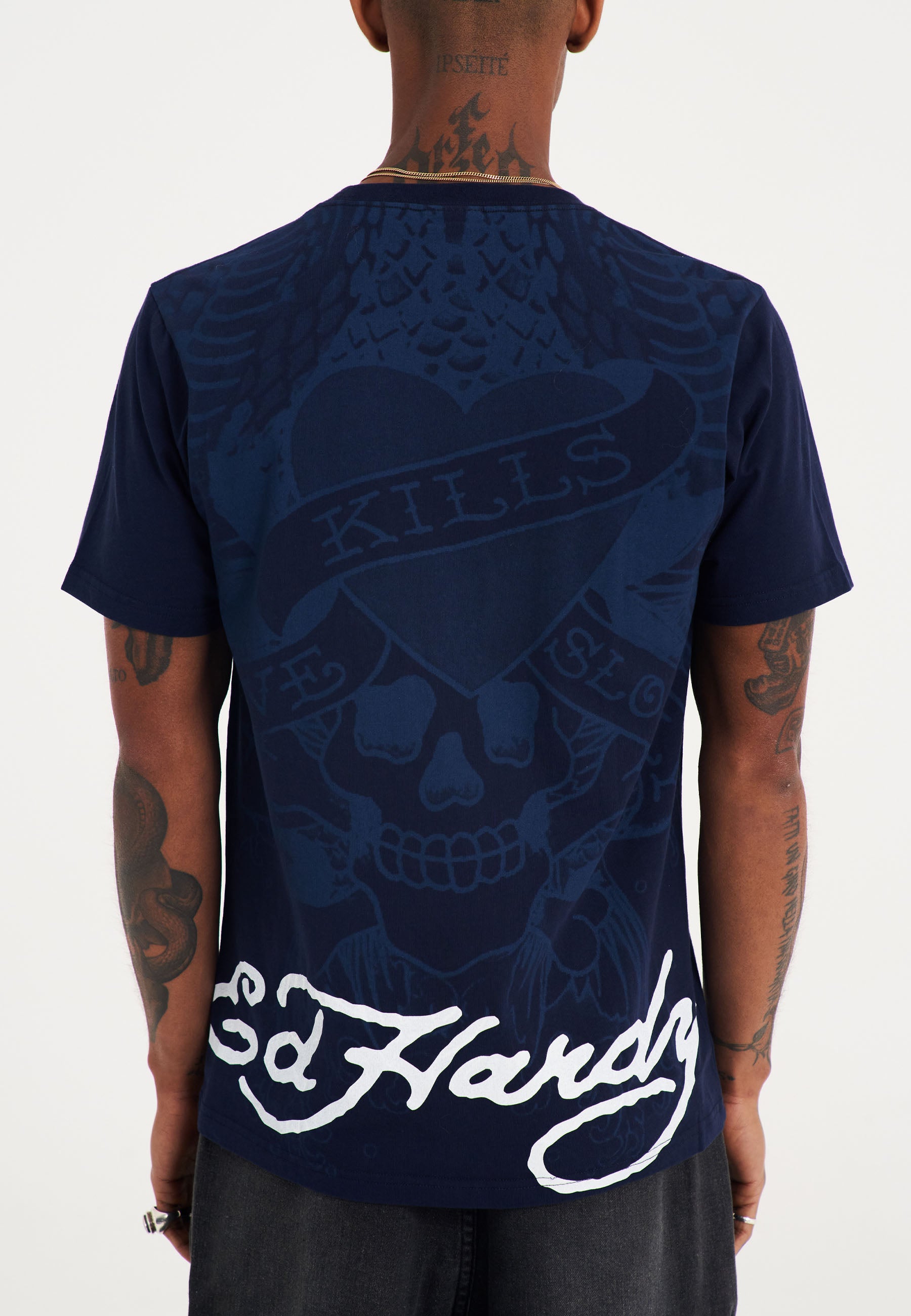 Make a statement with the Men's Cobra Kills Slowly Graphic T-Shirt in dark navy blue. This regular-fit t-shirt features Ed Hardy’s bold tonal cobra graphic on the front, with a subtle shadow print and signature logo on the back hem.