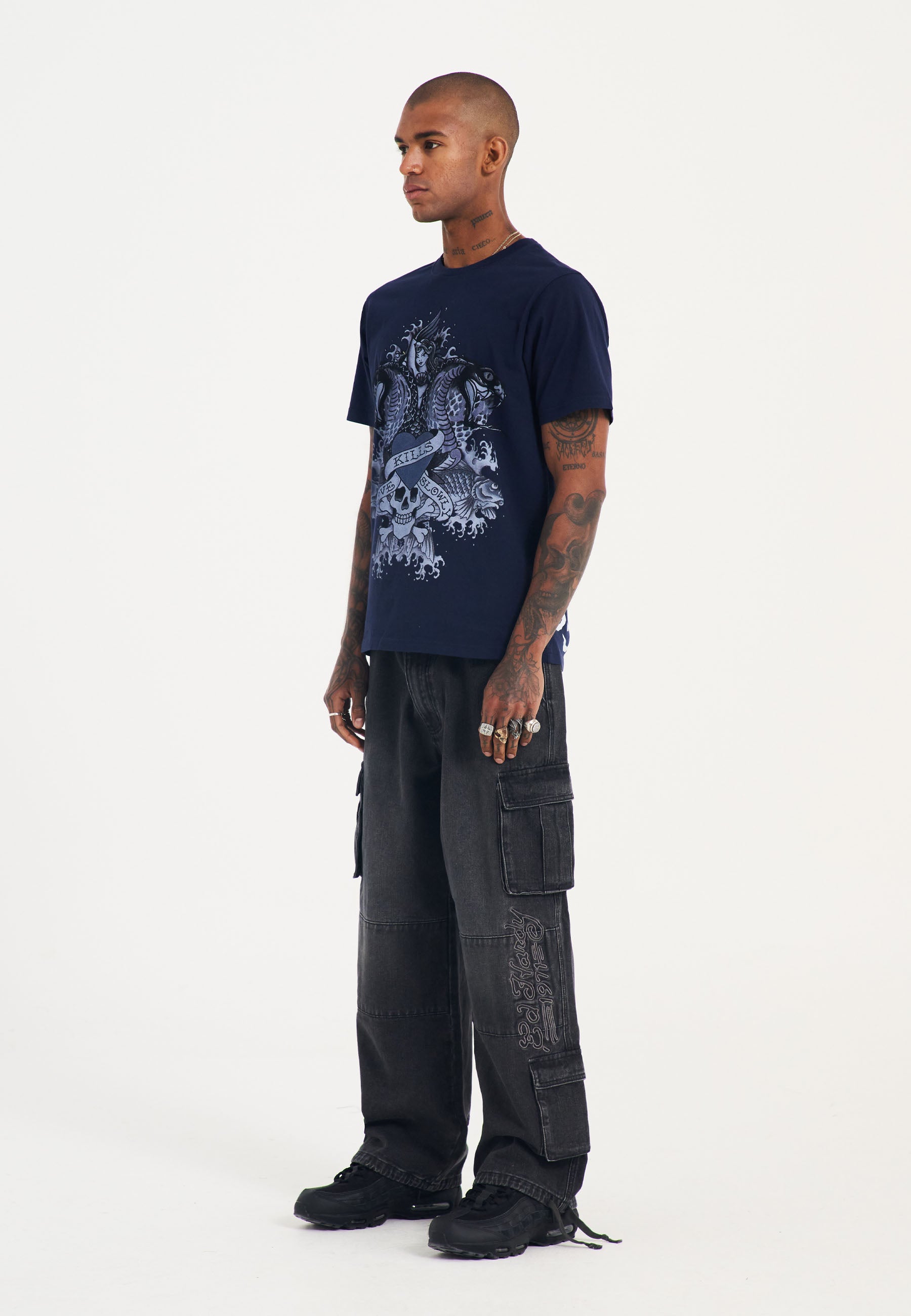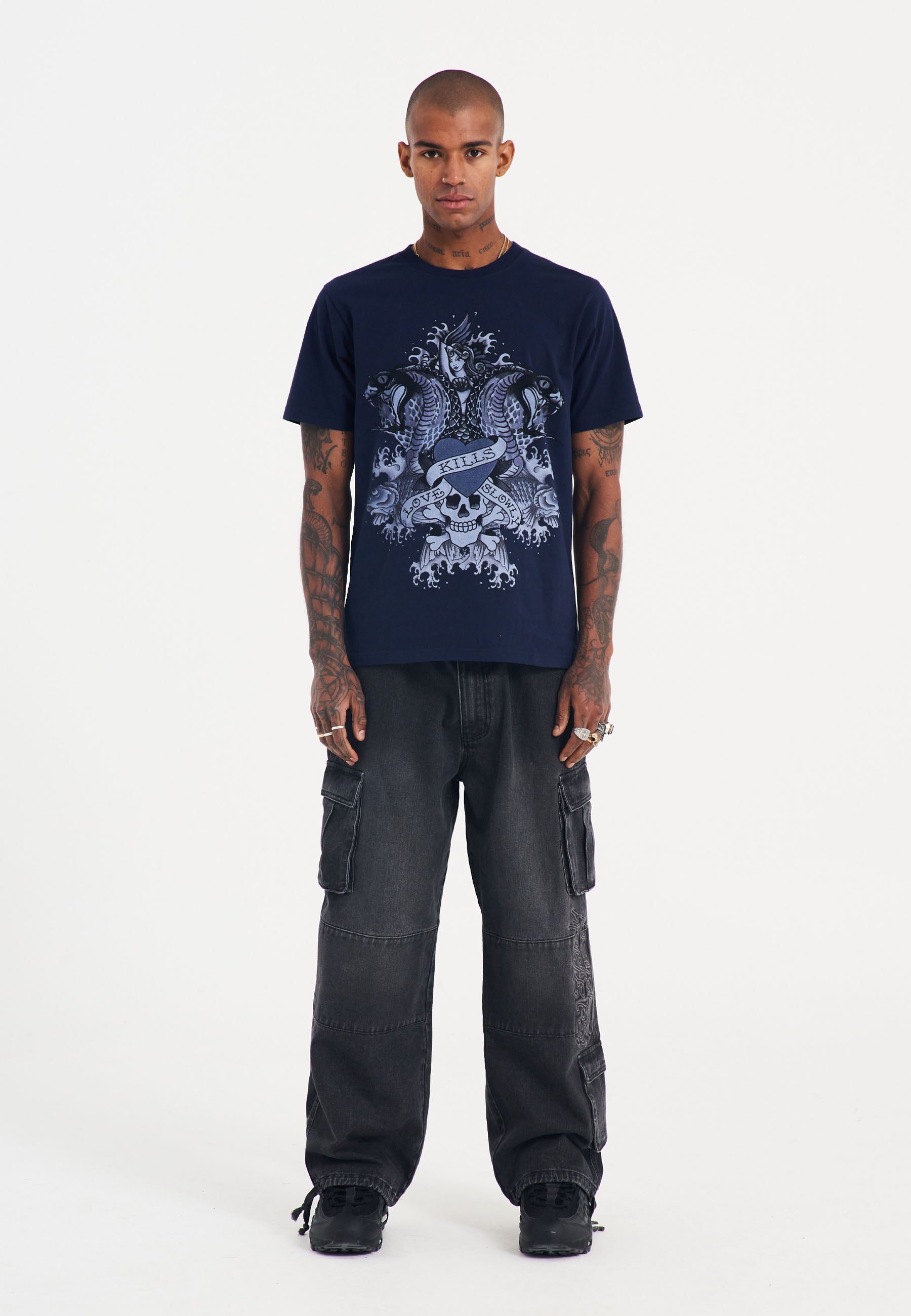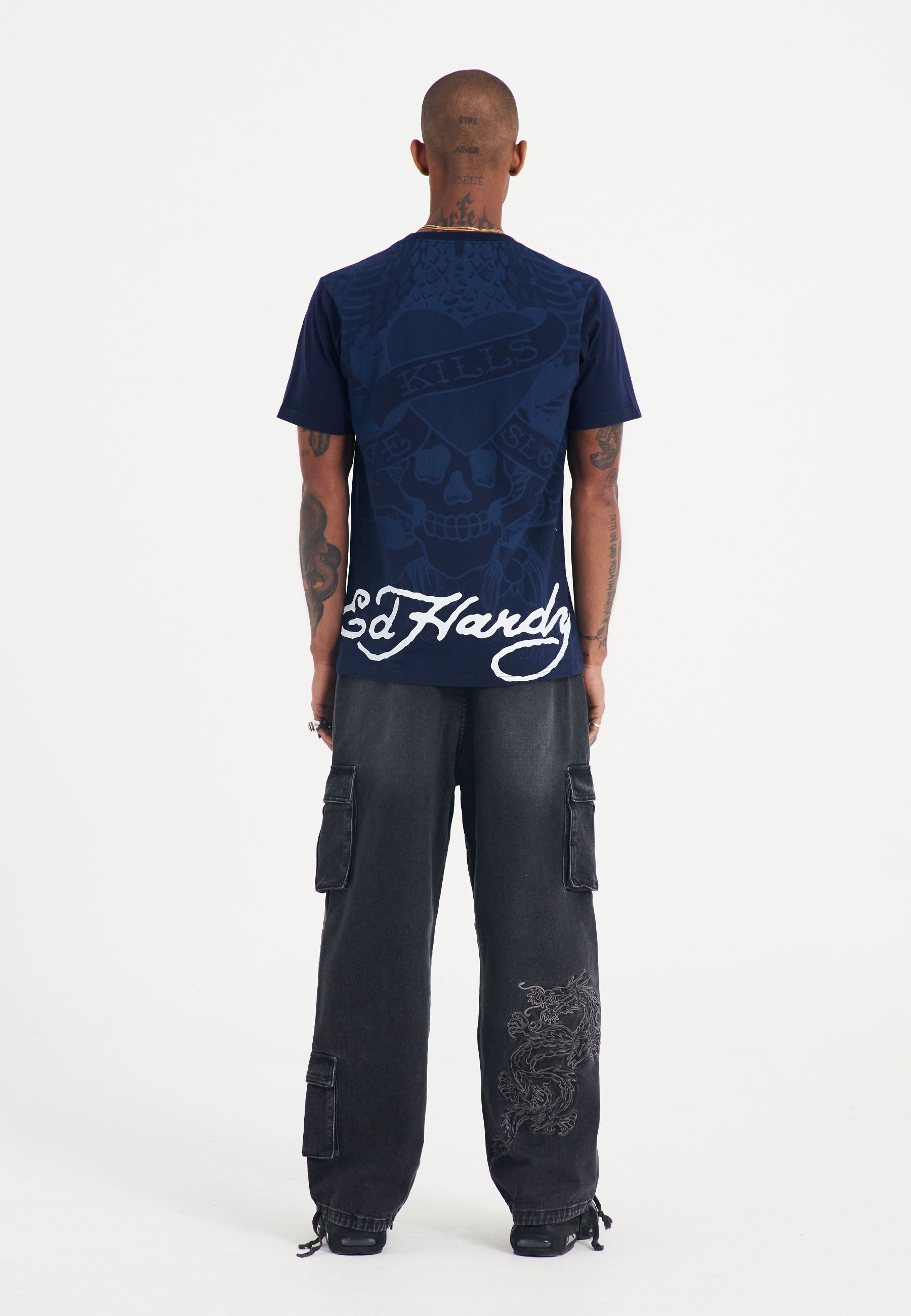 Make a statement with the Men's Cobra Kills Slowly Graphic T-Shirt in dark navy blue. This regular-fit t-shirt features Ed Hardy’s bold tonal cobra graphic on the front, with a subtle shadow print and signature logo on the back hem.