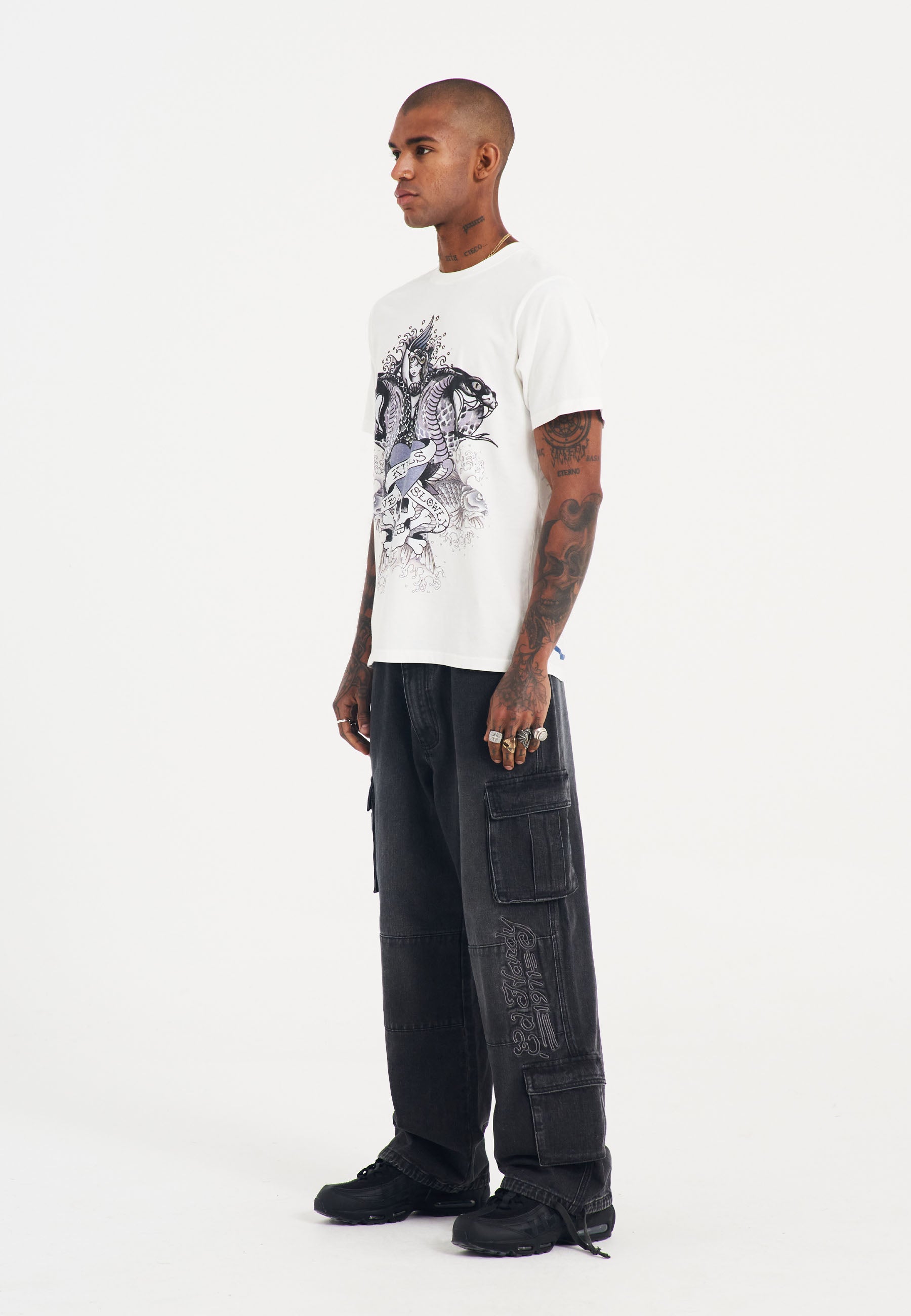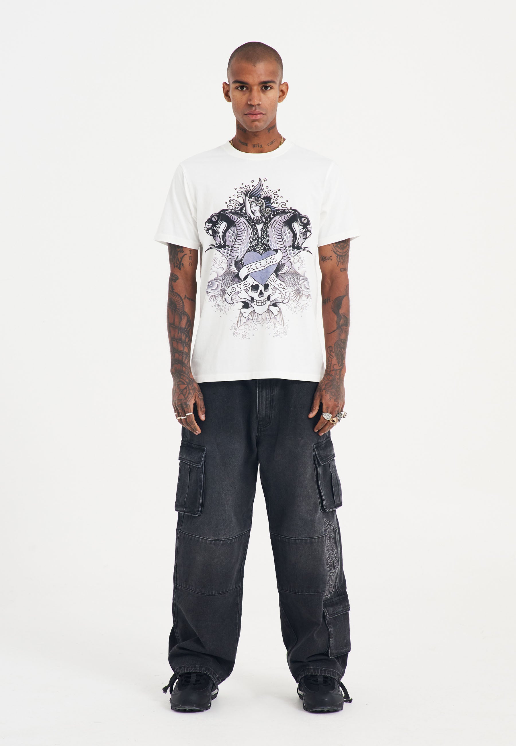 Make a statement with the Men's Cobra Kills Slowly Graphic T-Shirt in white. This regular-fit t-shirt features Ed Hardy’s bold tonal cobra graphic on the front, with a subtle shadow print and signature logo on the back hem.