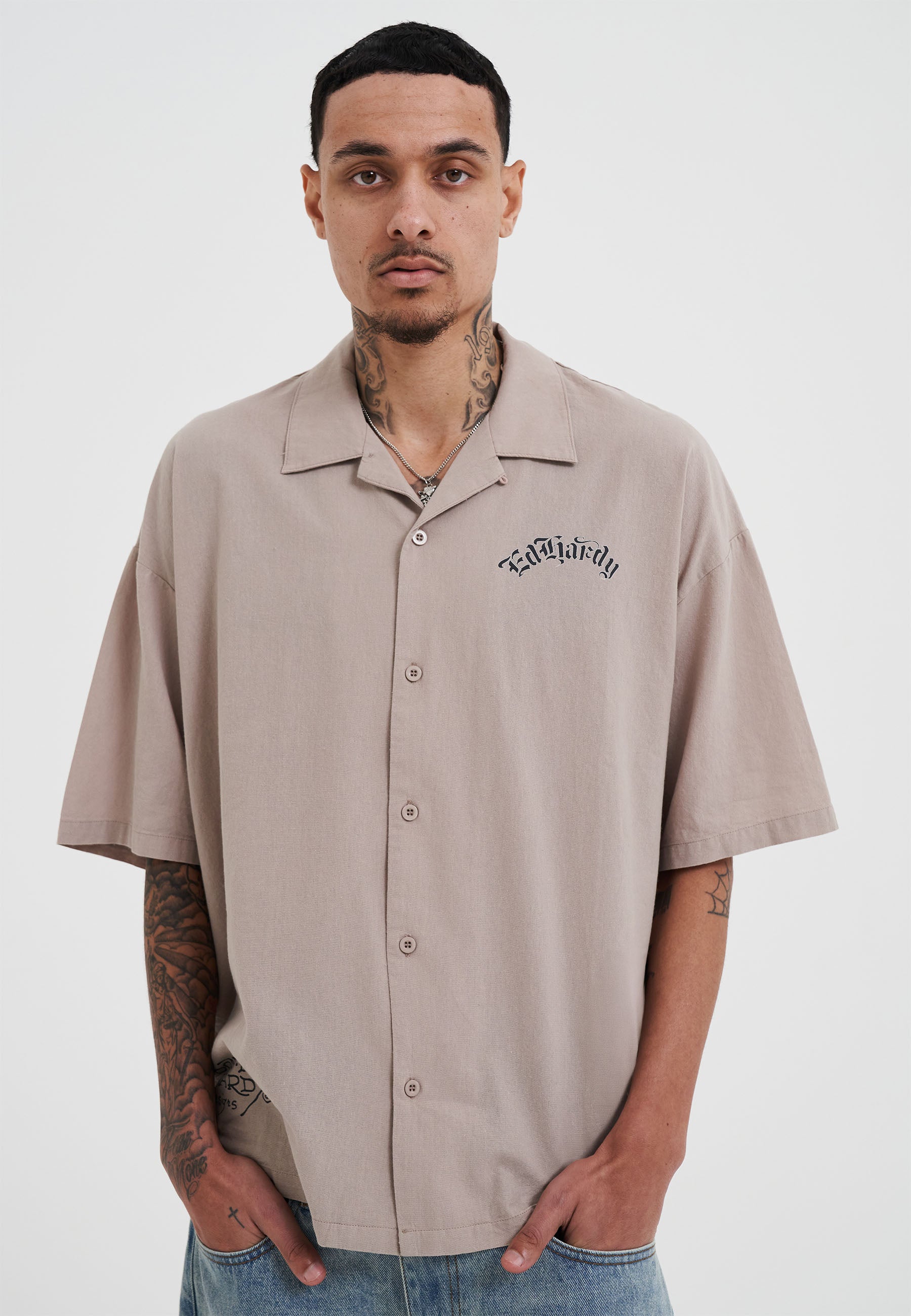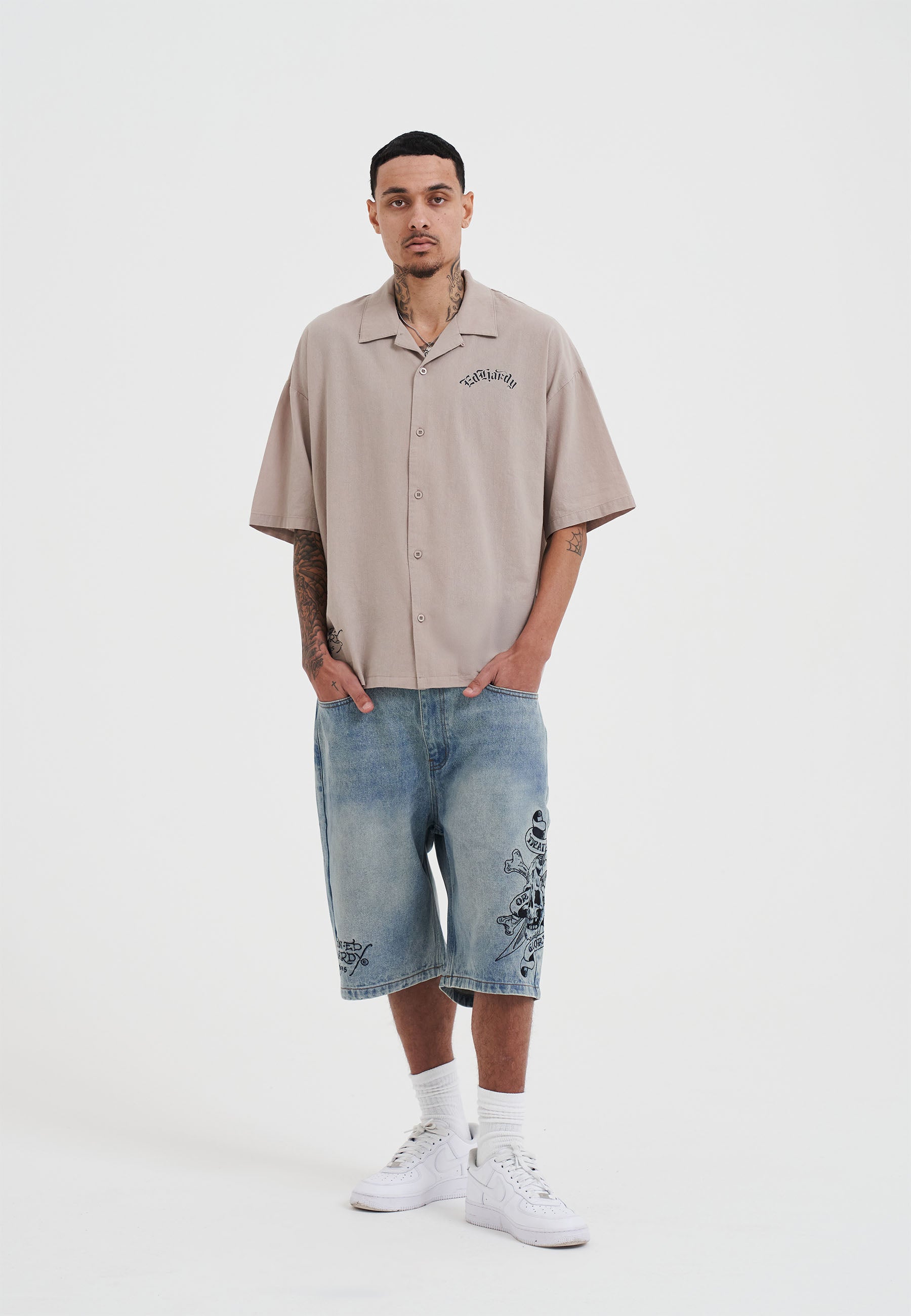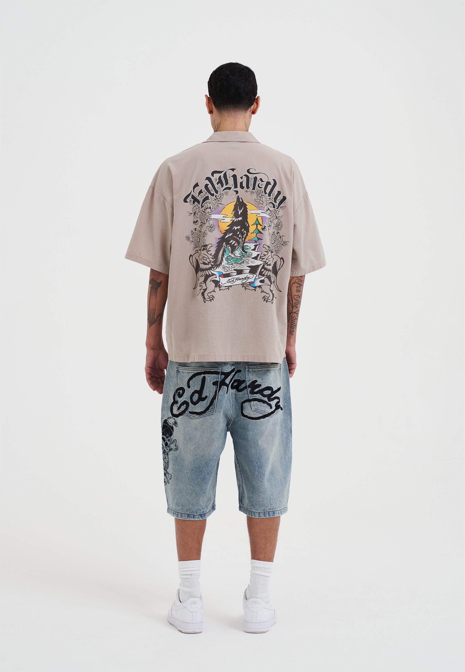 Mens Don Wolf Dragon Printed Camp Shirt - Ecru