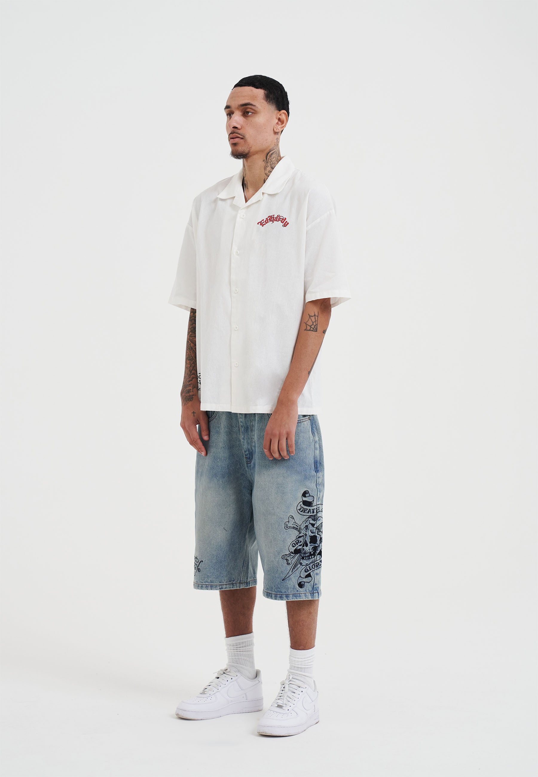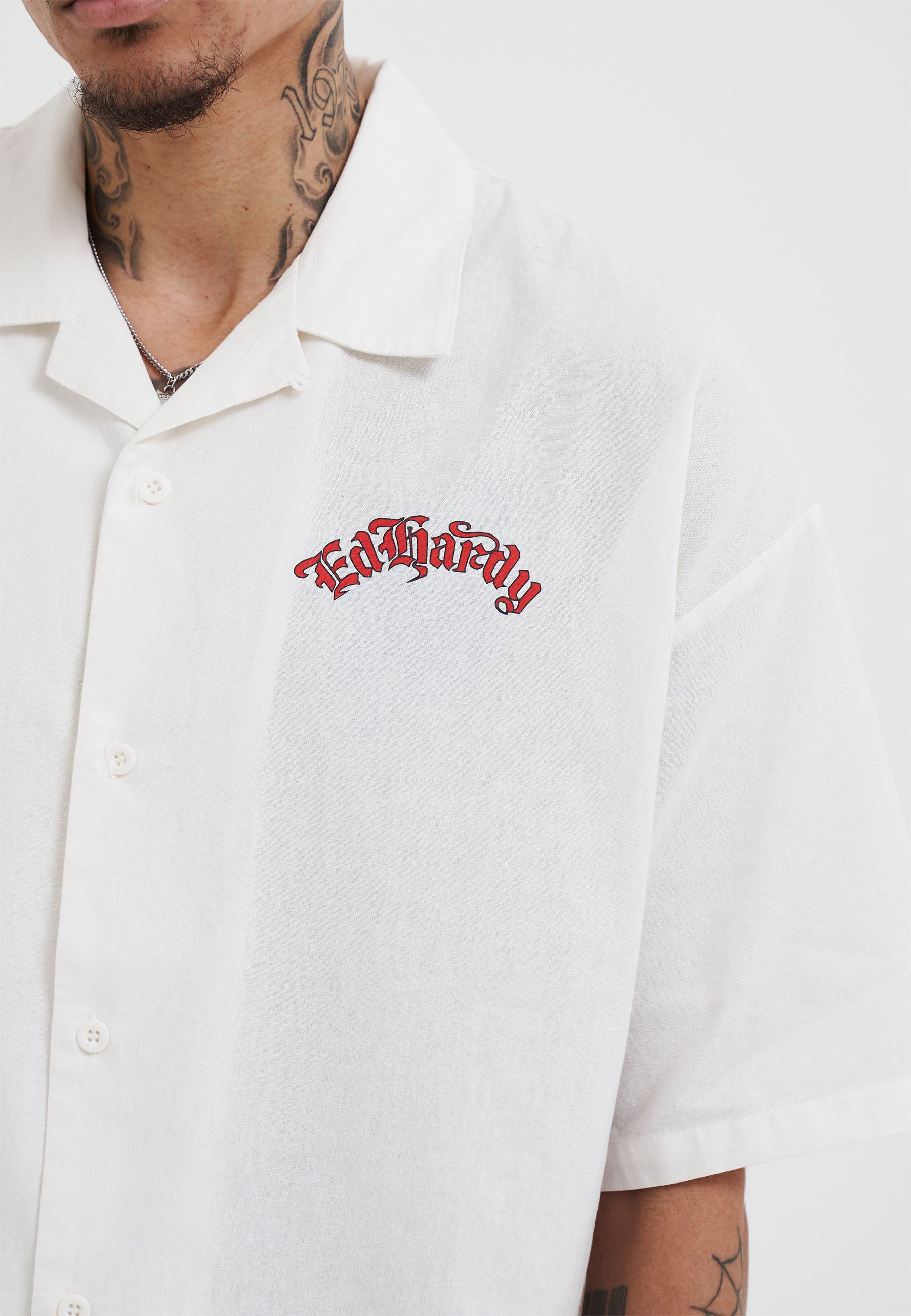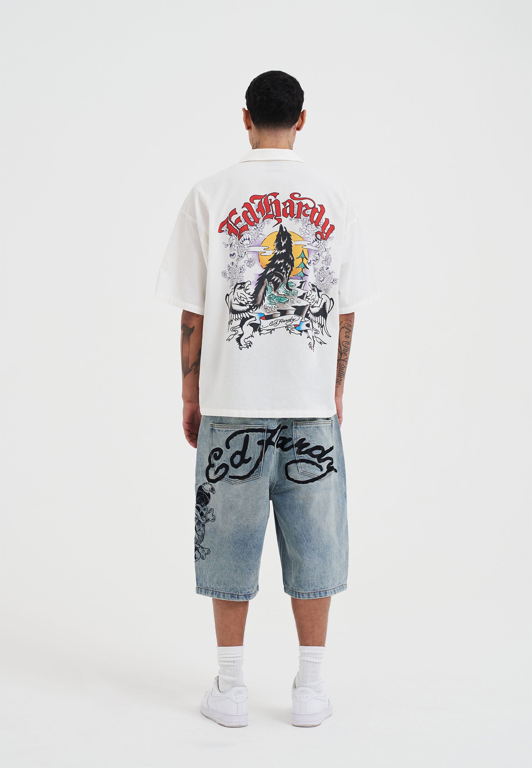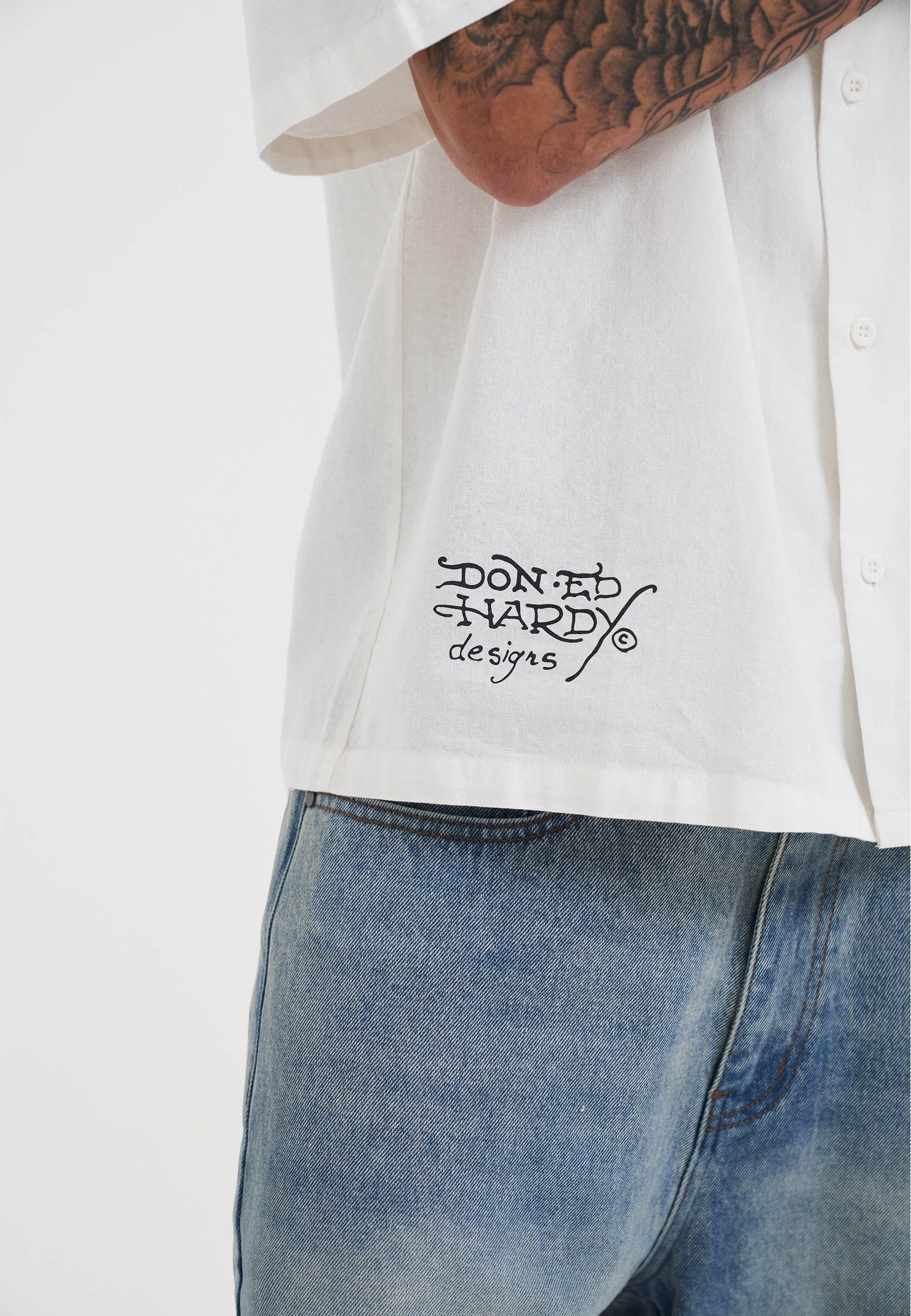 Mens Don Wolf Dragon Printed Camp Shirt - White