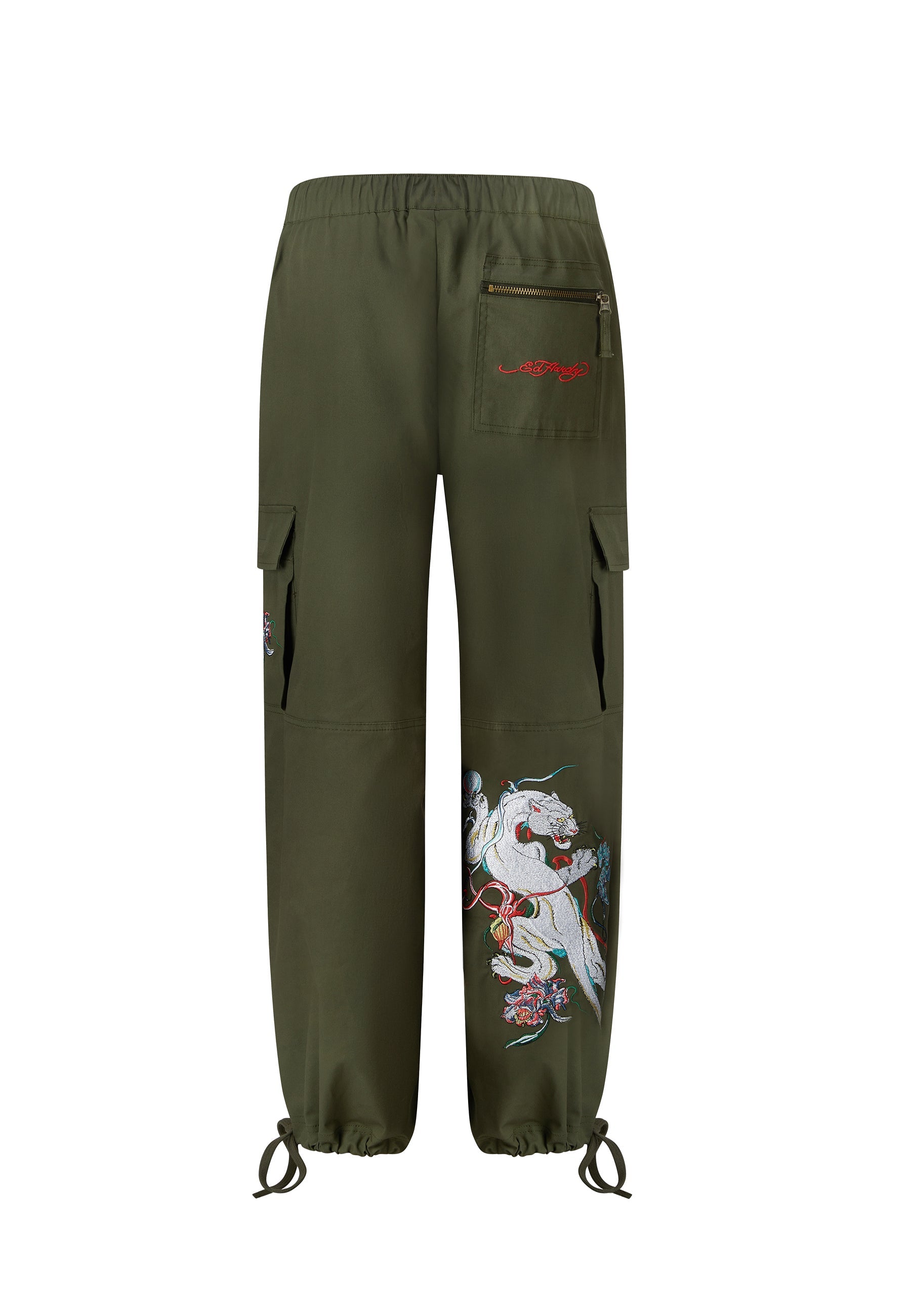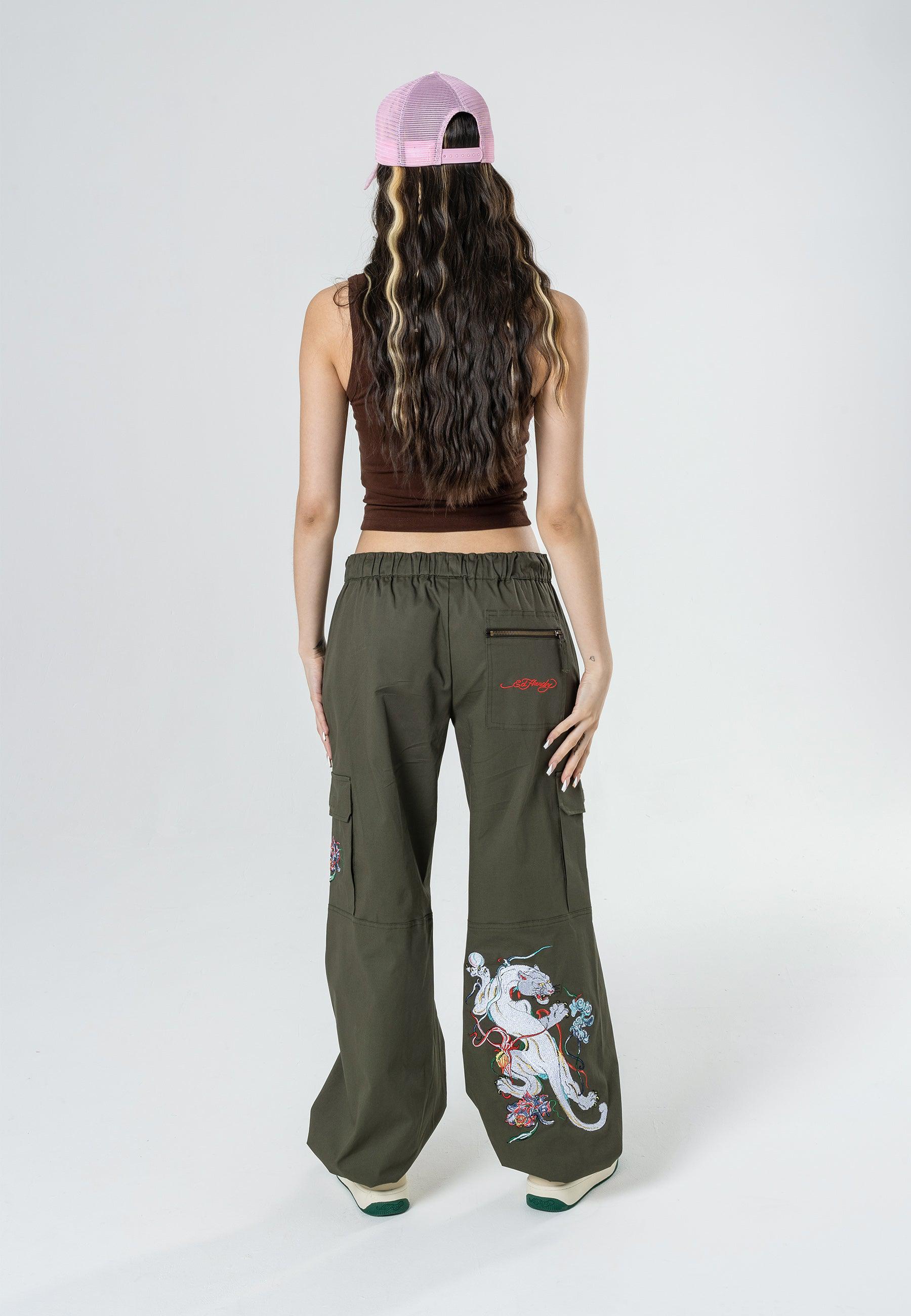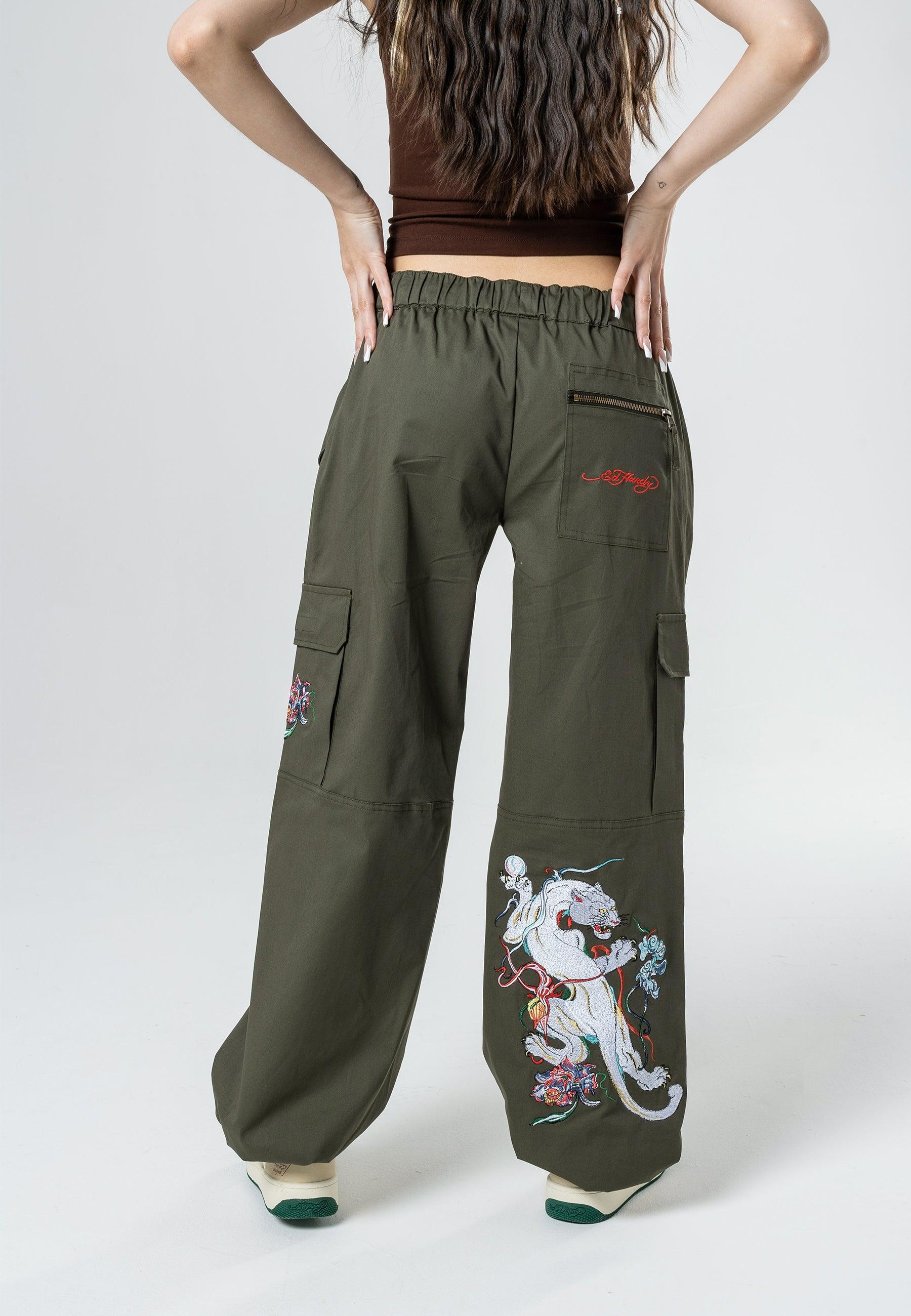 Mystic Panther Cargo Pant-Dusty Olive apresenta o infame arquivo Eds de Pantera bordada em alta definição na parte inferior da perna direita que vem para a frente, bem como o logotipo Ed Hardy bordado no bolso traseiro com zíper e bordado floral no bolso esquerdo. Essas calças cargos confortáveis são perfeitas para climas frios, diurnos e noturnos.