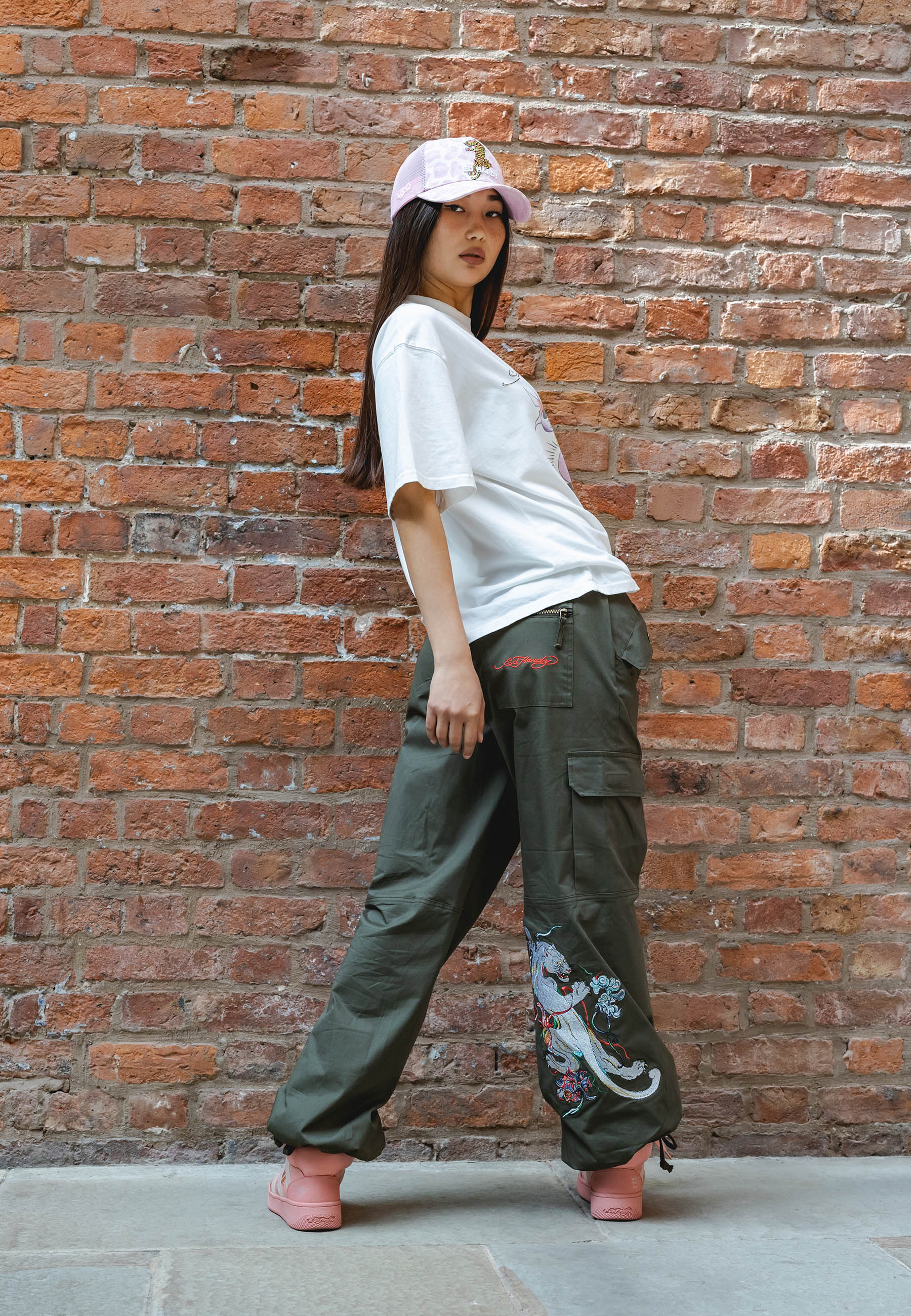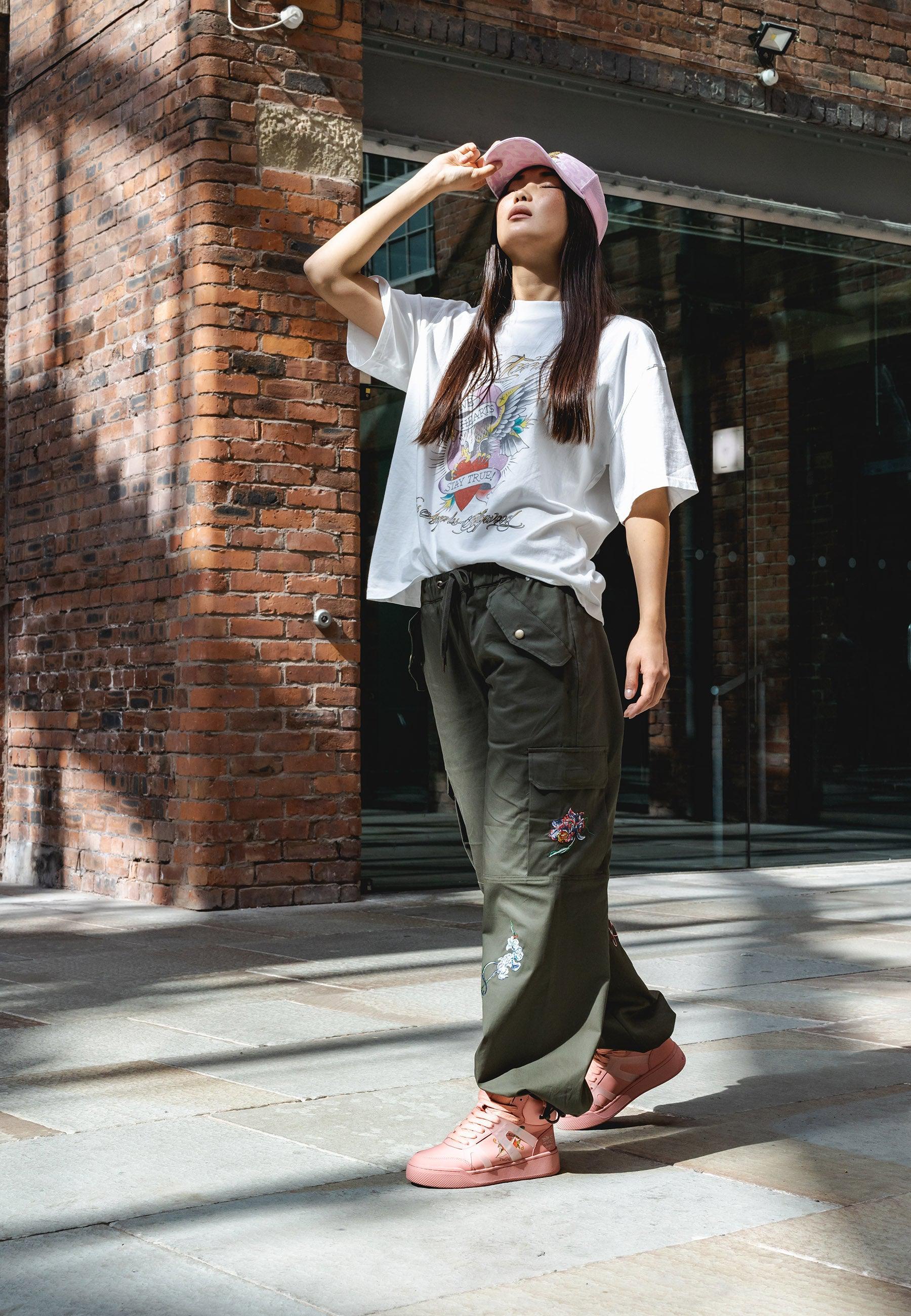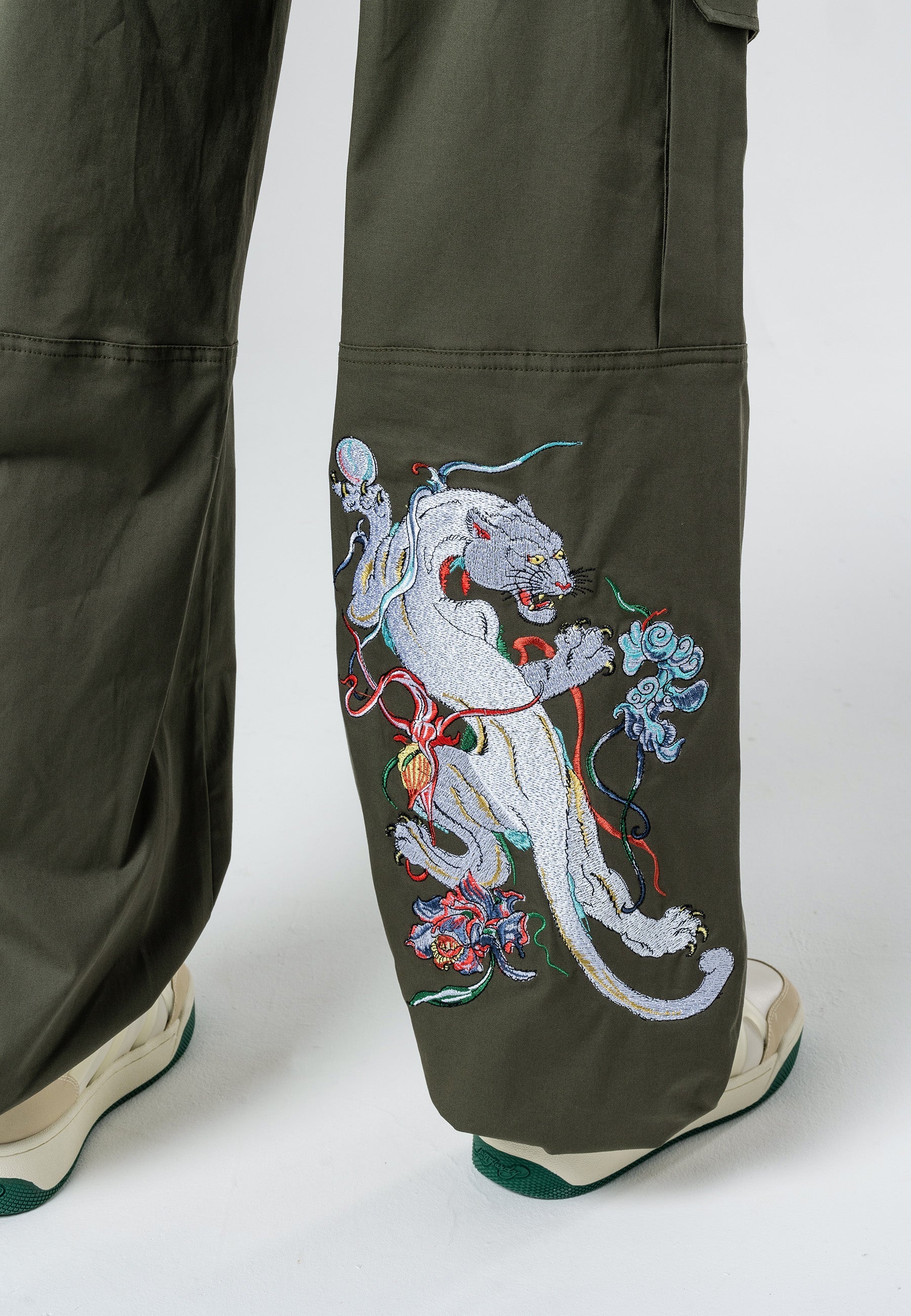 Mystic Panther Cargo Pant-Dusty Olive apresenta o infame arquivo Eds de Pantera bordada em alta definição na parte inferior da perna direita que vem para a frente, bem como o logotipo Ed Hardy bordado no bolso traseiro com zíper e bordado floral no bolso esquerdo. Essas calças cargos confortáveis são perfeitas para climas frios, diurnos e noturnos.