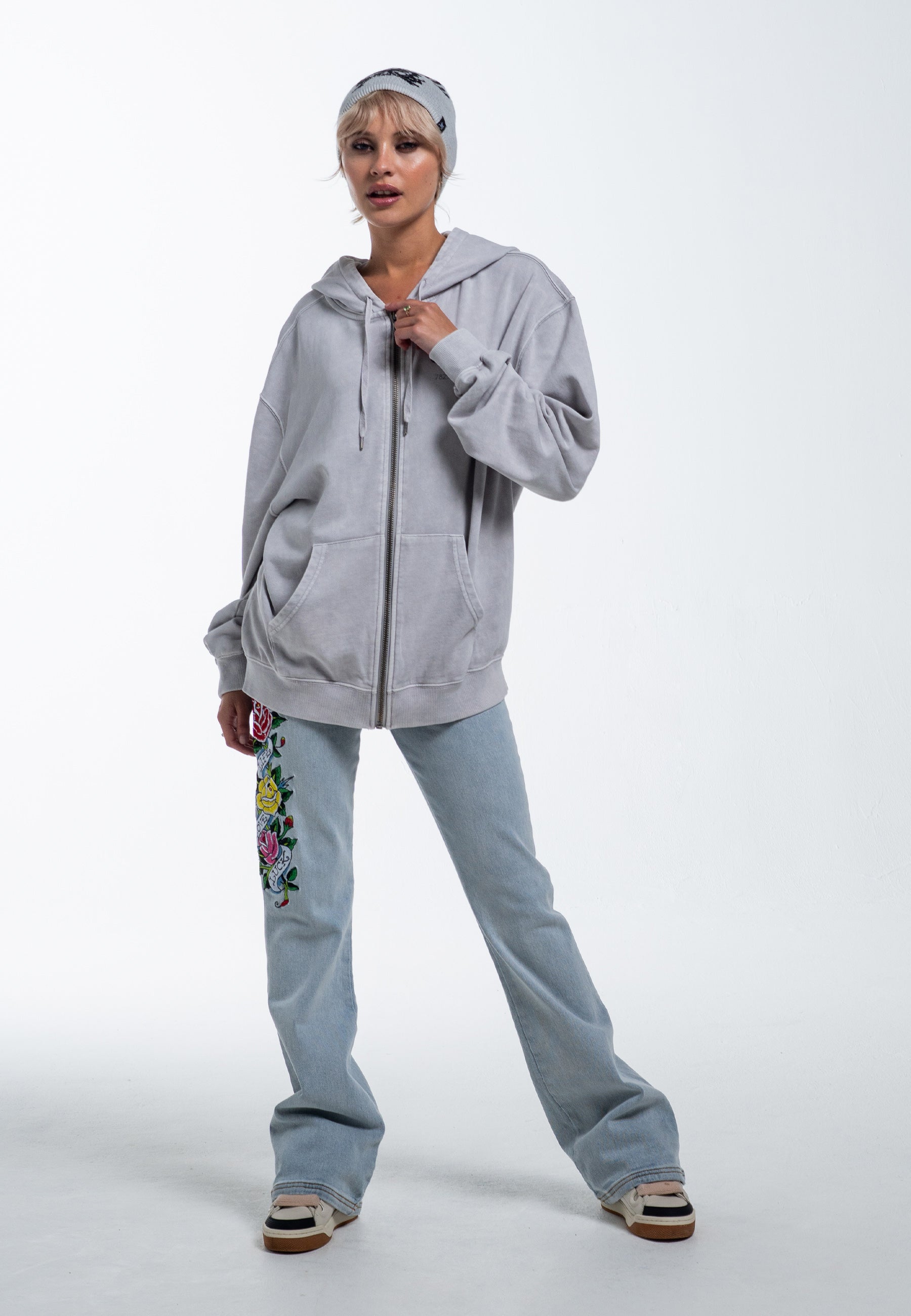 Moletom feminino com capuz e zíper de caveira flamejante monoácido - cinza