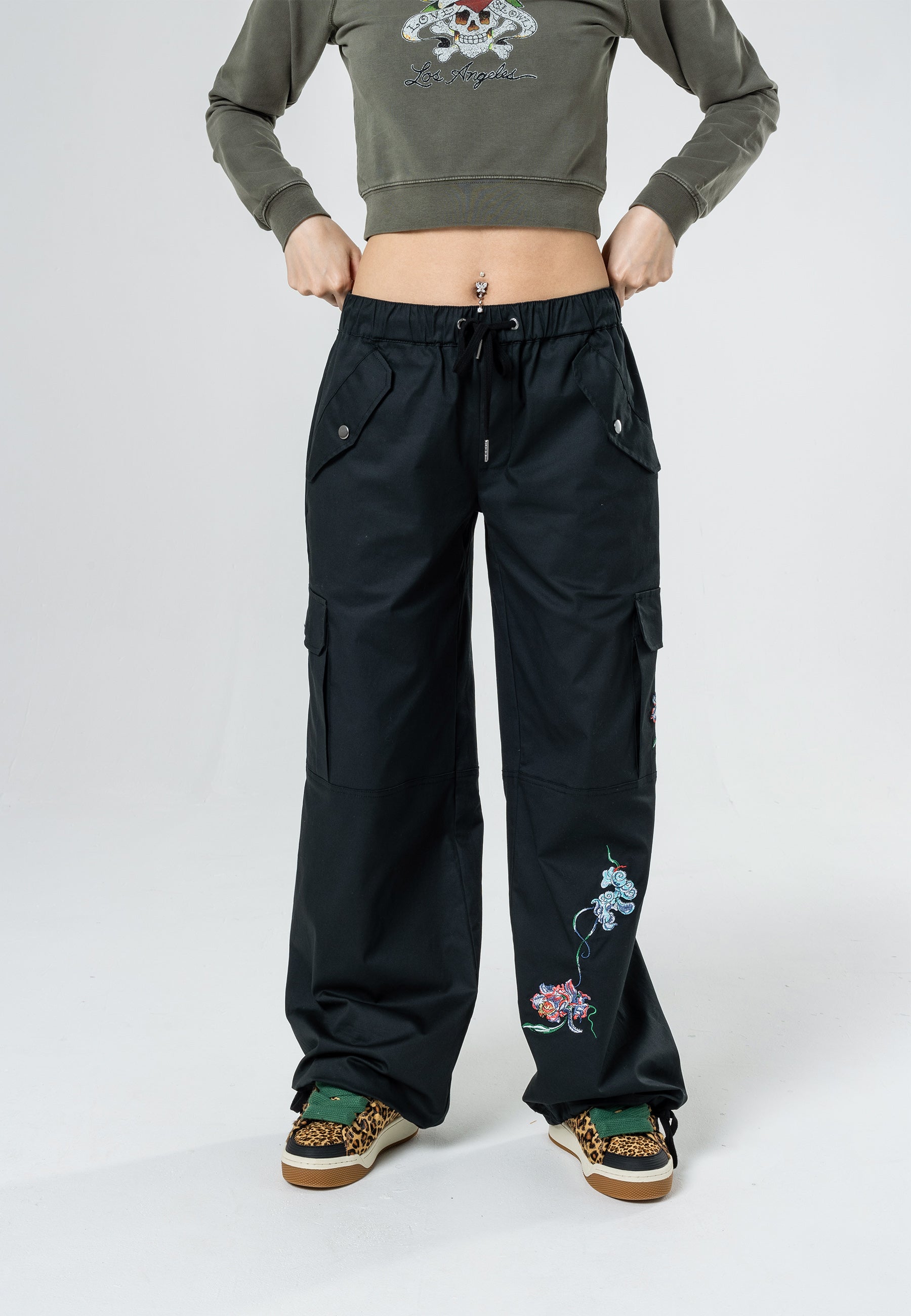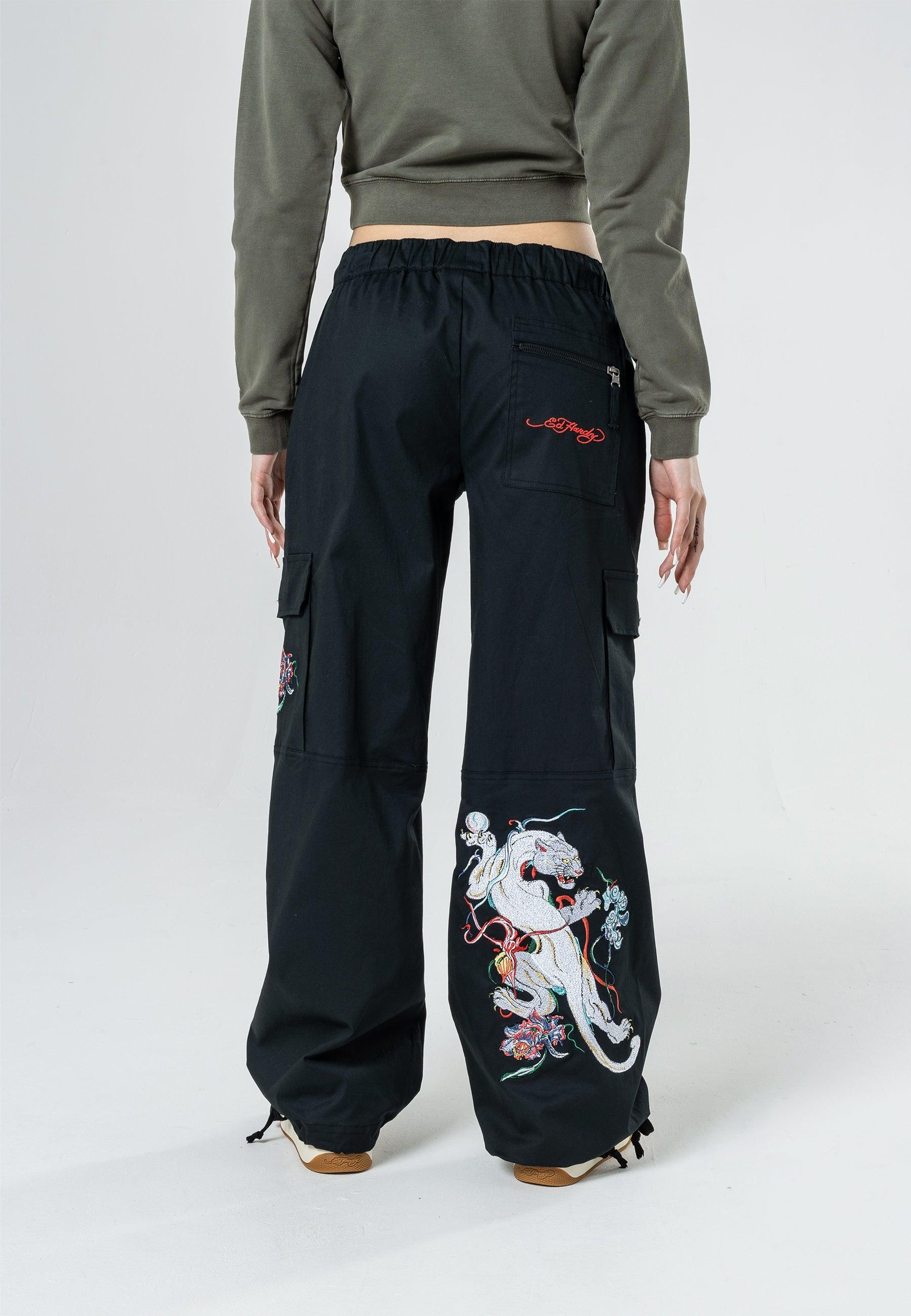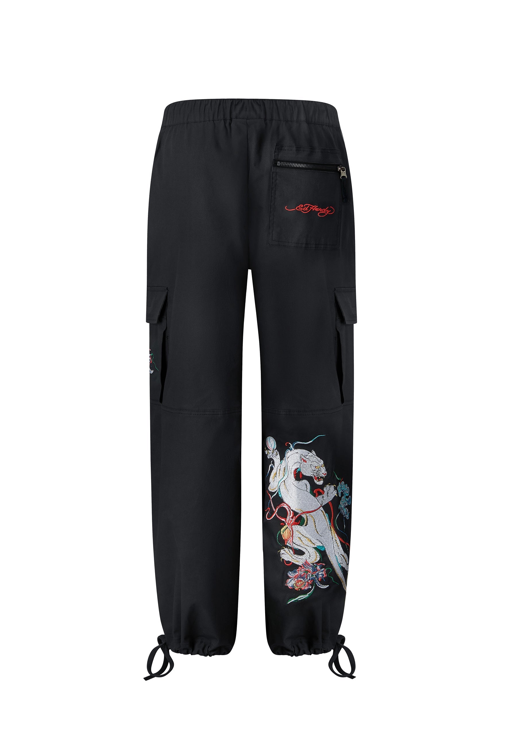Mystic Panther Cargo Pant-Washed Black apresenta o infame arquivo Eds de Panther bordado em alta definição na parte inferior da perna direita traseira que vem para a frente, bem como o logotipo Ed Hardy bordado no bolso traseiro com zíper e bordado floral no bolso esquerdo. Essas calças cargos confortáveis são perfeitas para climas frios, diurnos e noturnos.