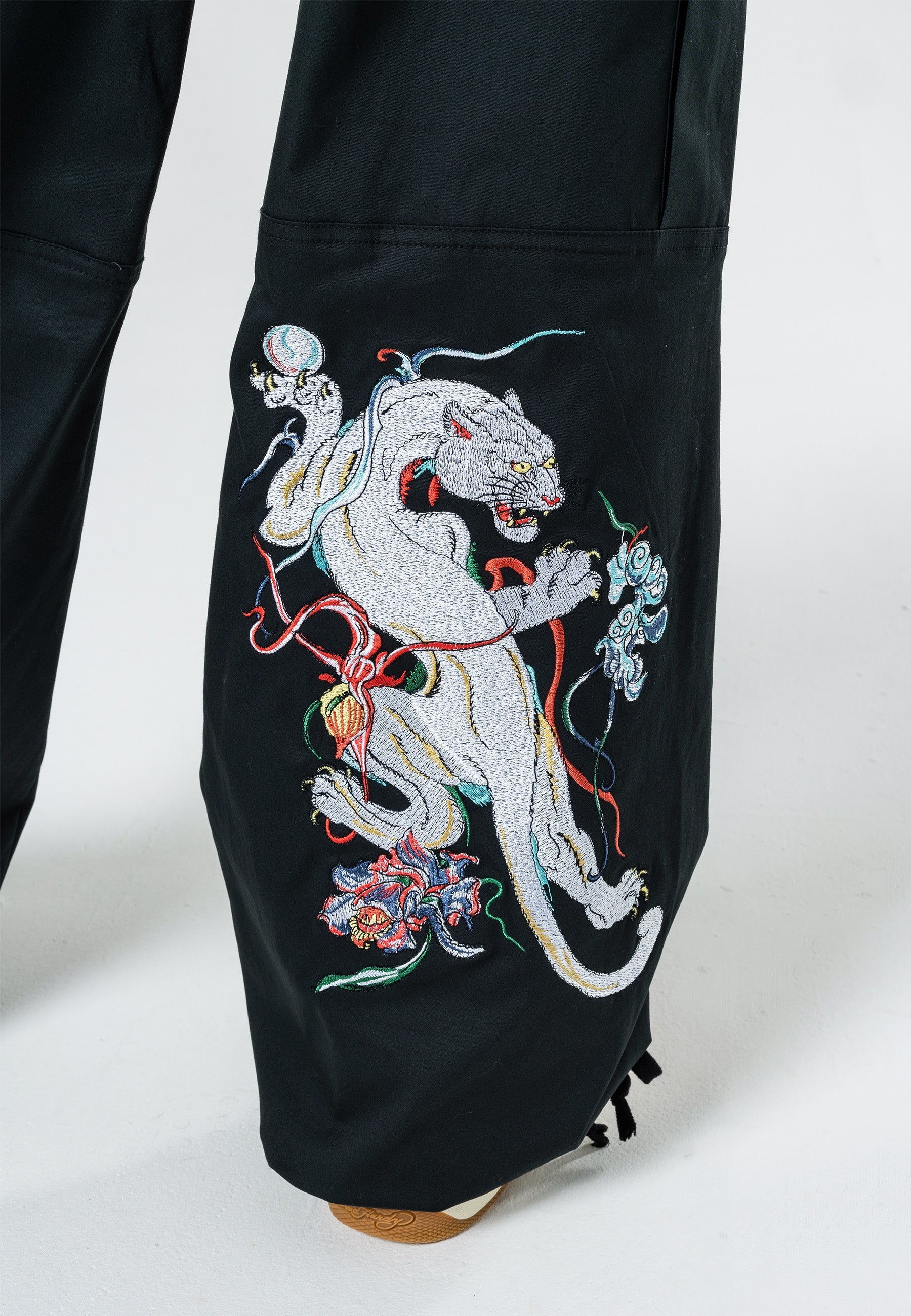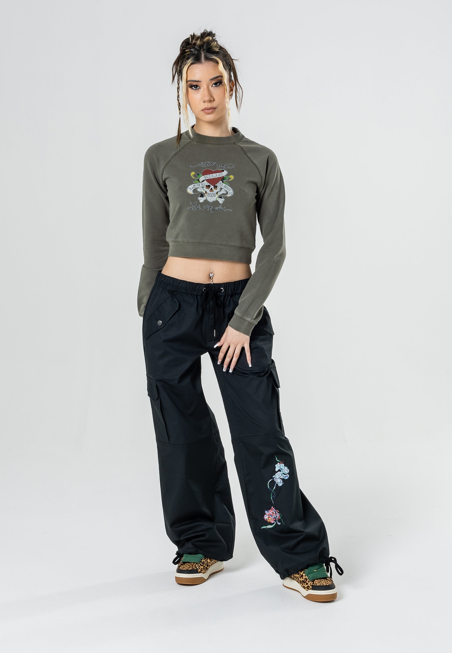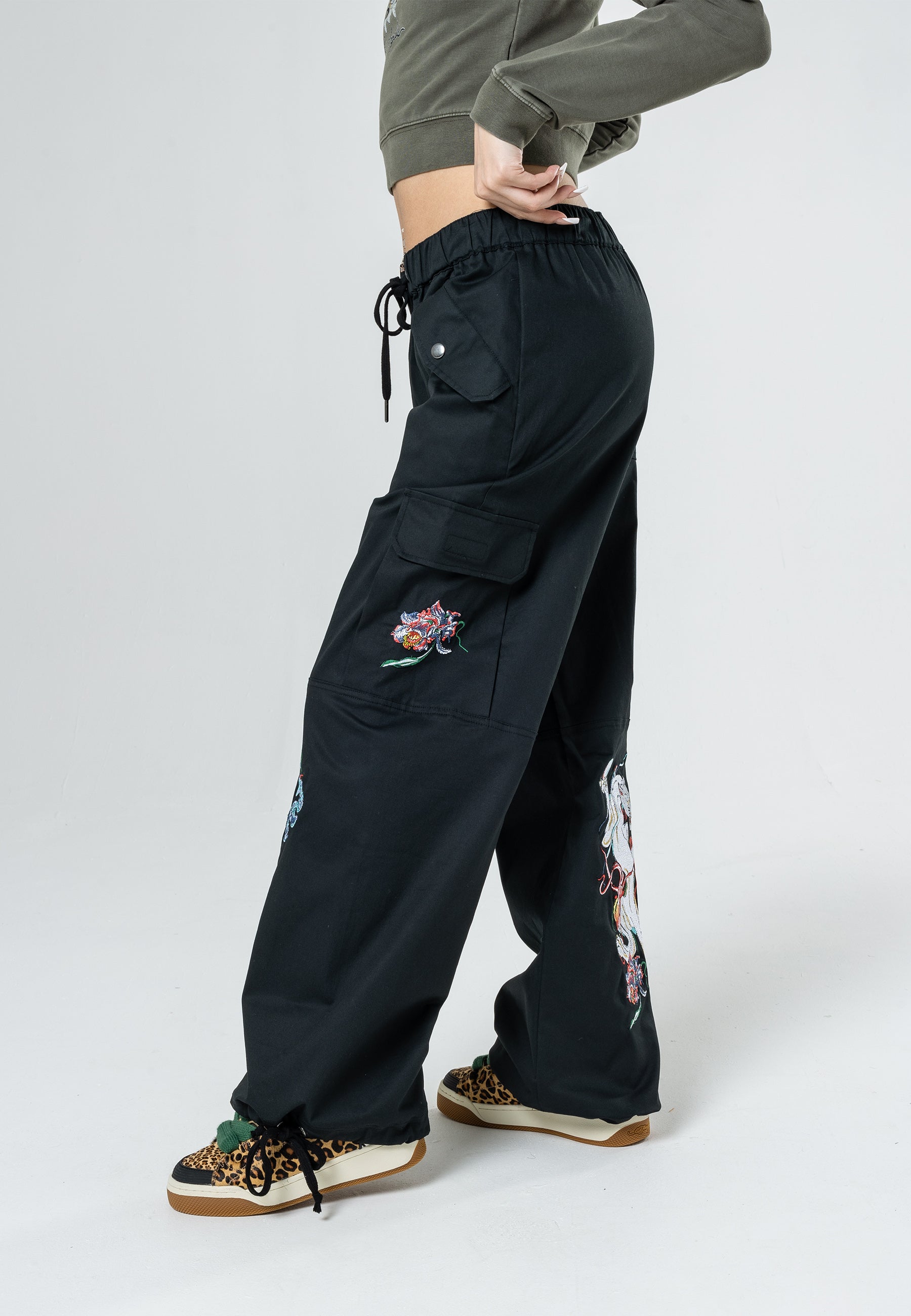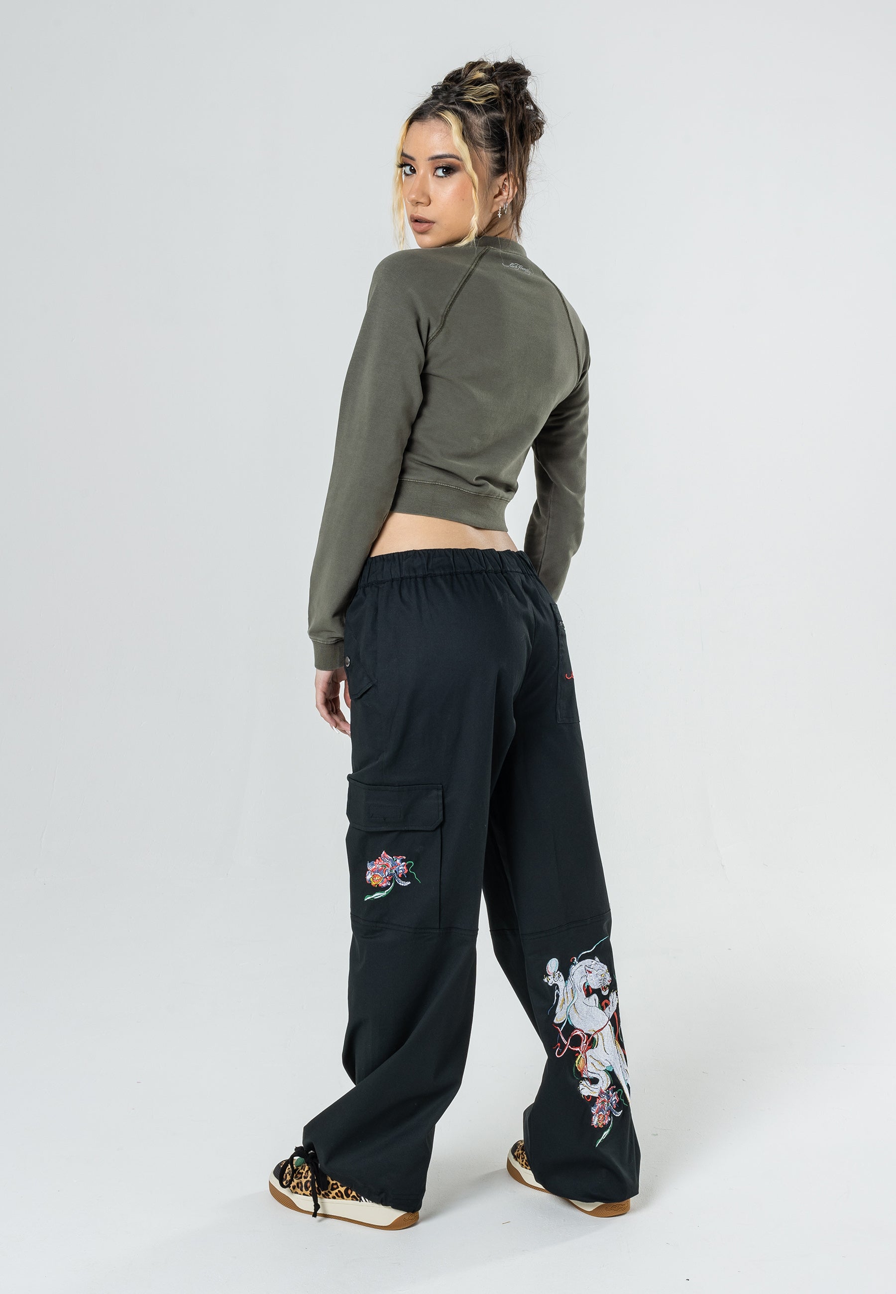 Mystic Panther Cargo Pant-Washed Black apresenta o infame arquivo Eds de Panther bordado em alta definição na parte inferior da perna direita traseira que vem para a frente, bem como o logotipo Ed Hardy bordado no bolso traseiro com zíper e bordado floral no bolso esquerdo. Essas calças cargos confortáveis são perfeitas para climas frios, diurnos e noturnos.
