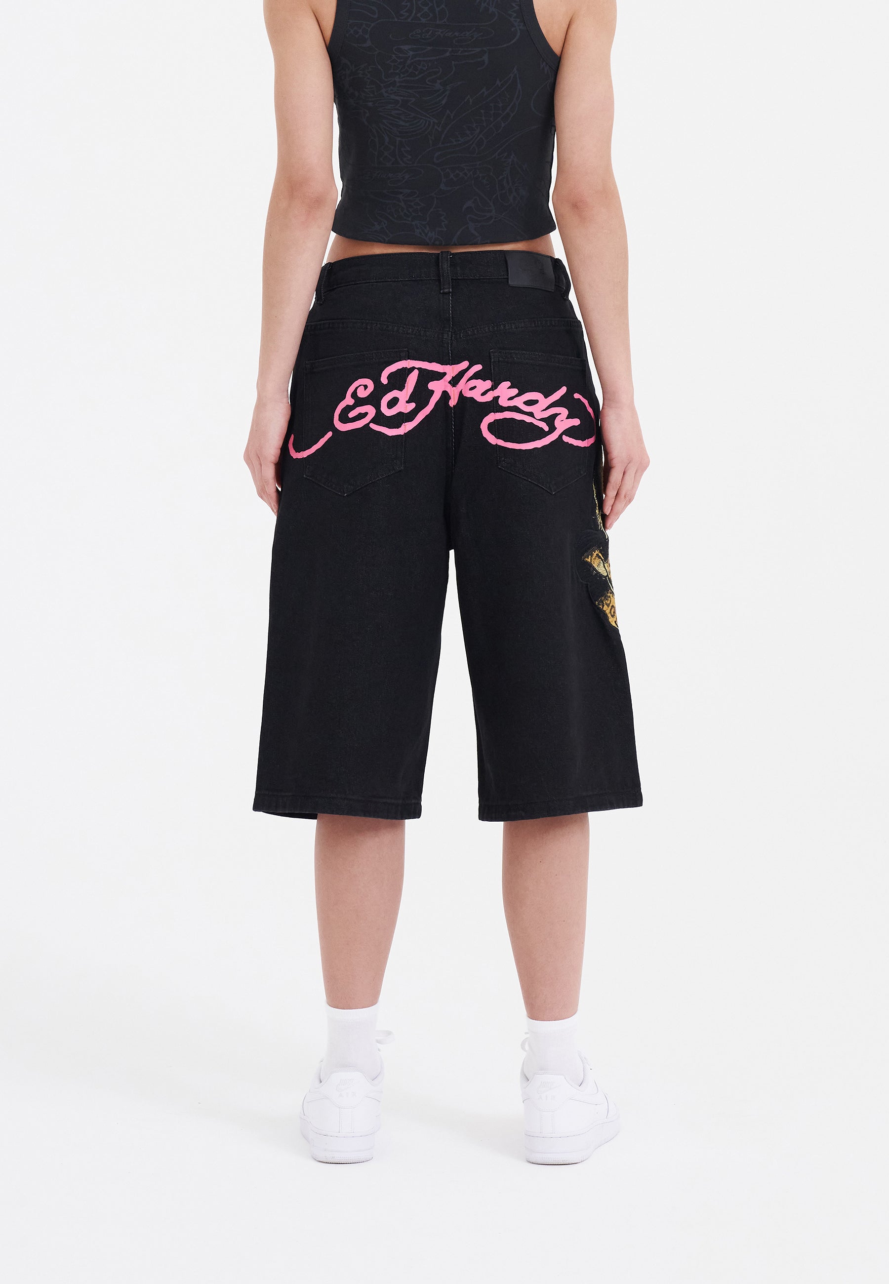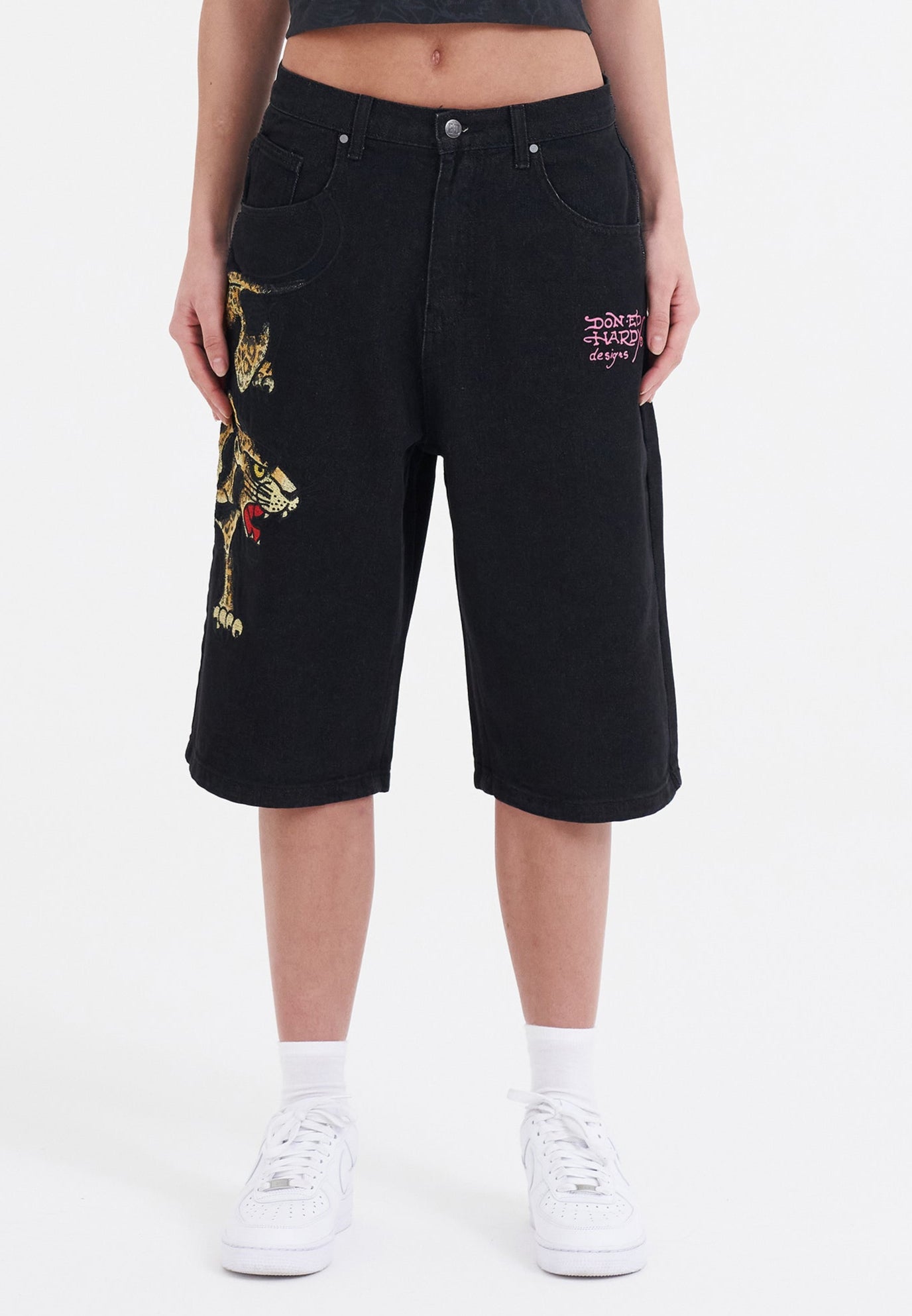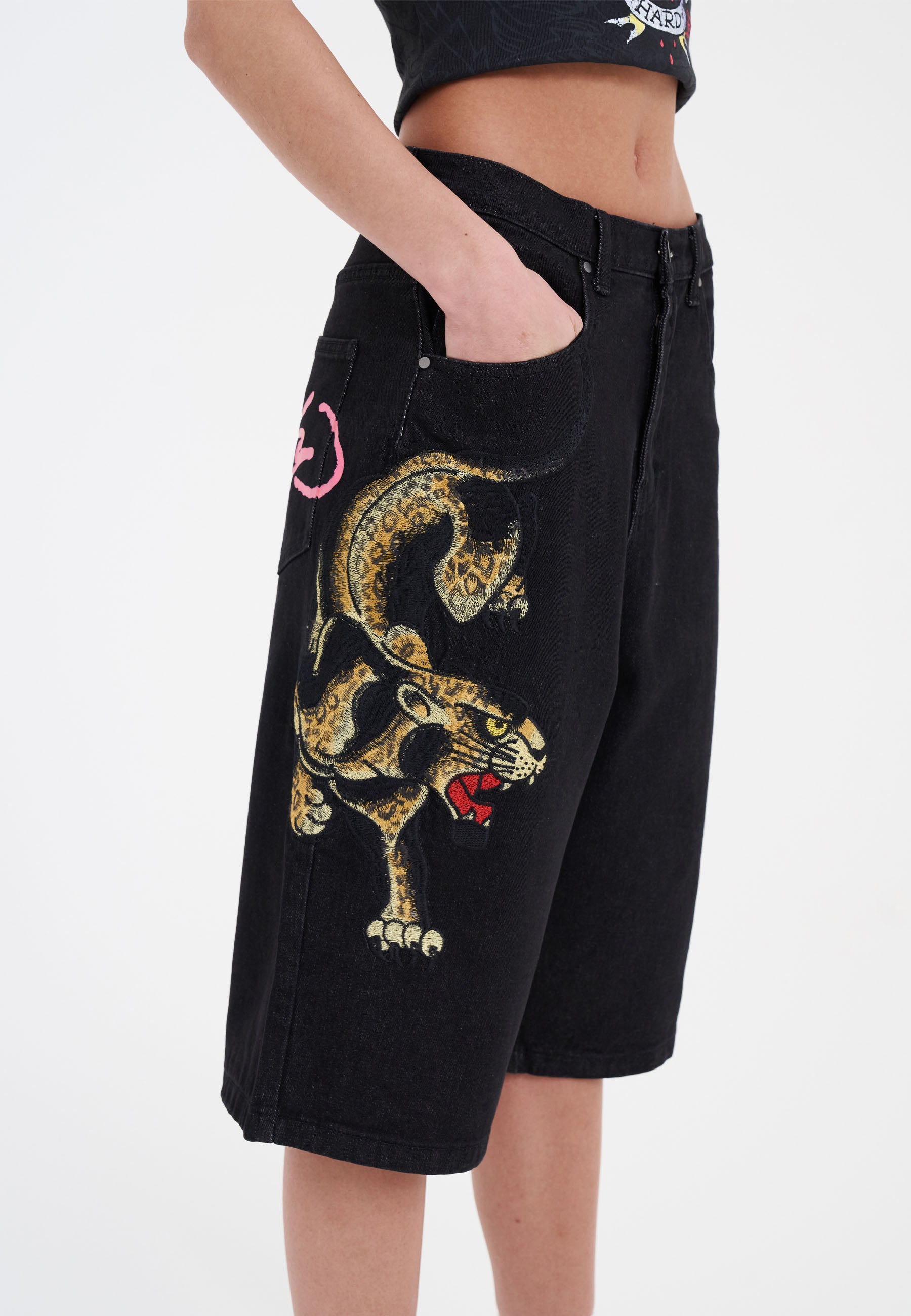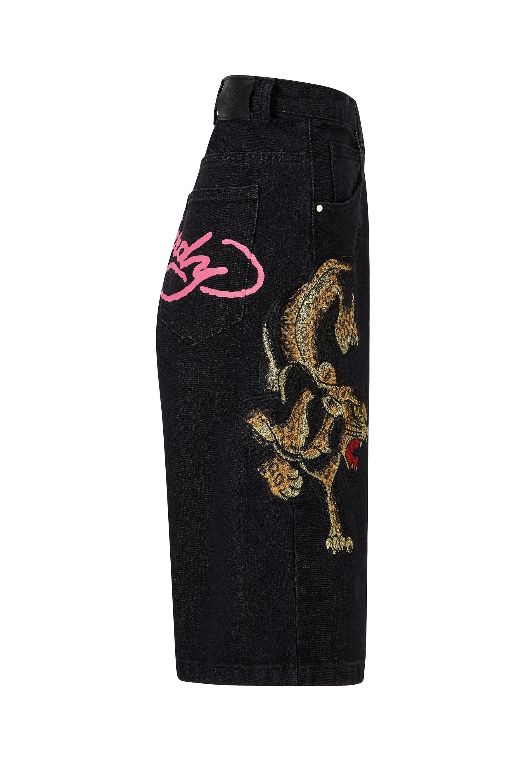 O short descontraído Panther Crawl em jeans preto 100% algodão apresenta uma atraente ilustração bordada em cores e o logotipo Ed Hardy na parte traseira em rosa.