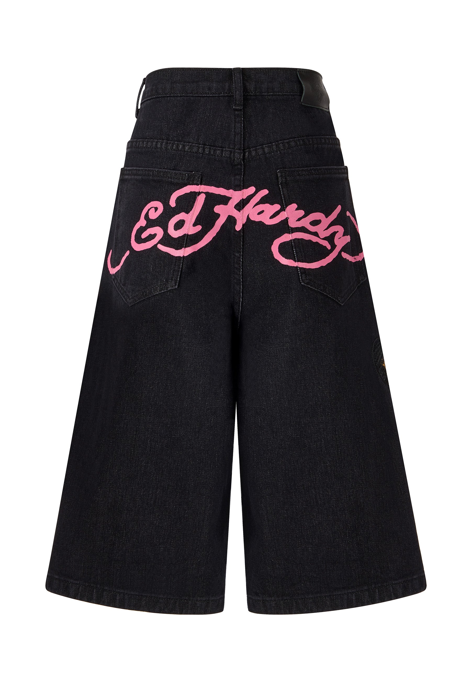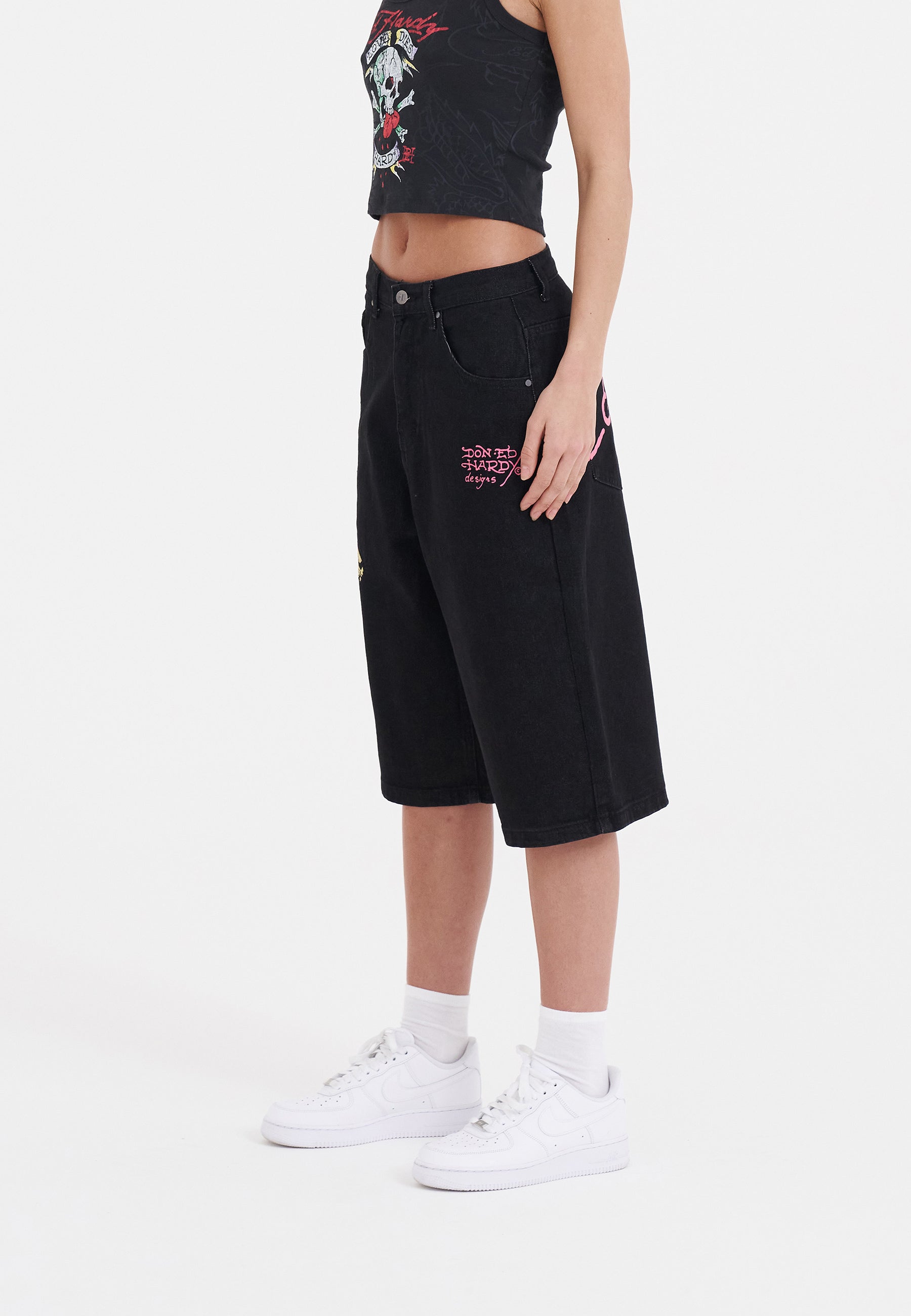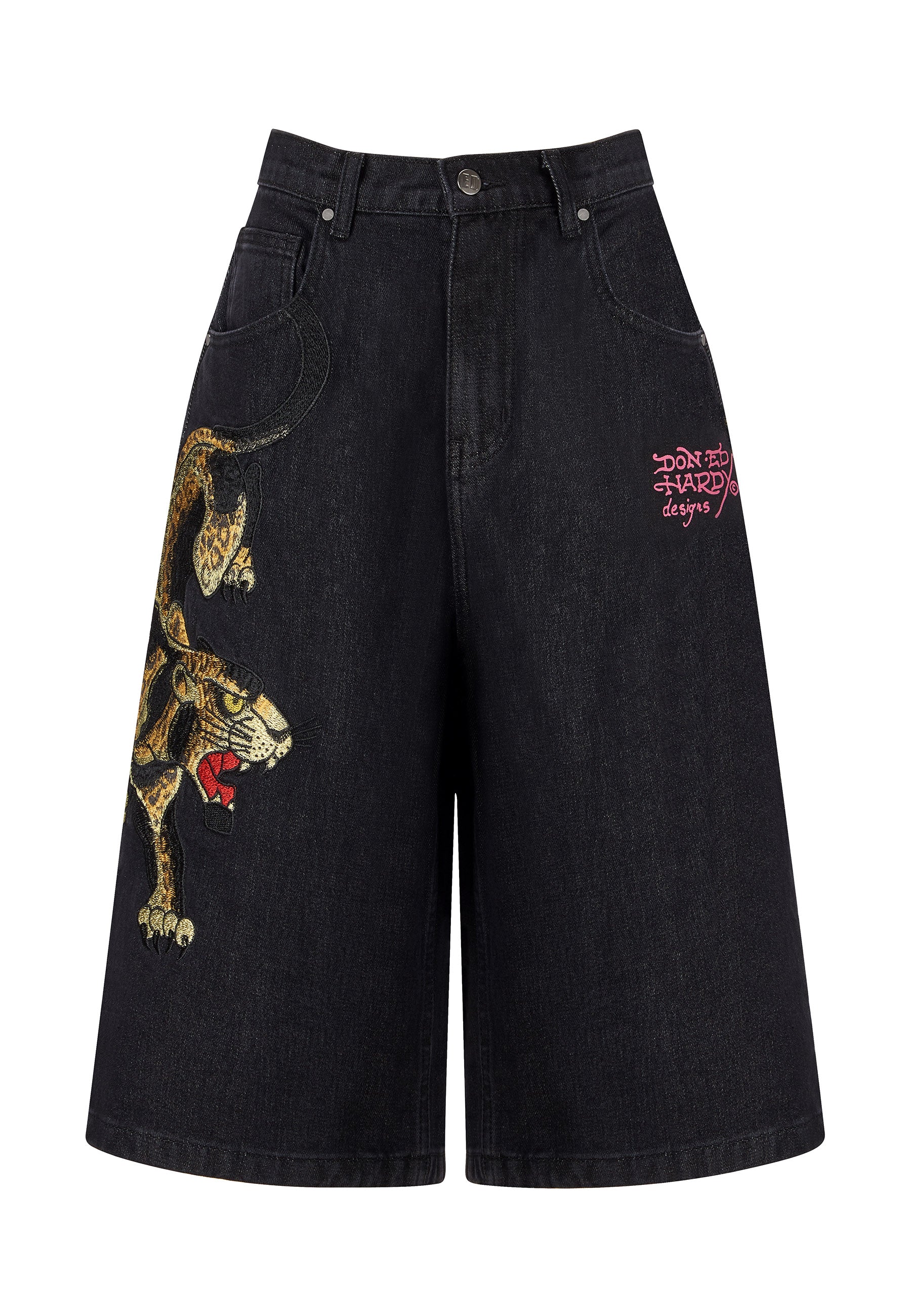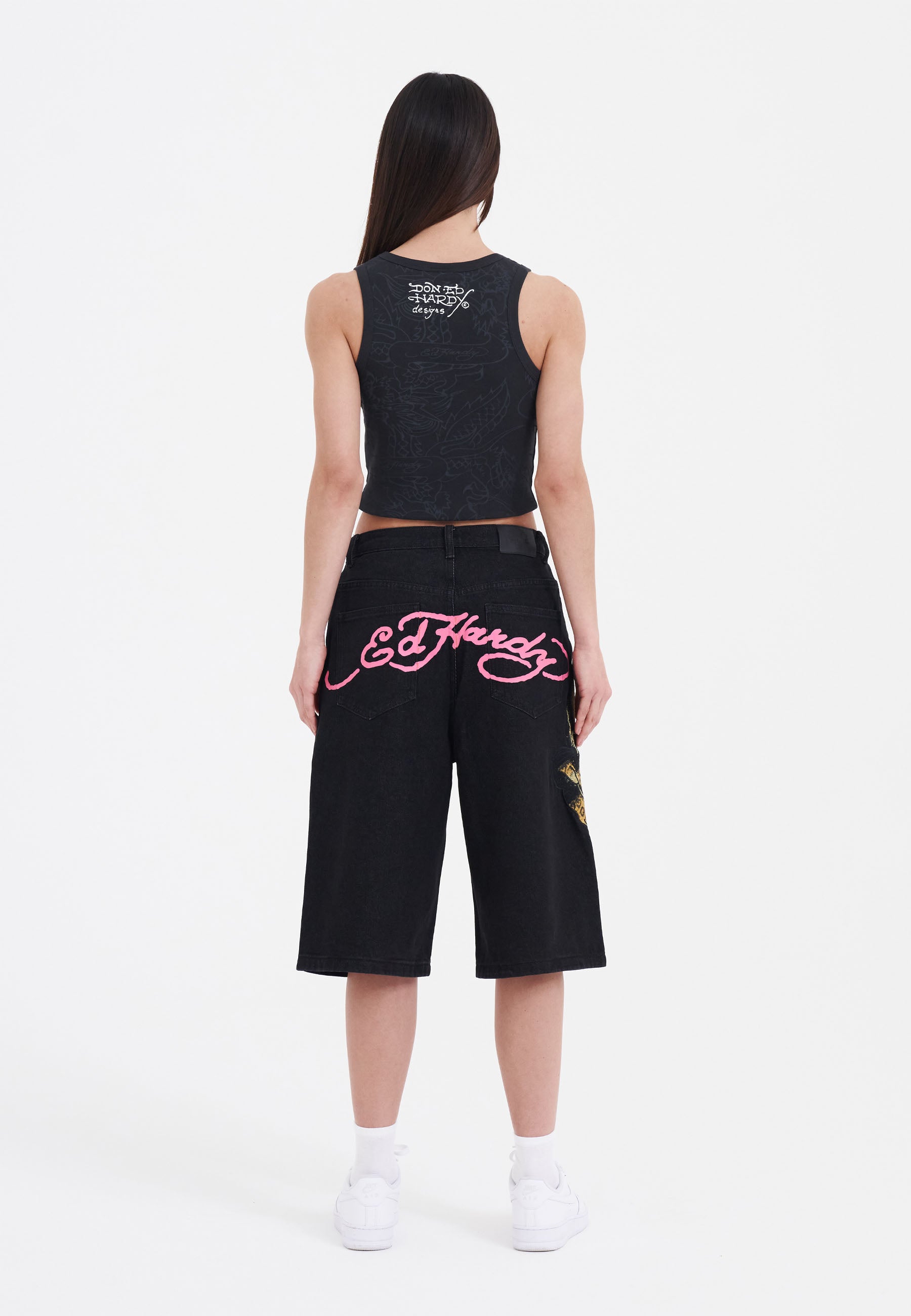 O short descontraído Panther Crawl em jeans preto 100% algodão apresenta uma atraente ilustração bordada em cores e o logotipo Ed Hardy na parte traseira em rosa.