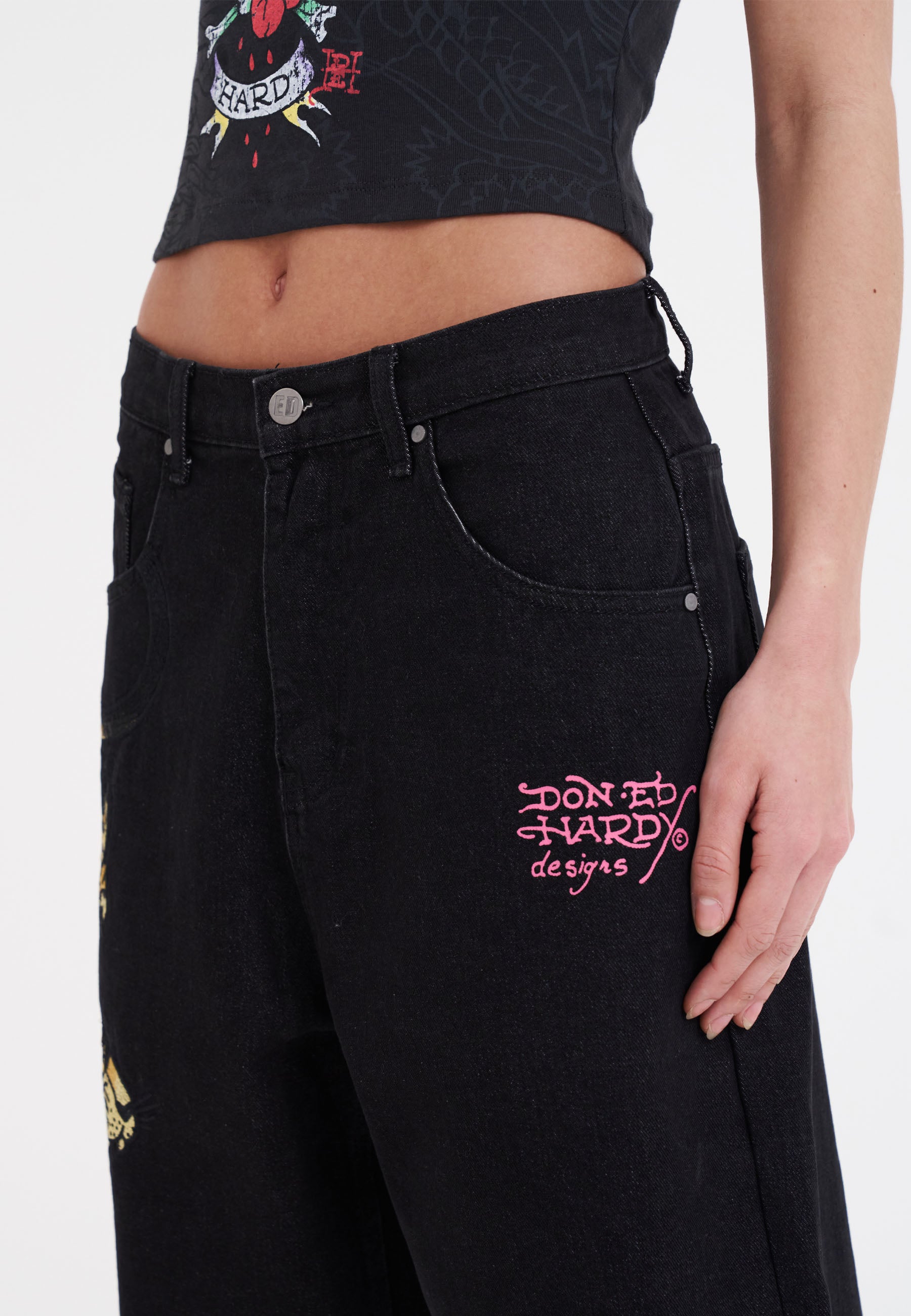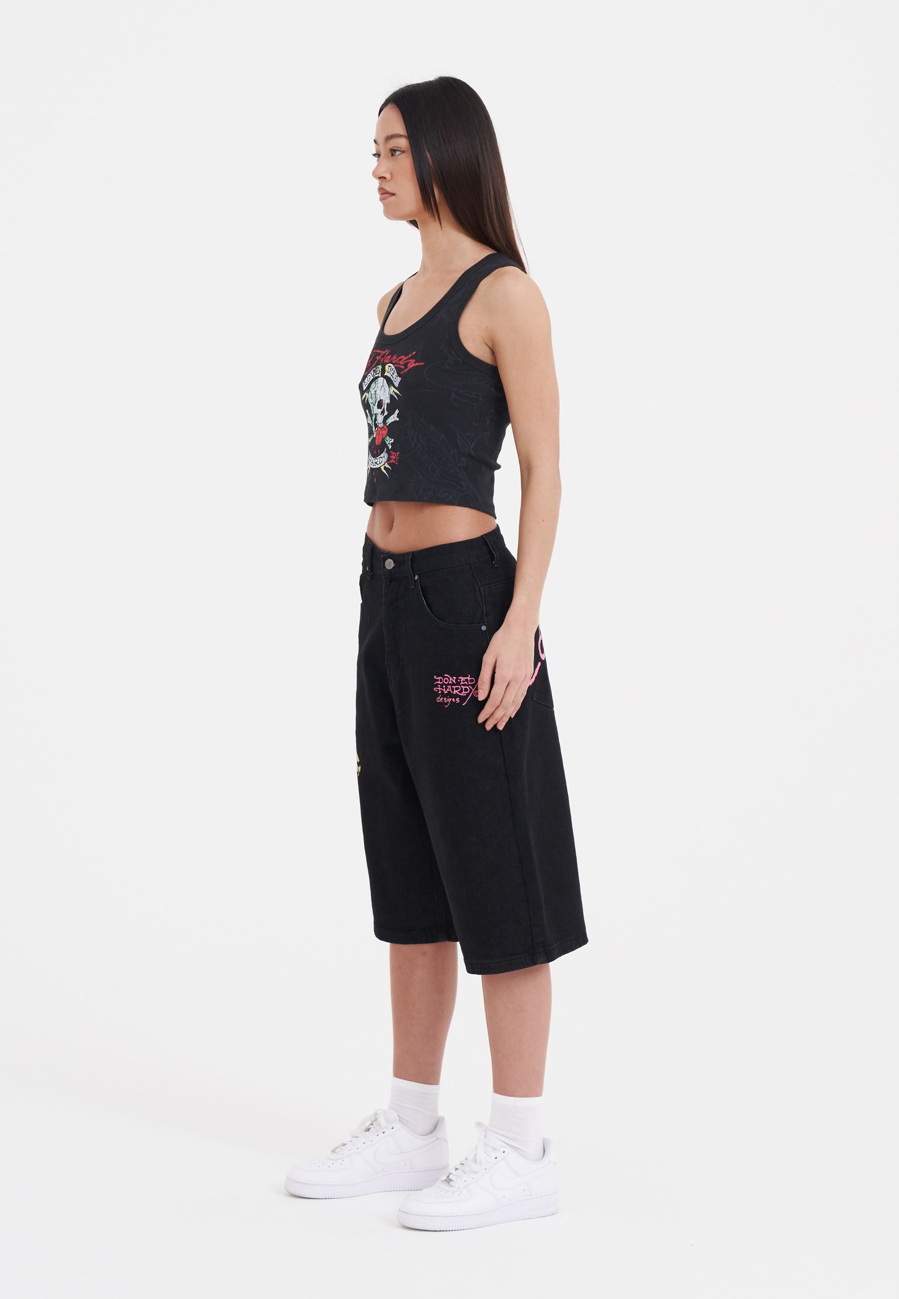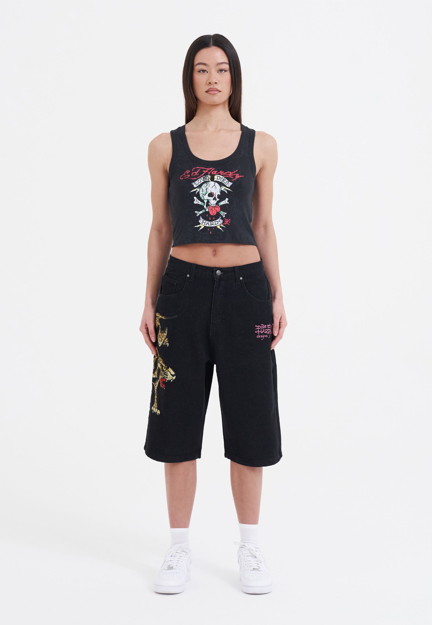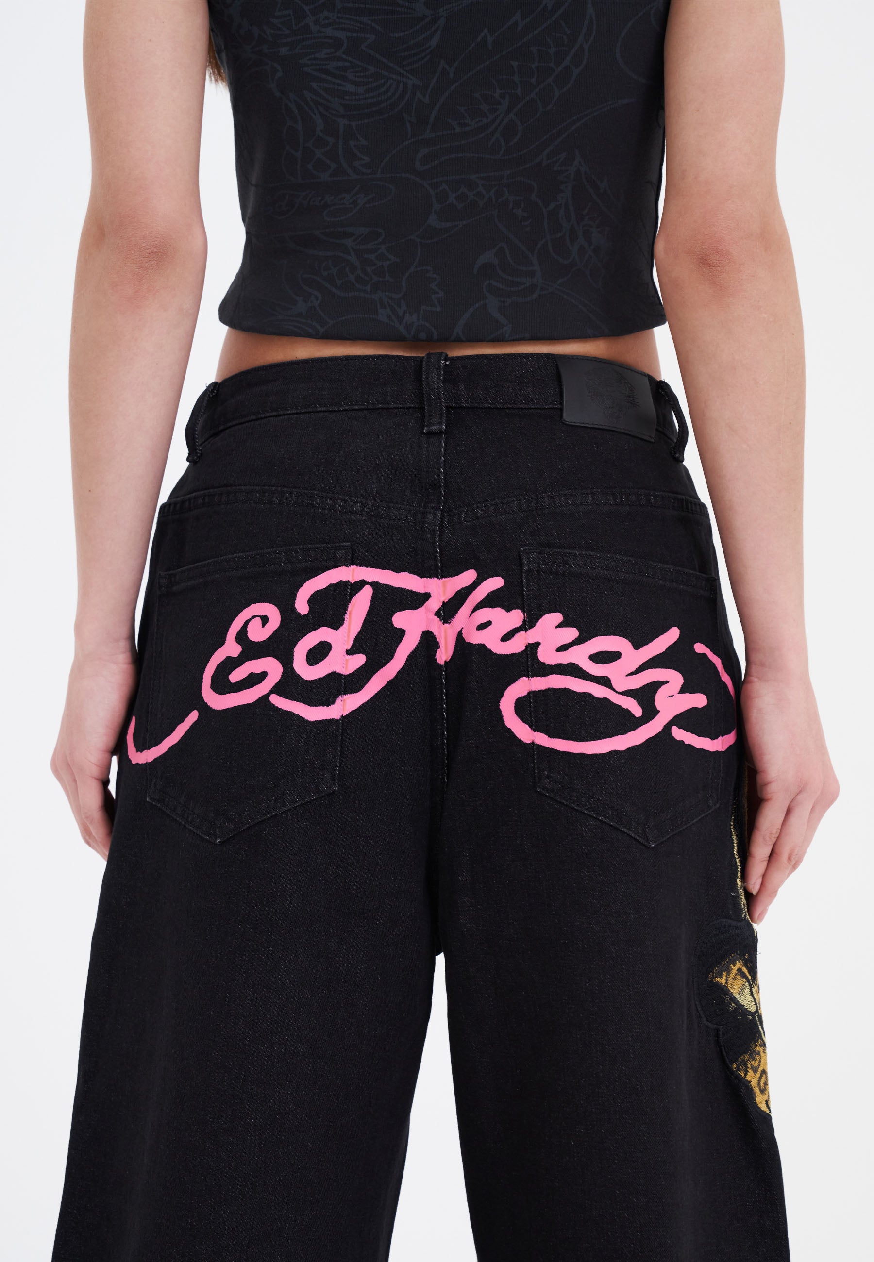 O short descontraído Panther Crawl em jeans preto 100% algodão apresenta uma atraente ilustração bordada em cores e o logotipo Ed Hardy na parte traseira em rosa.