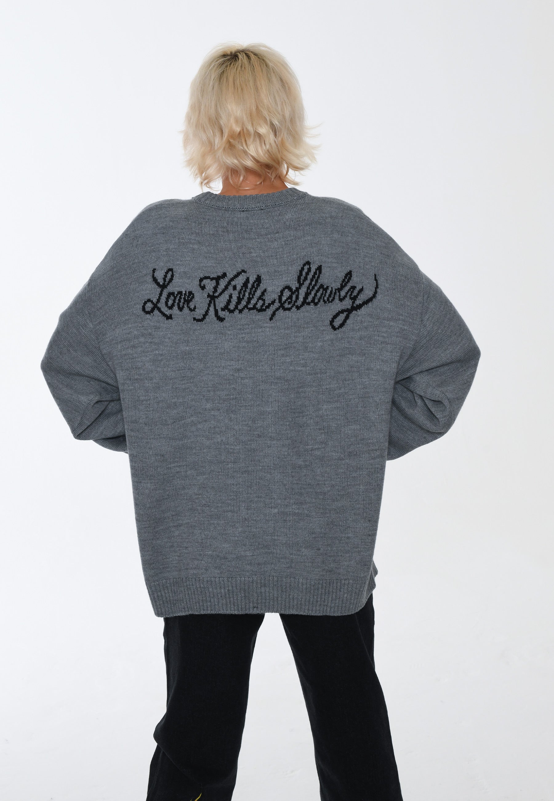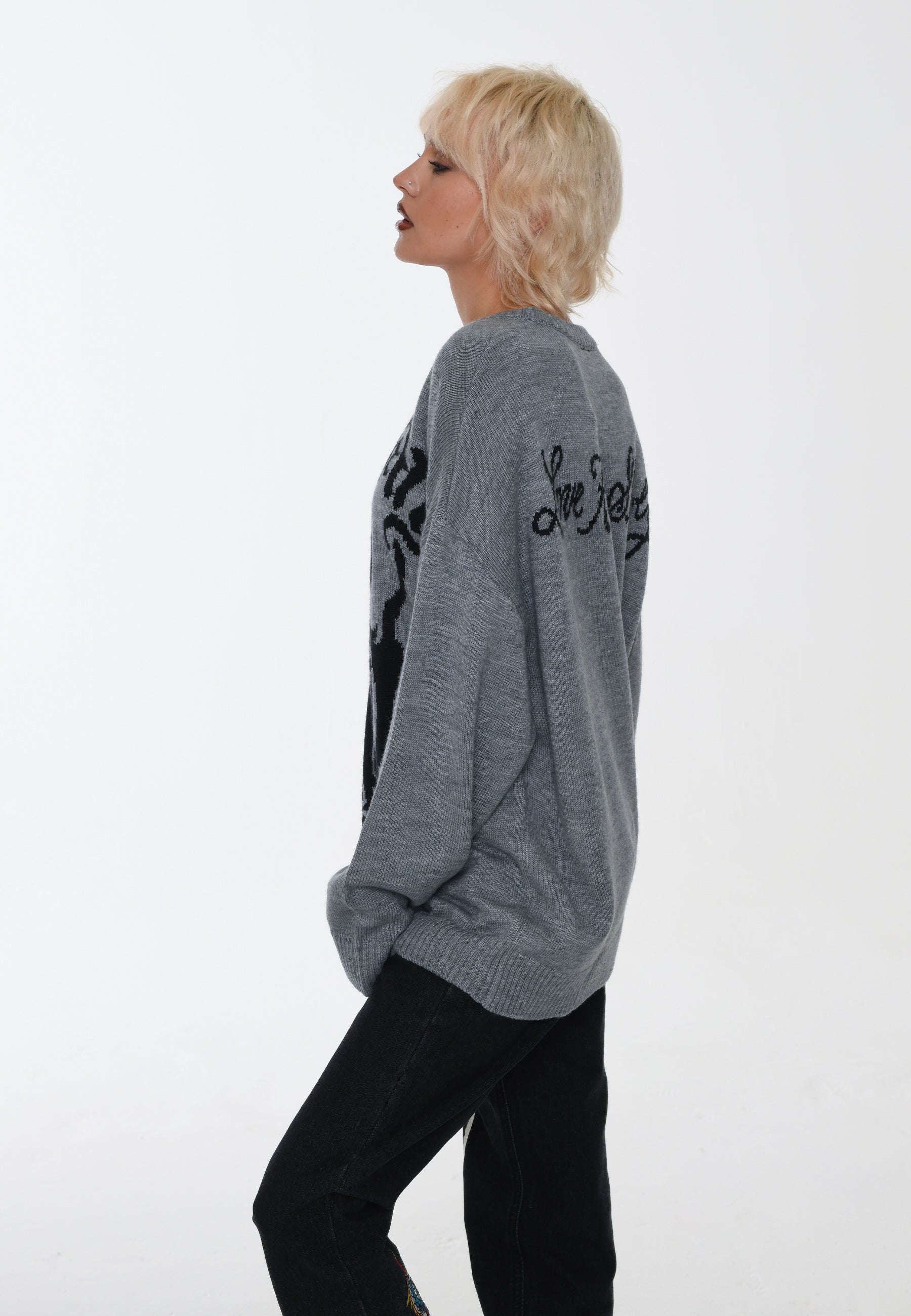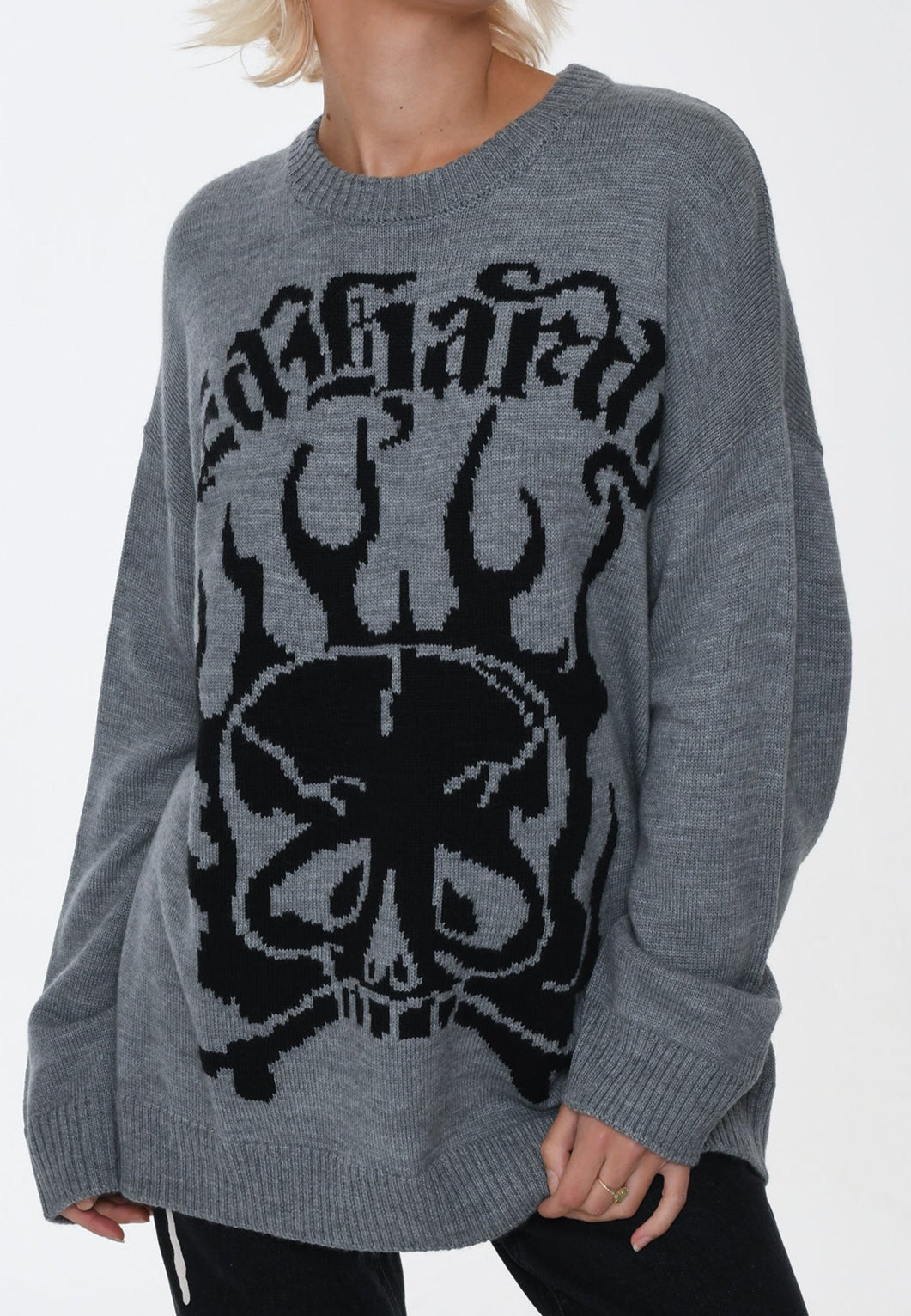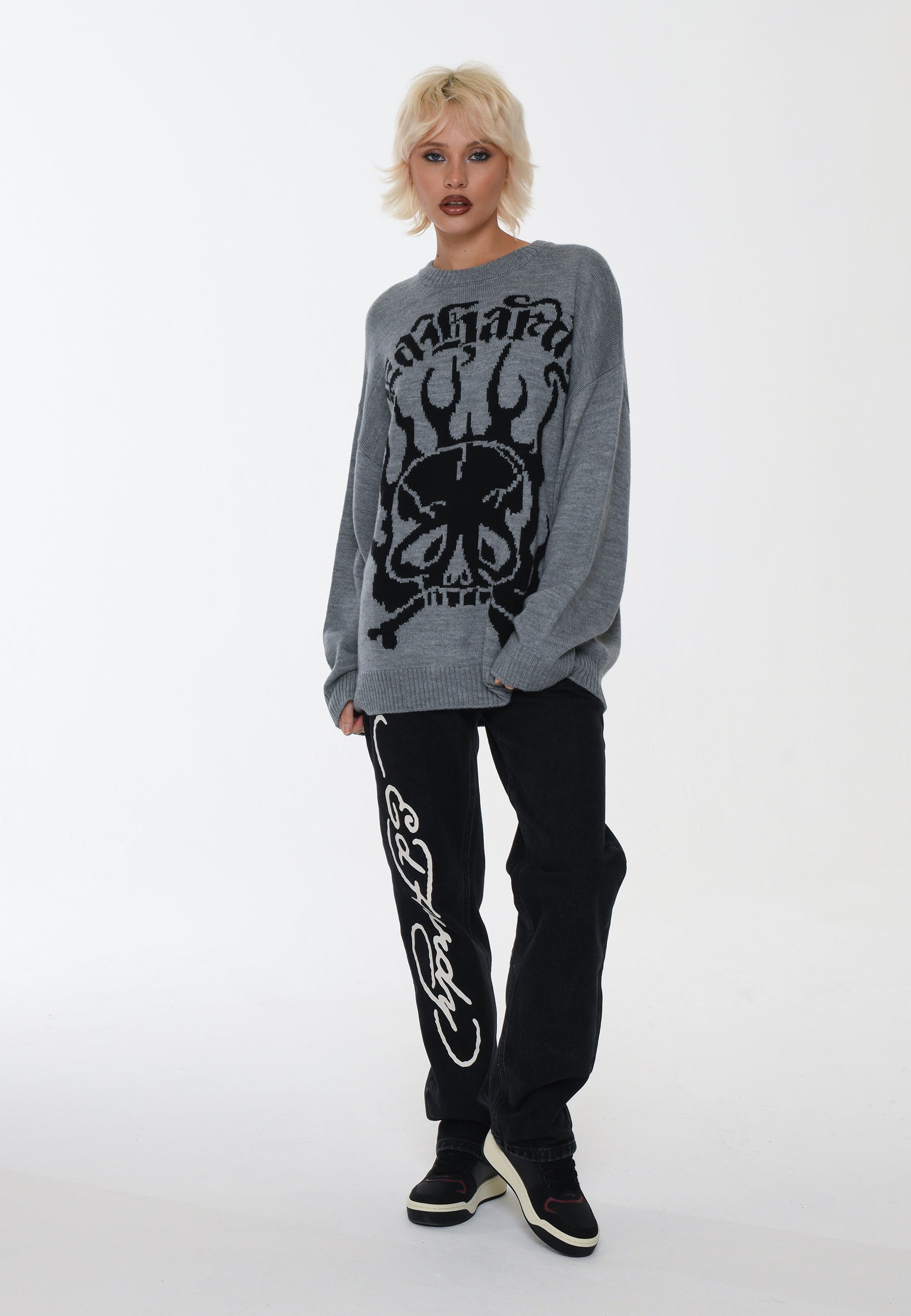 Suéter feminino de malha jaquard Skull In Flames - cinza/preto