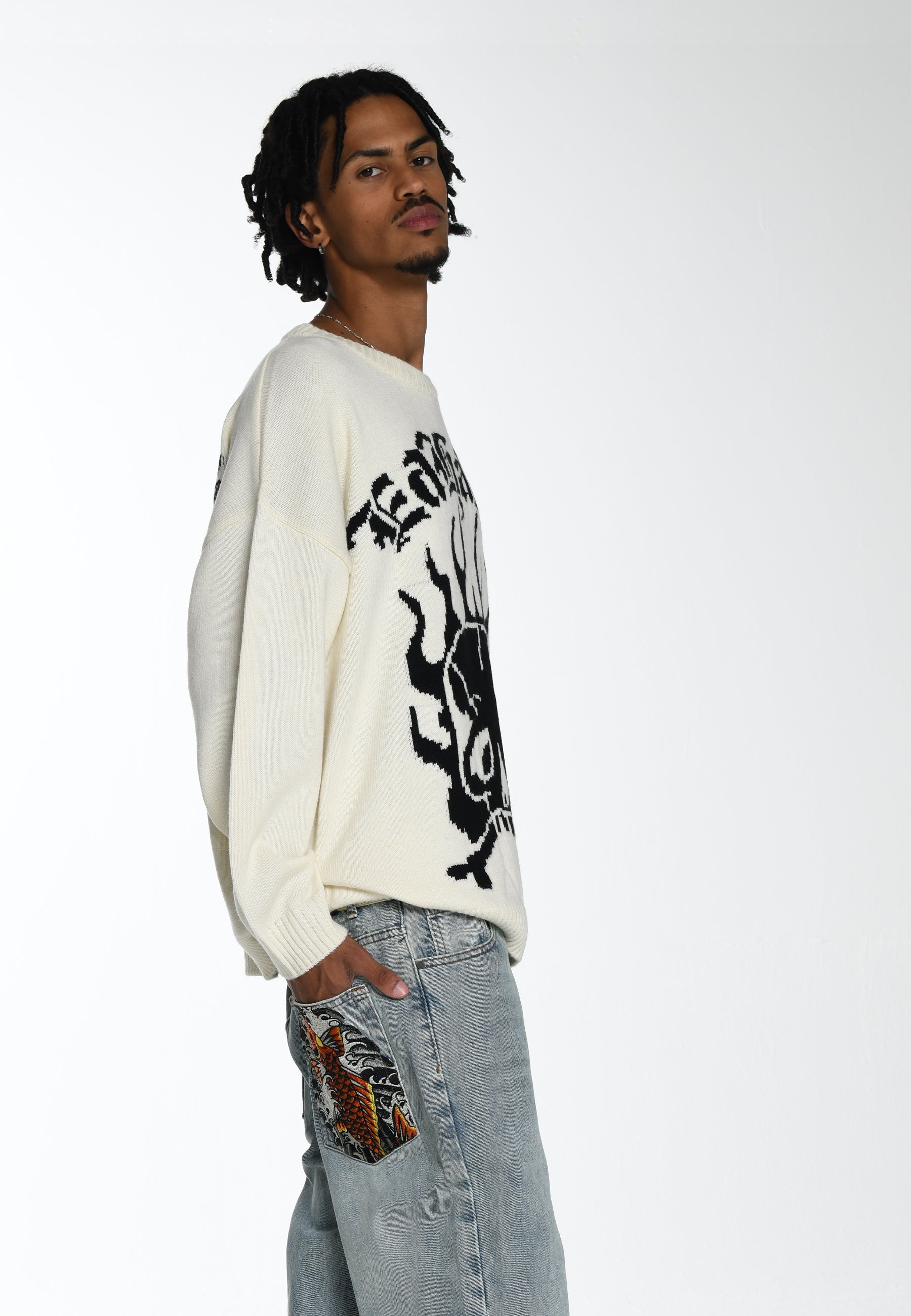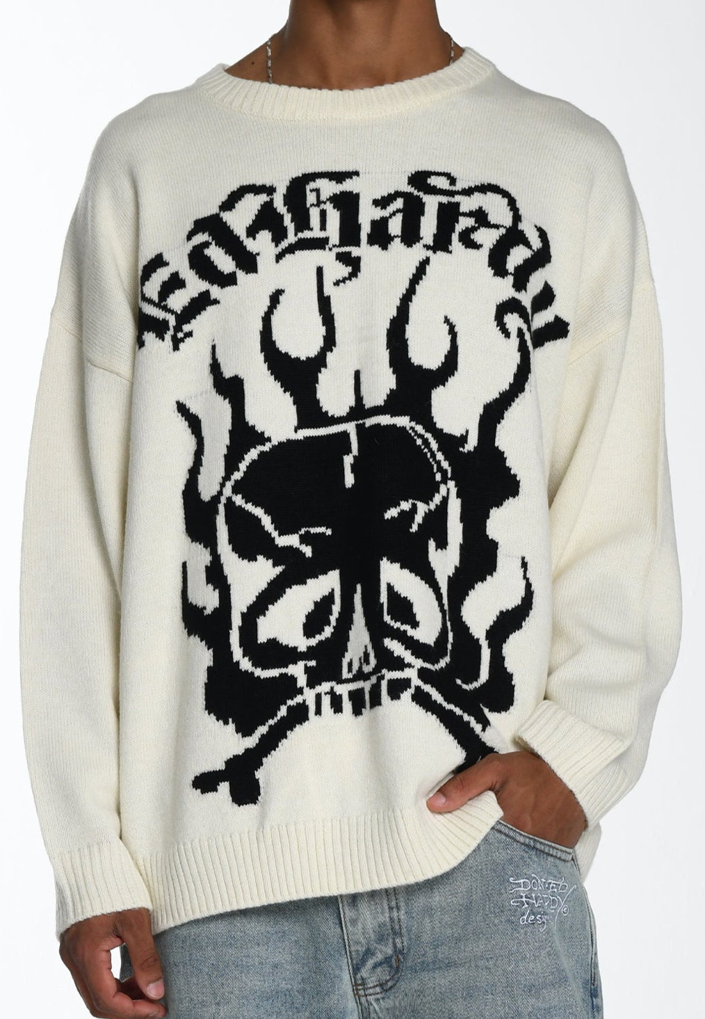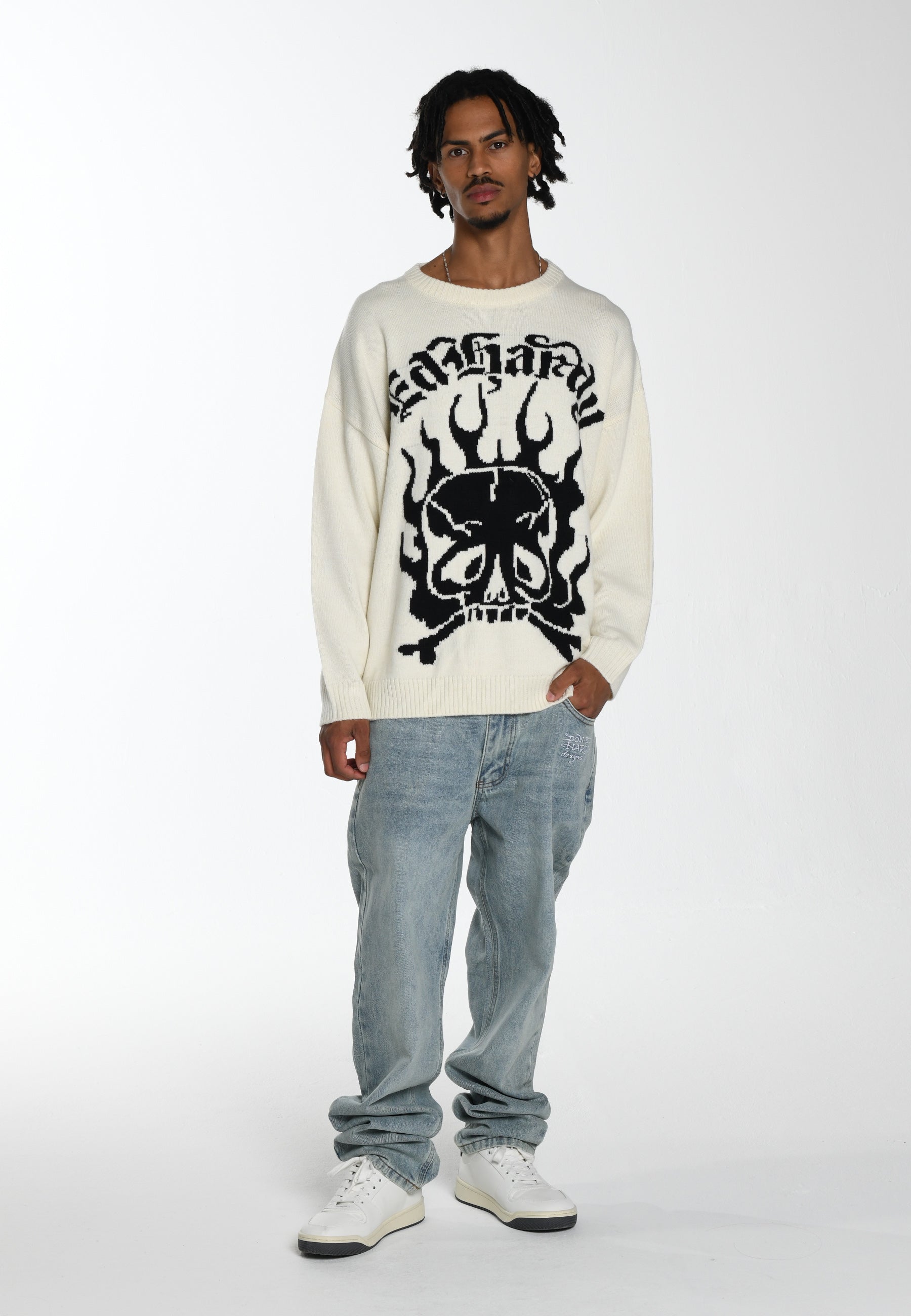 Suéter masculino de malha jaquard Skull In Flames - Cru/Preto