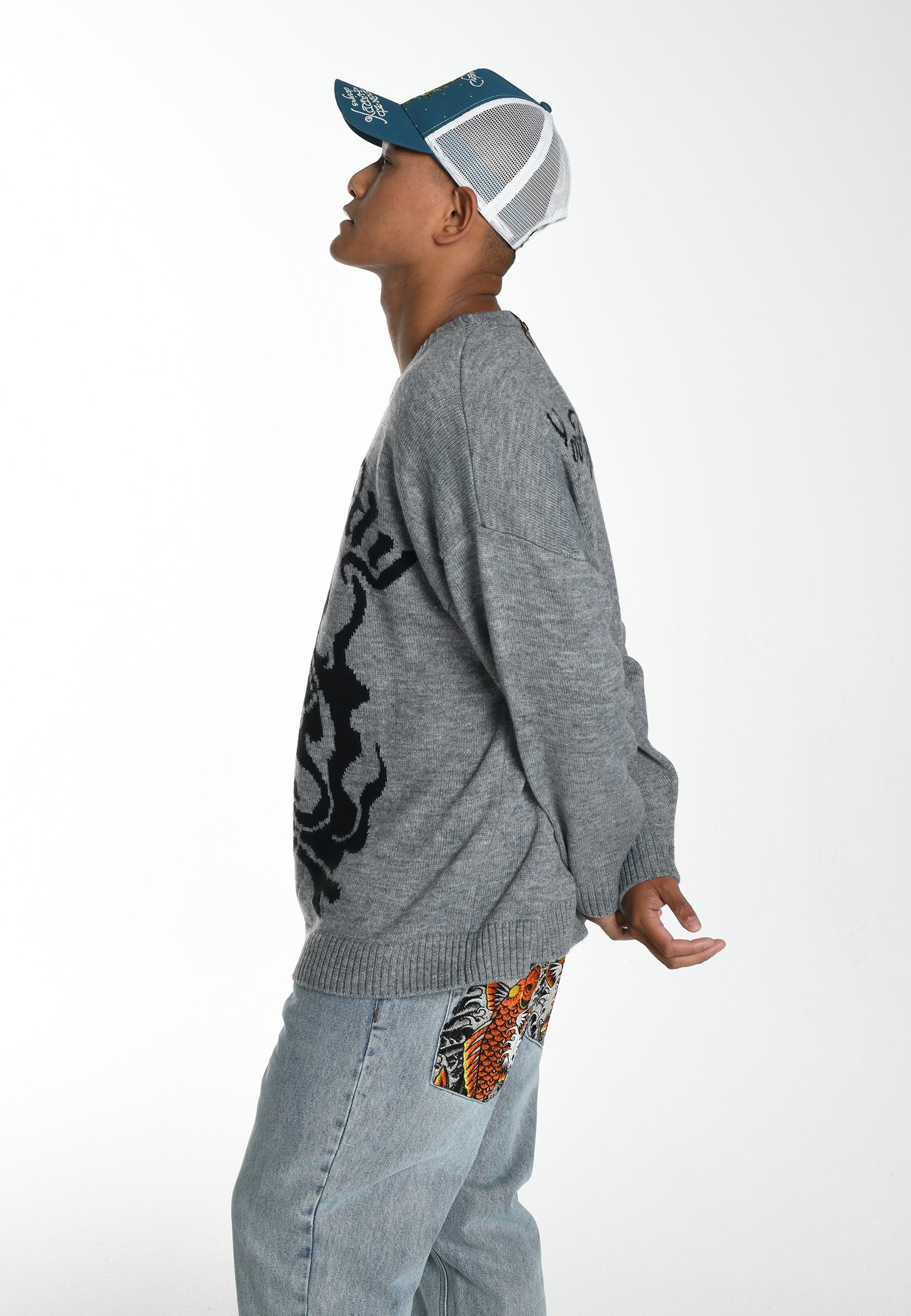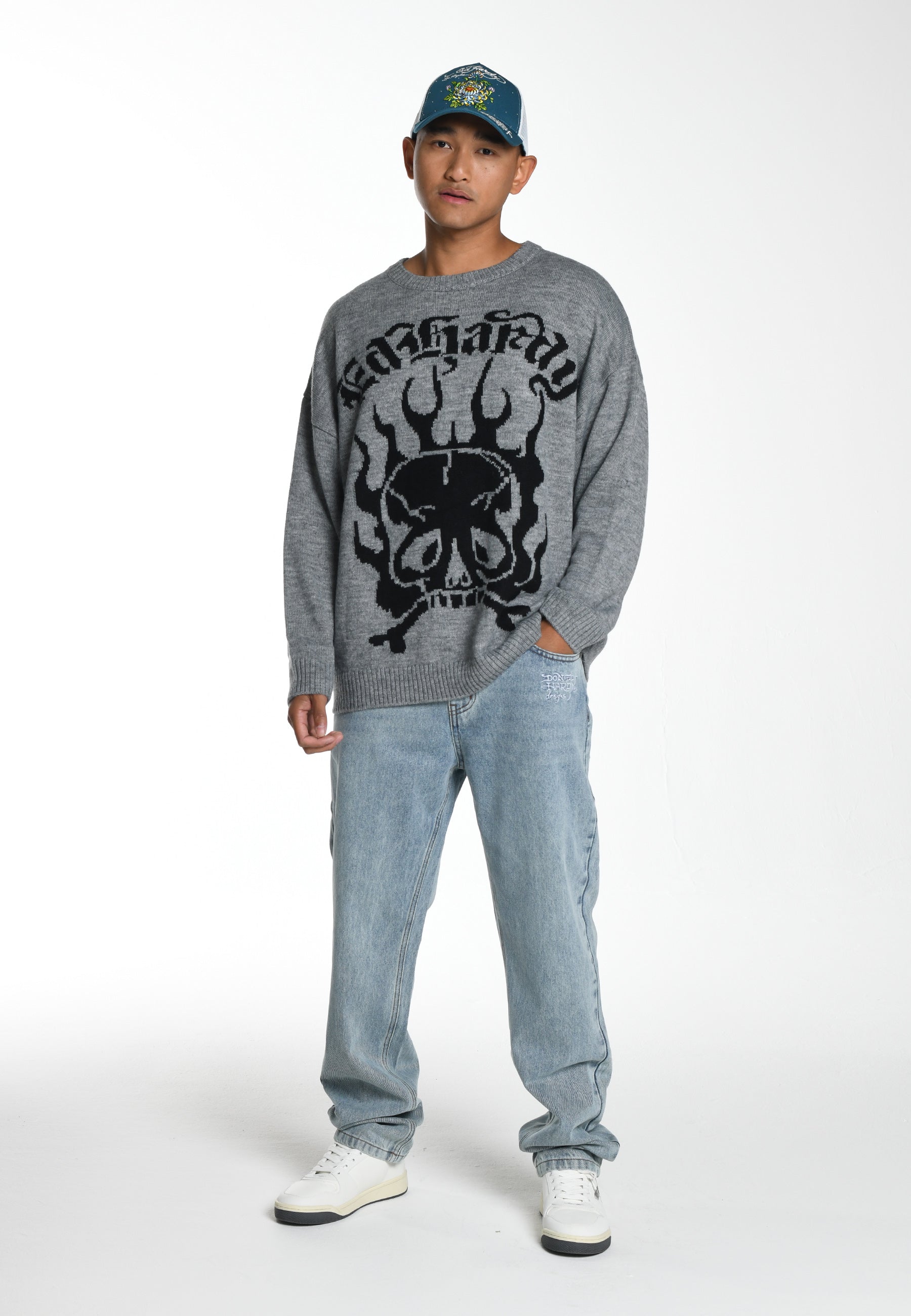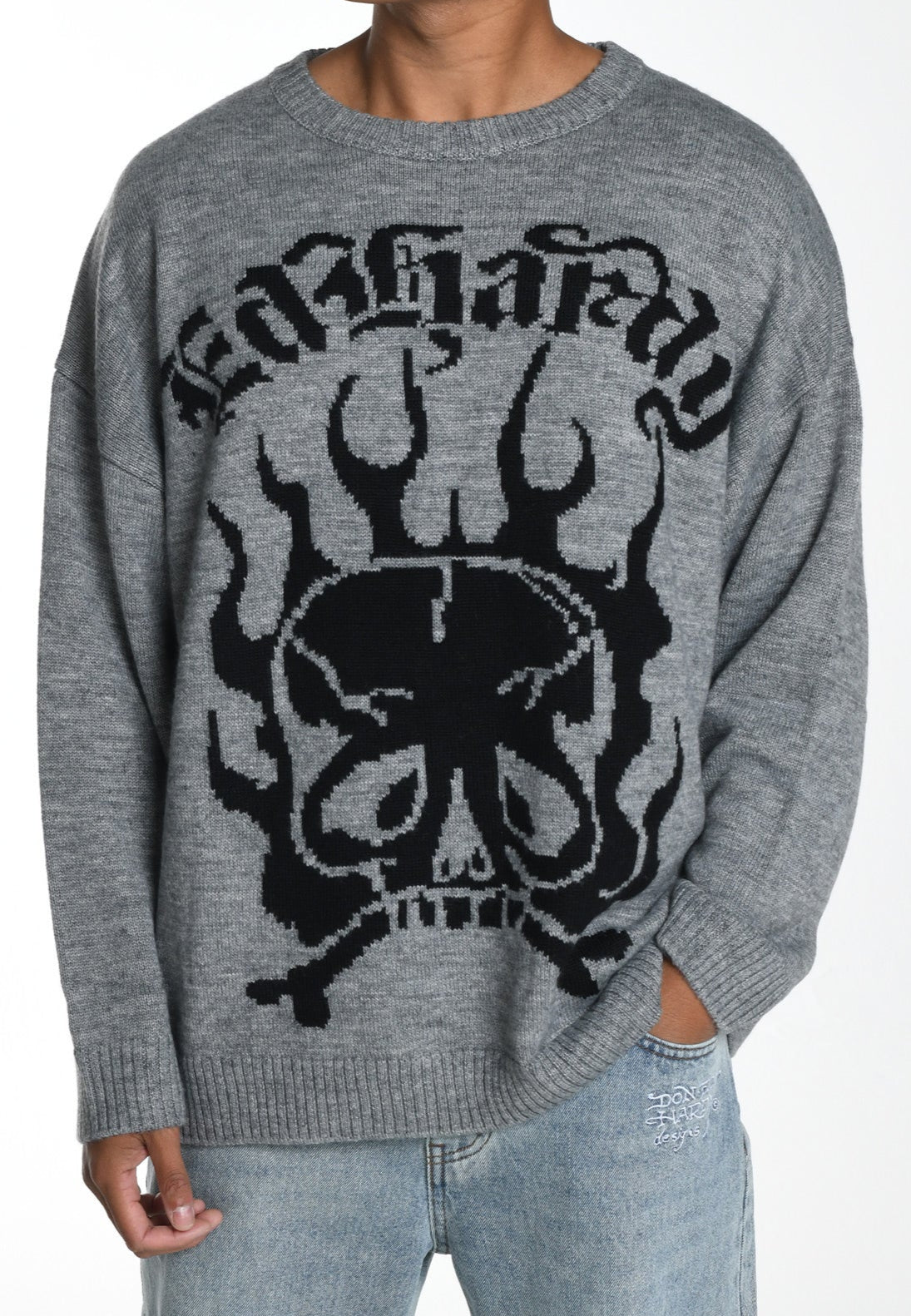 Suéter masculino de malha jaquard Skull In Flames - cinza/preto