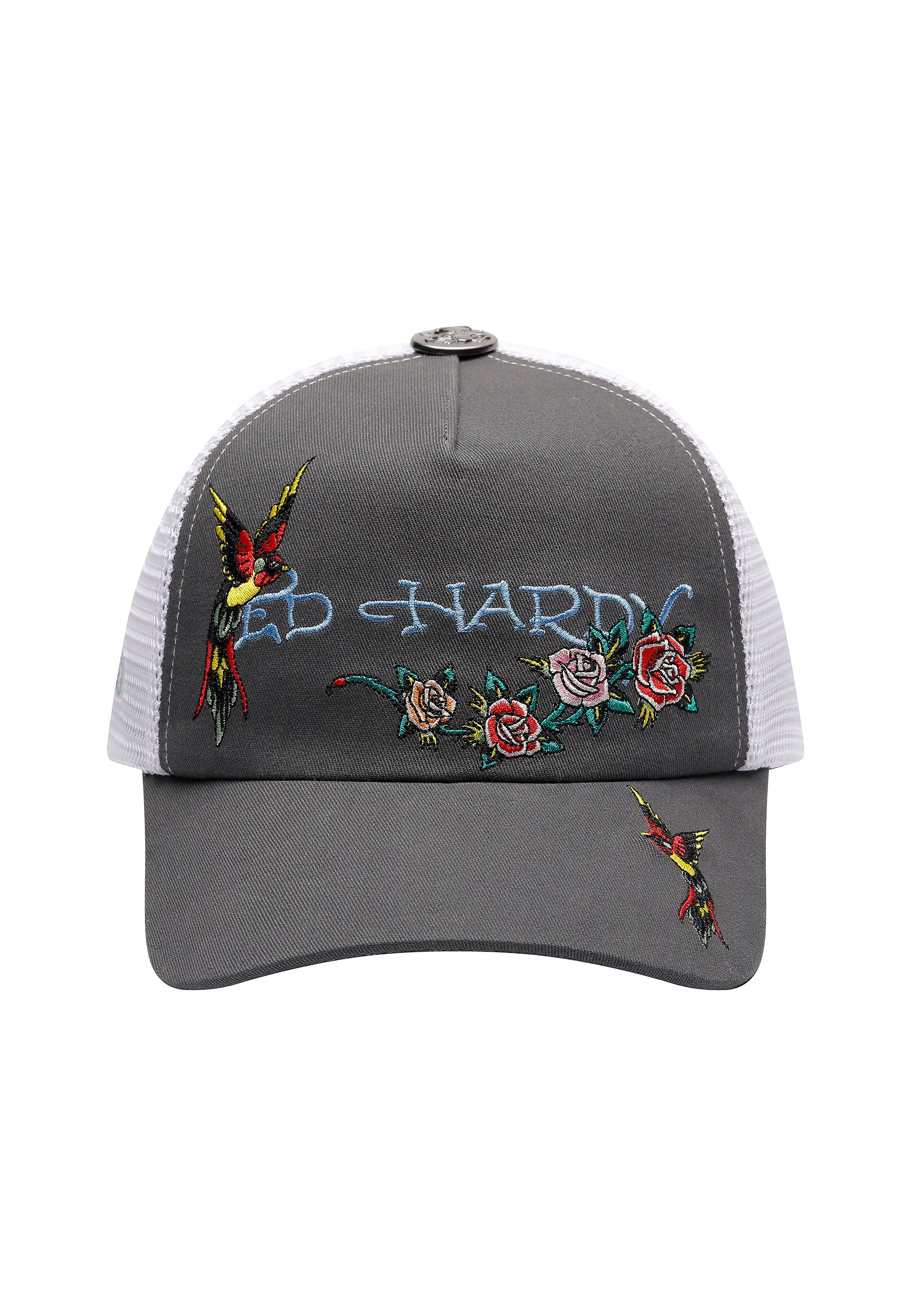 FLORAL SWALLOW 5 PANEL TRUCKER CAP in Charcoal