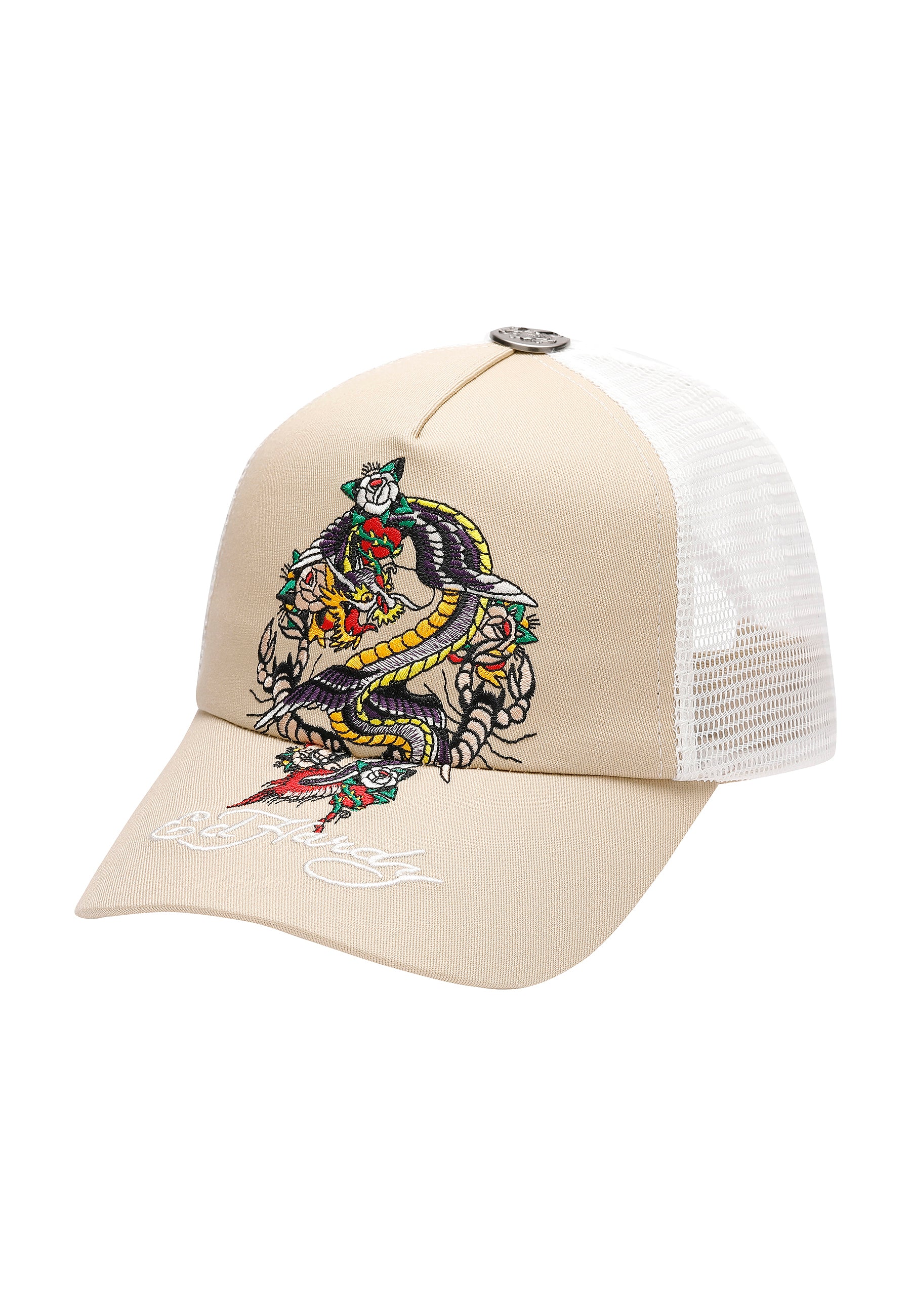 SWOOPING DRAGON 5 PANEL TRUCKER CAP in Beige
