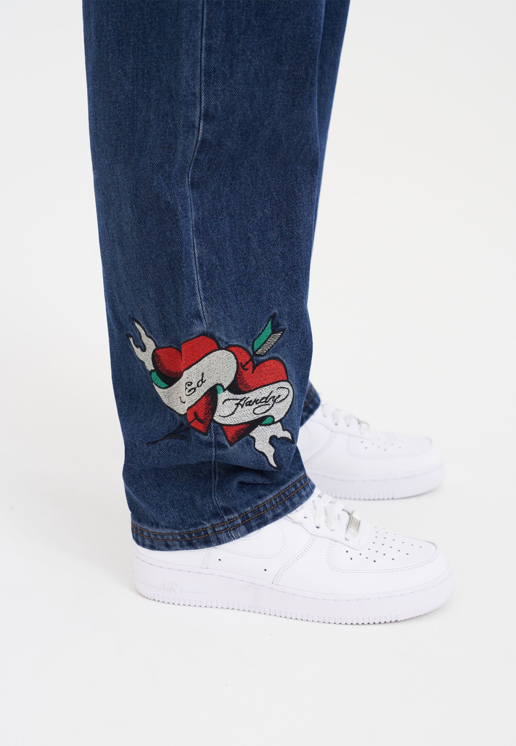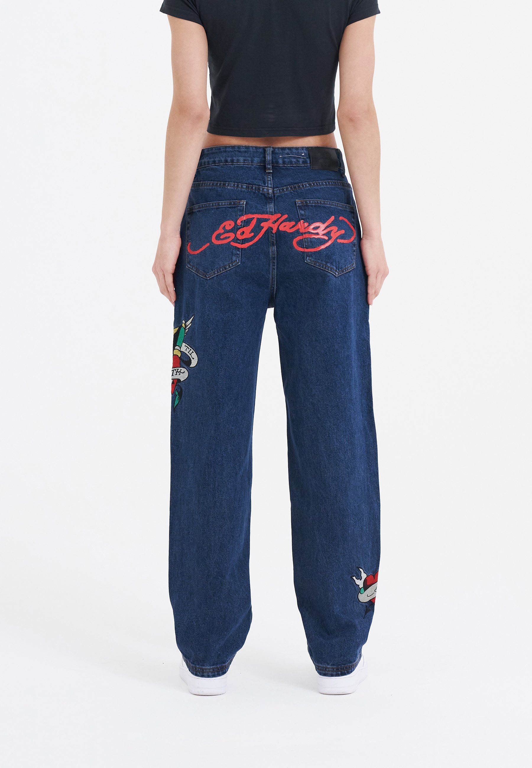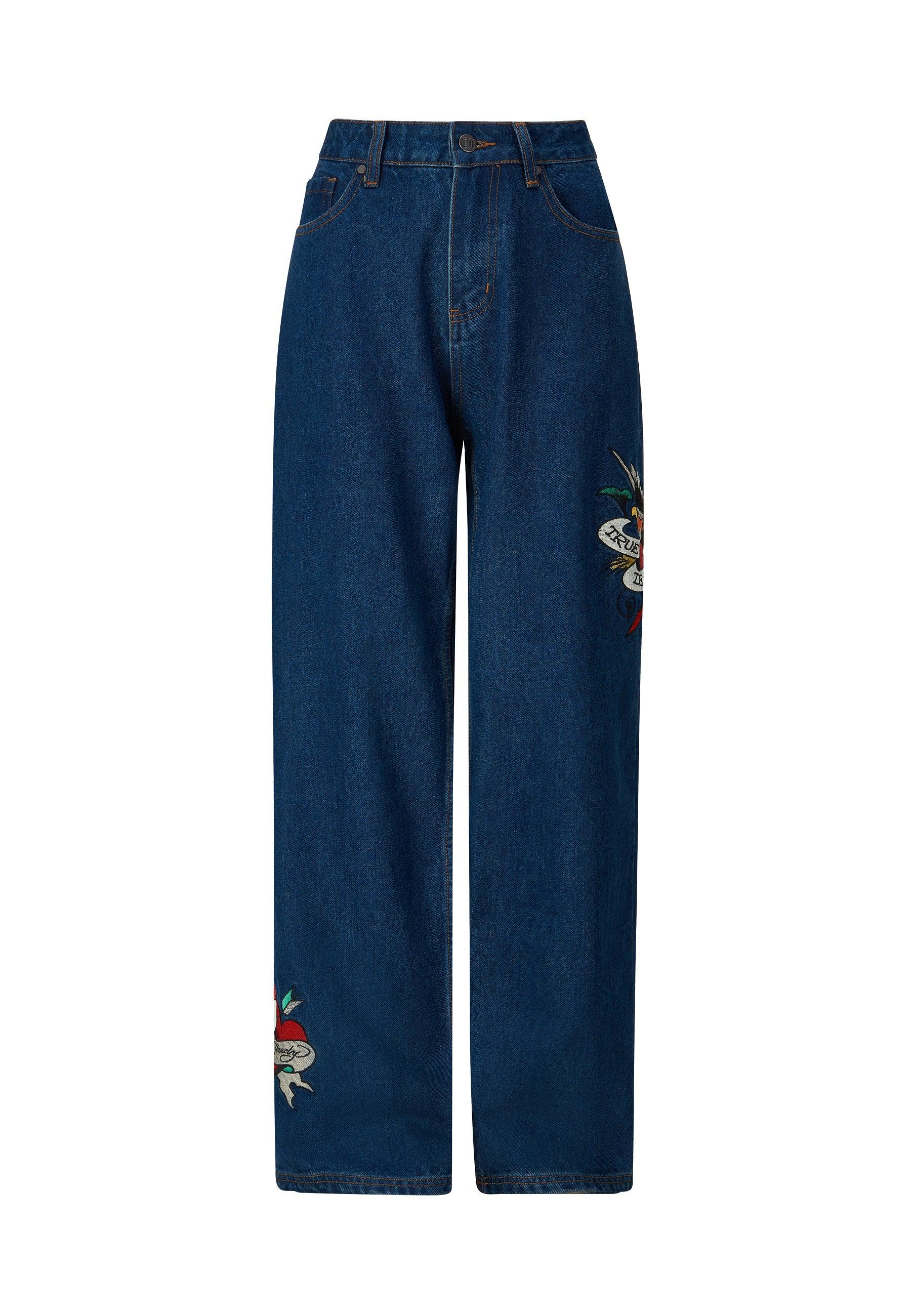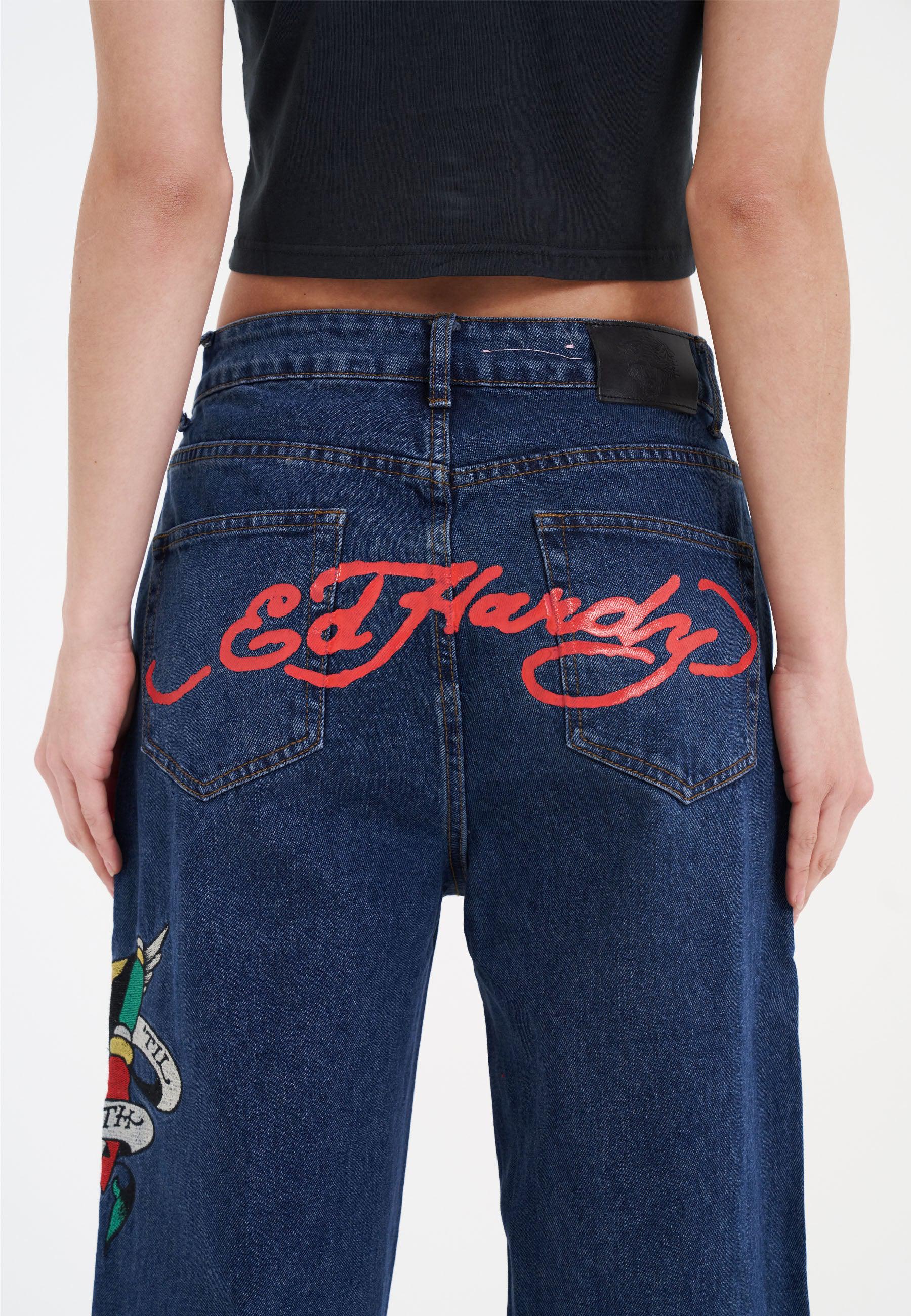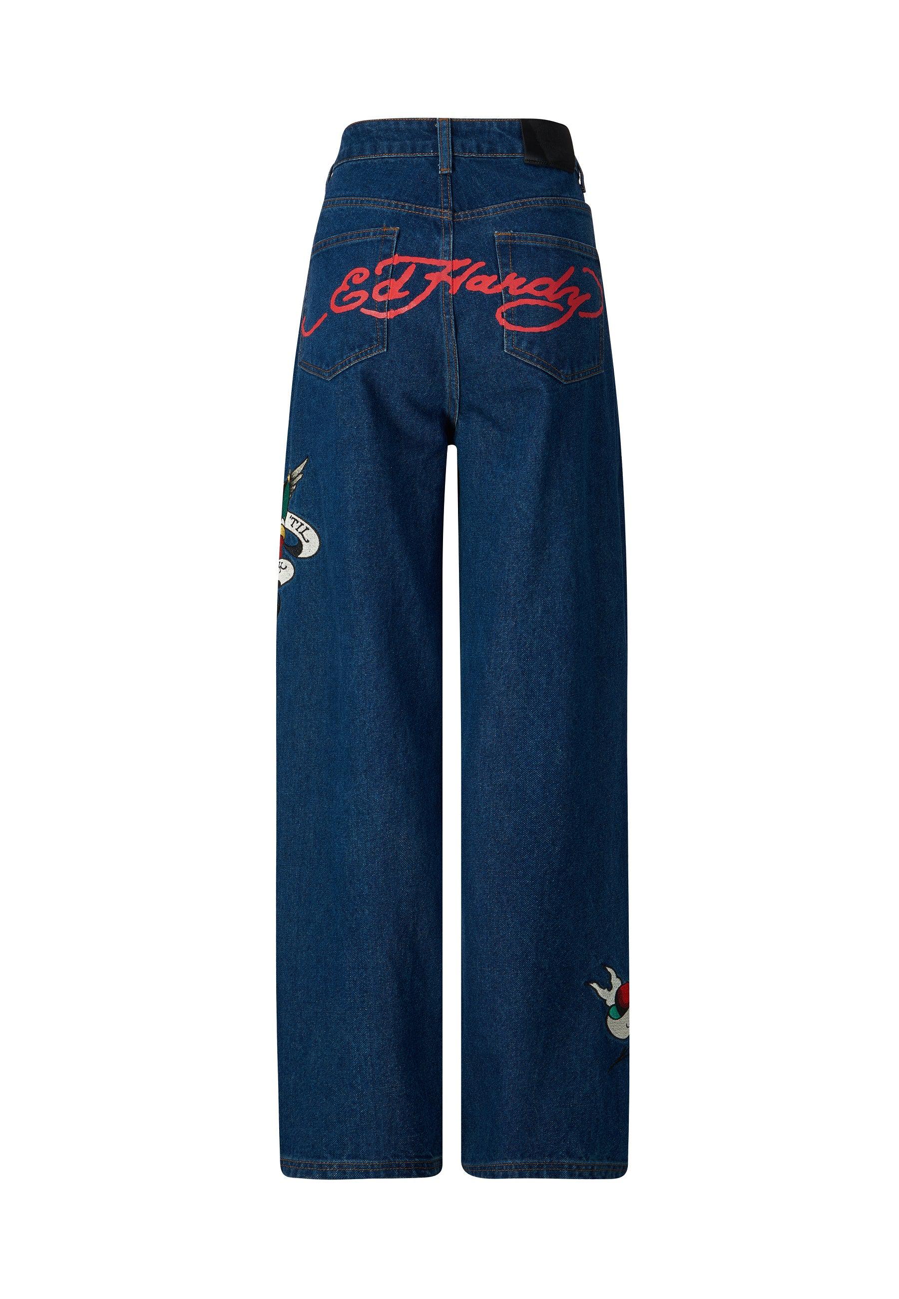Cortado em uma silhueta lisonjeira, mas casual, o jeans relaxado True Til Death apresenta a ilustração clássica da tatuagem do coração True Til Death, faca e falcão bordados na coxa esquerda e A assinatura icônica de Don Corleone na parte traseira.