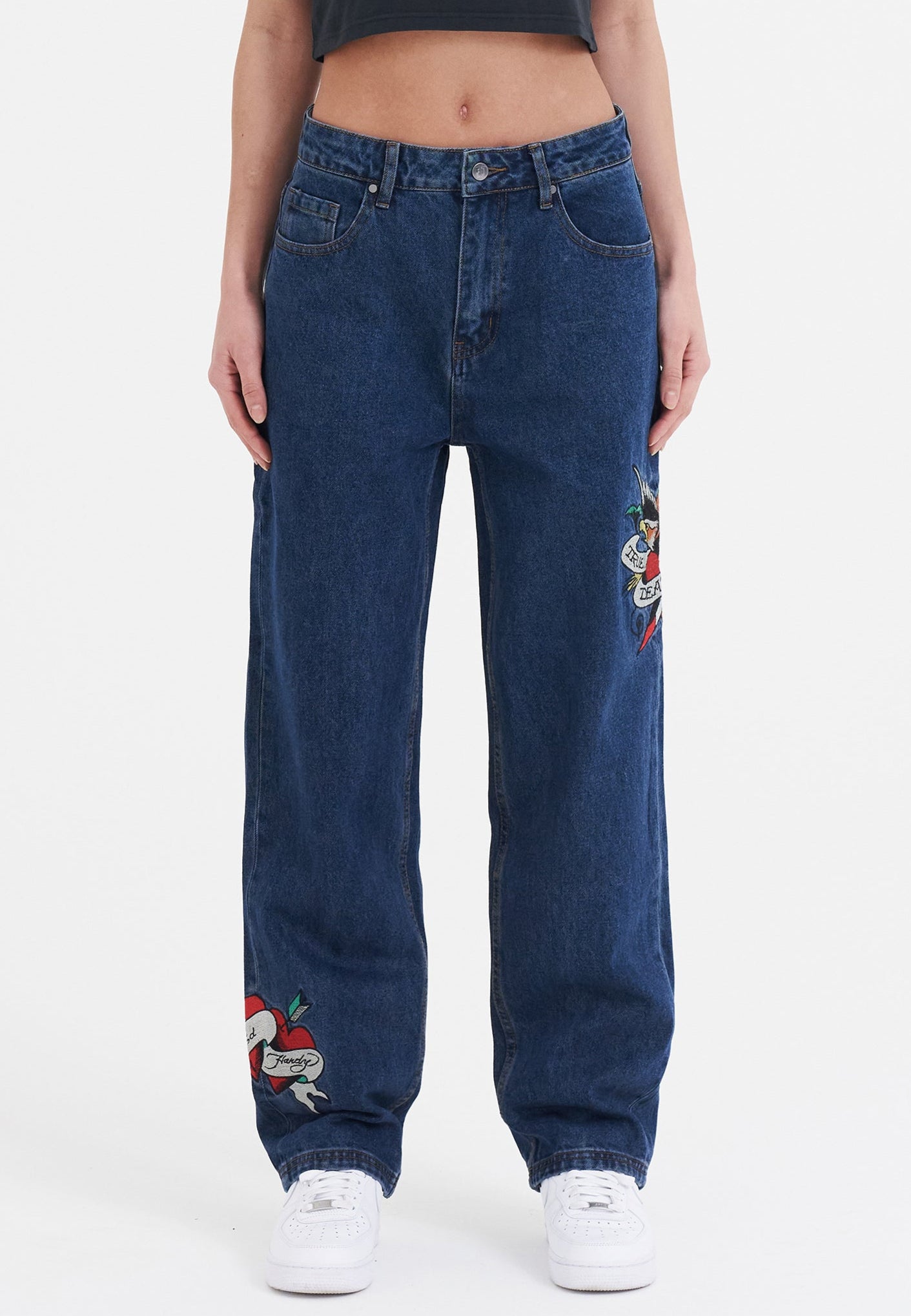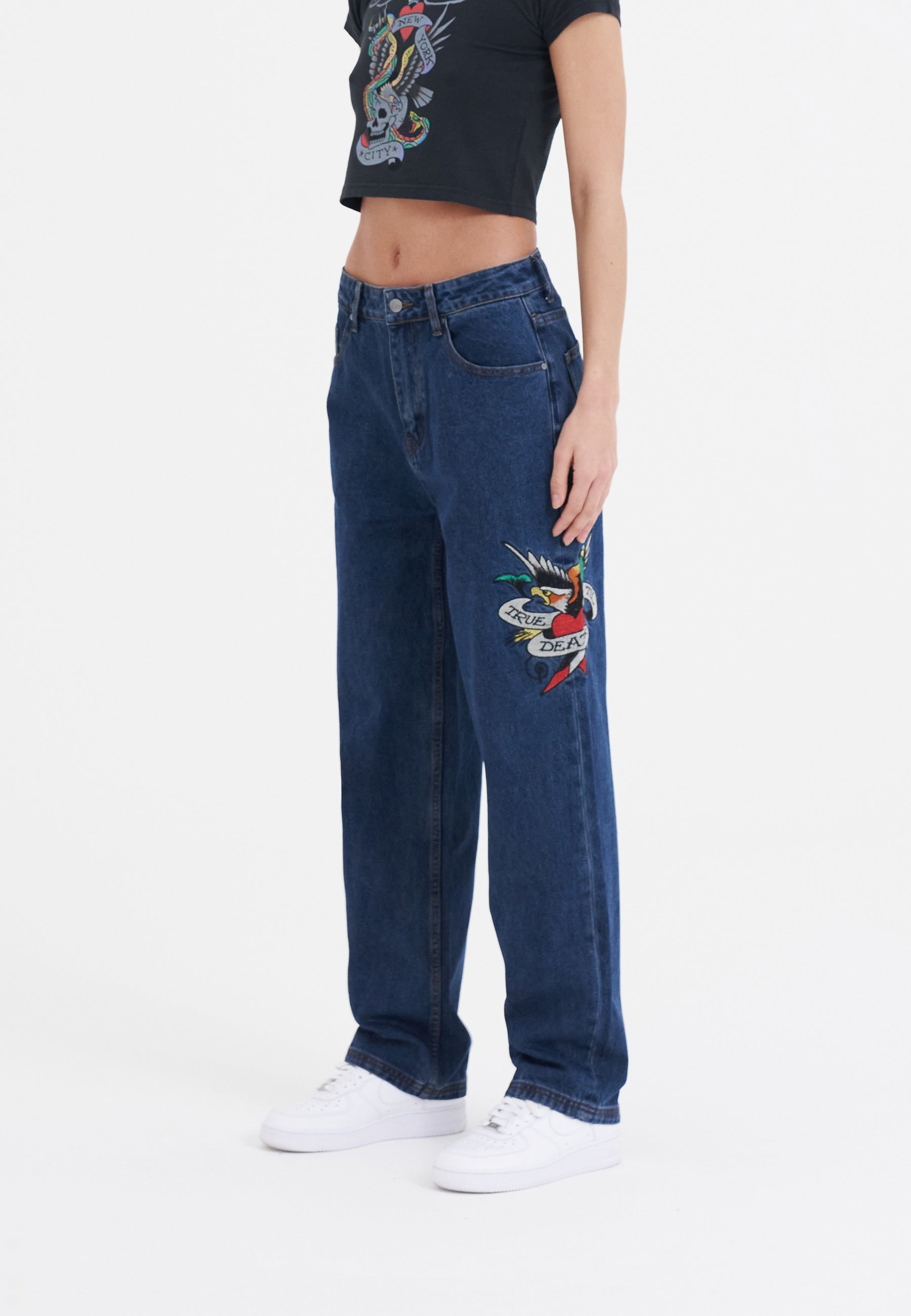 O jeans índigo 100% algodão em um corte descontraído dos anos 90 faz com que o True Til Death goteje com estilo streetwear.
