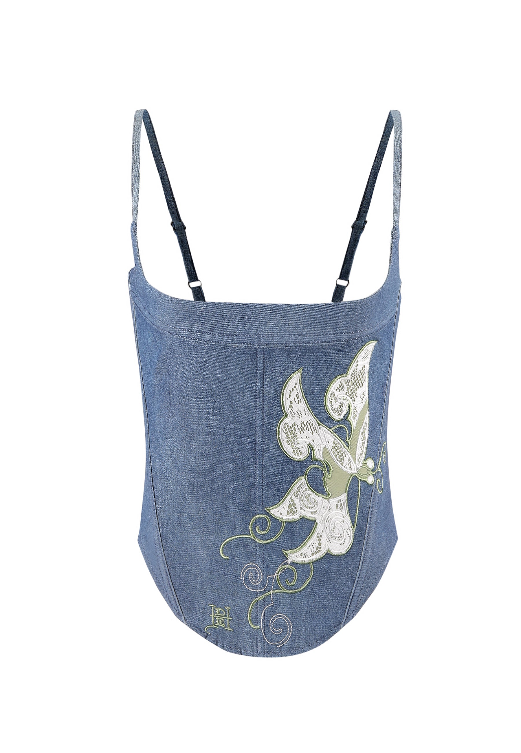 Wear your art with the Antique Applique Patch Denim Corset Top. This top features washed indigo denim and an intricate, antique applique butterfly graphic.