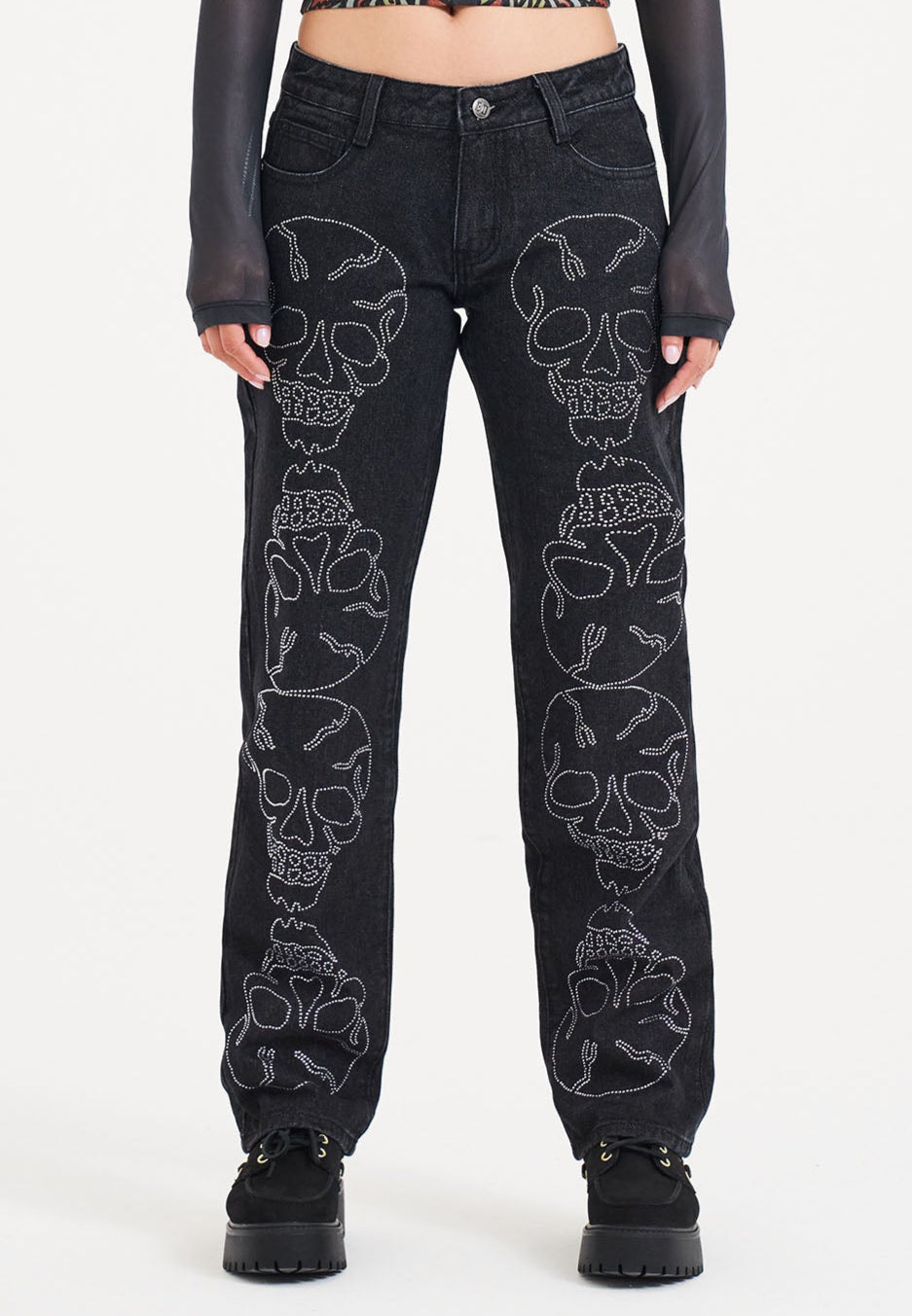 Womens Crystal Skull Straight Leg Denim Trousers Jeans - Black