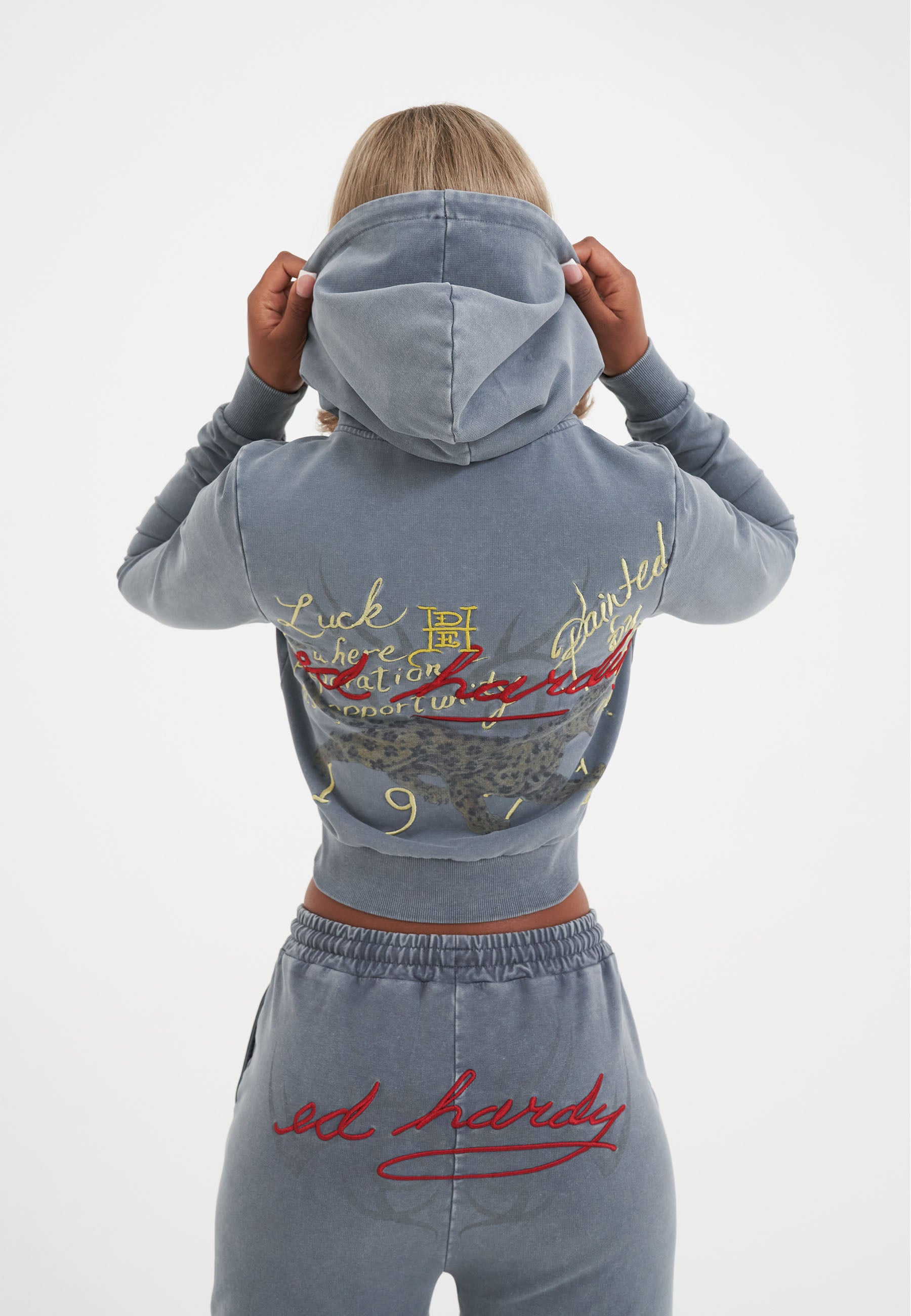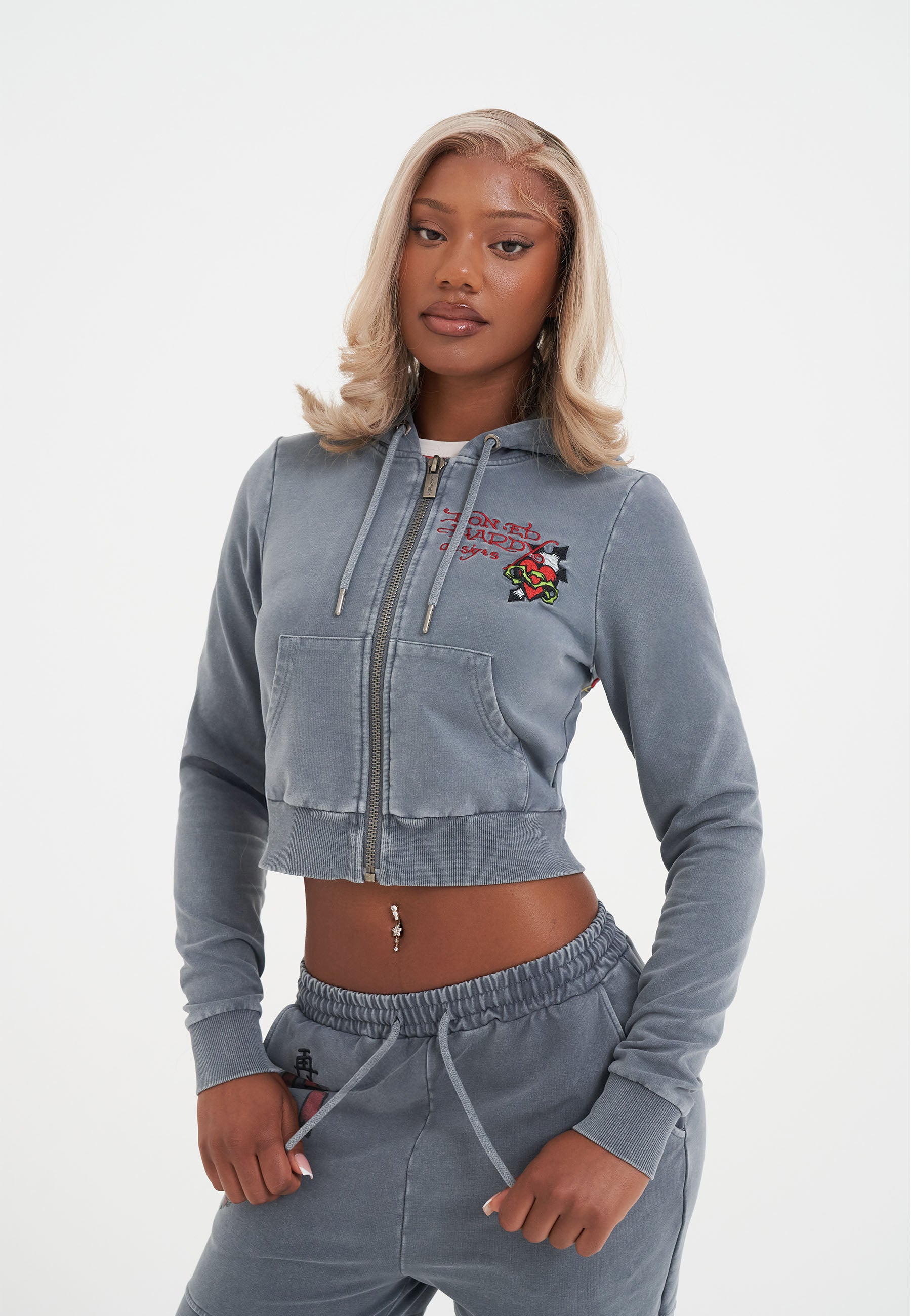 WOMENS FLAMING TIGER CROPPED ZIP THRU HOODIE in Charcoal