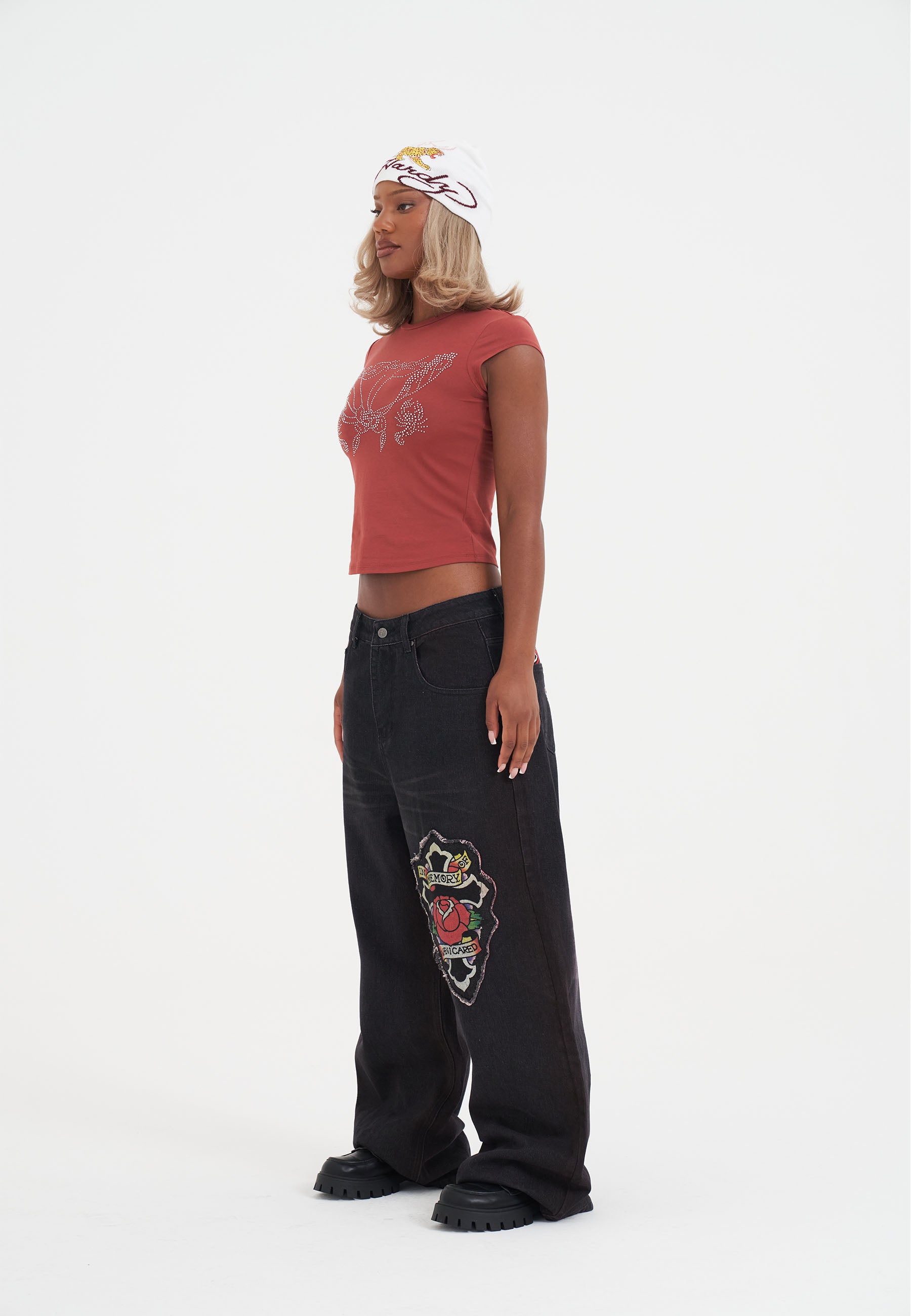 - RAW EDGE DENIM APPLIQUE WITH CROSS AND HEART TATTOO PRINT