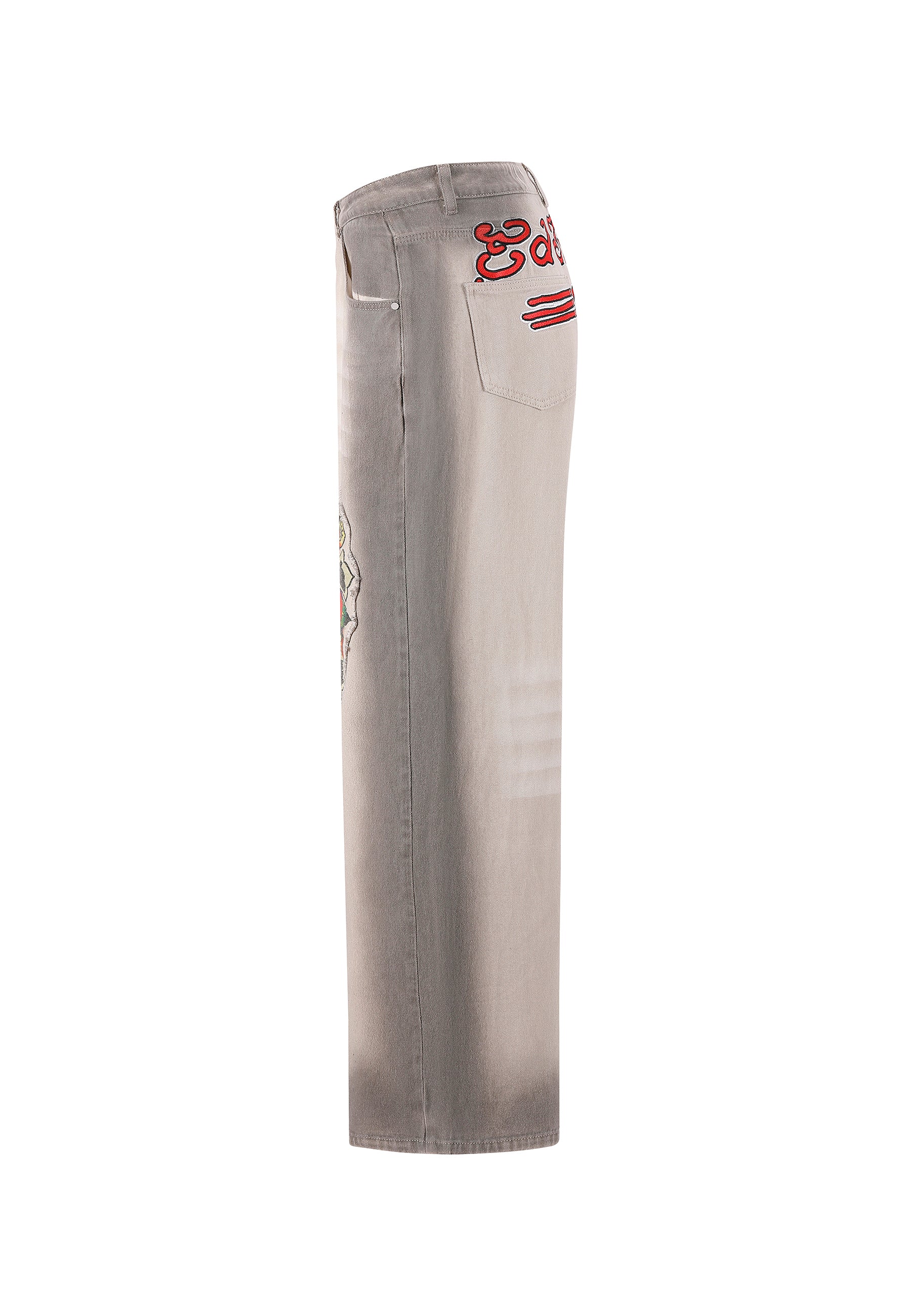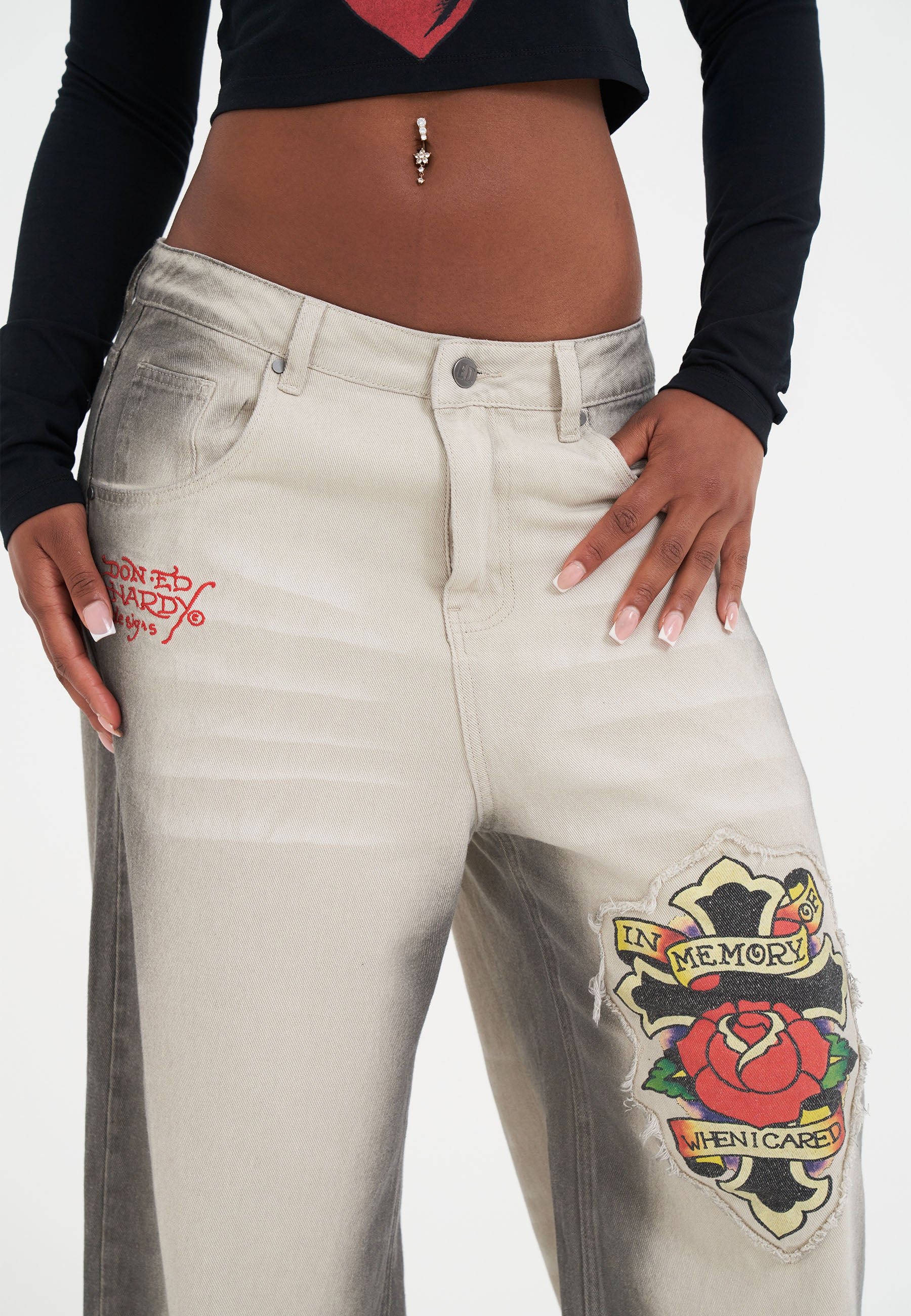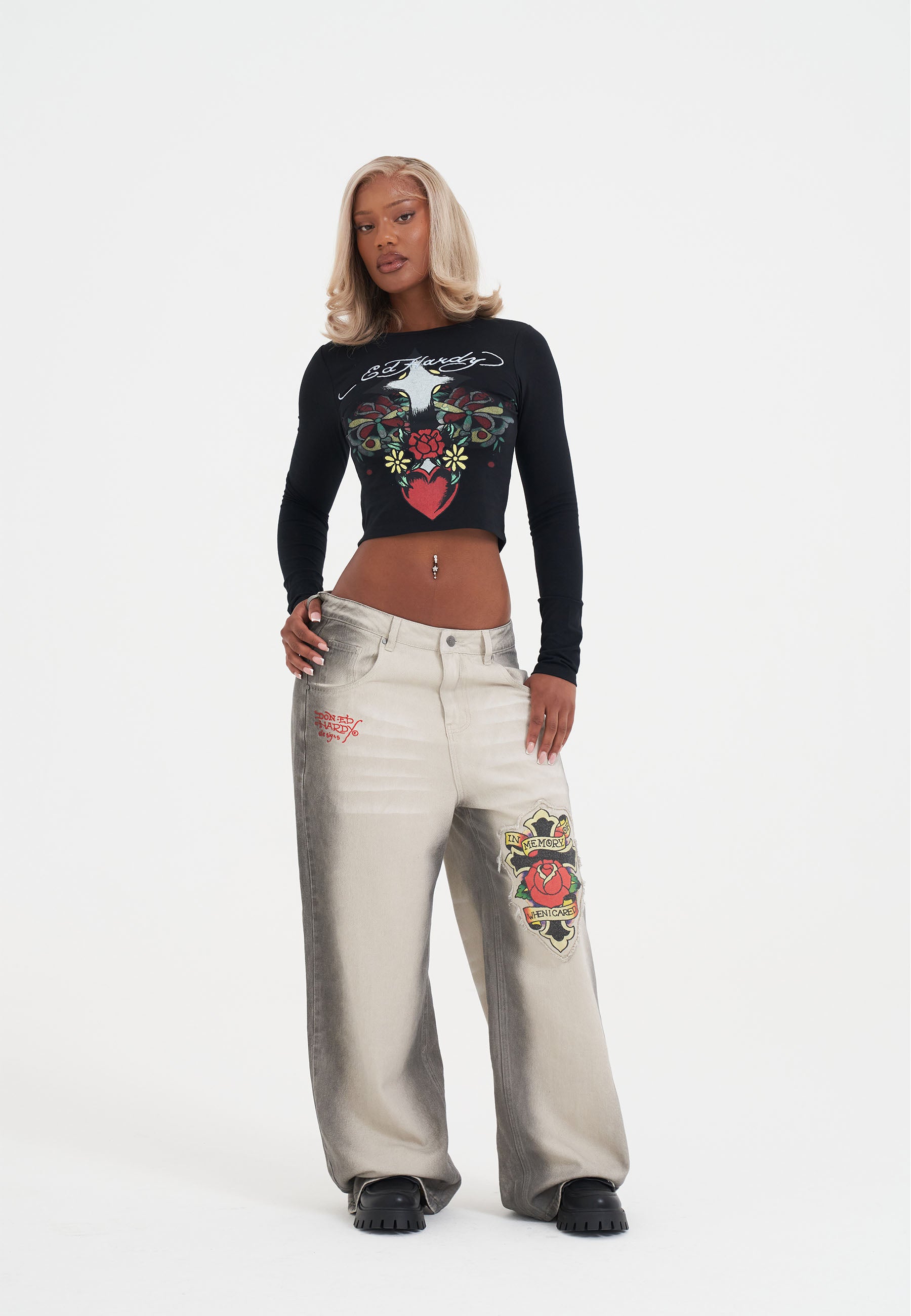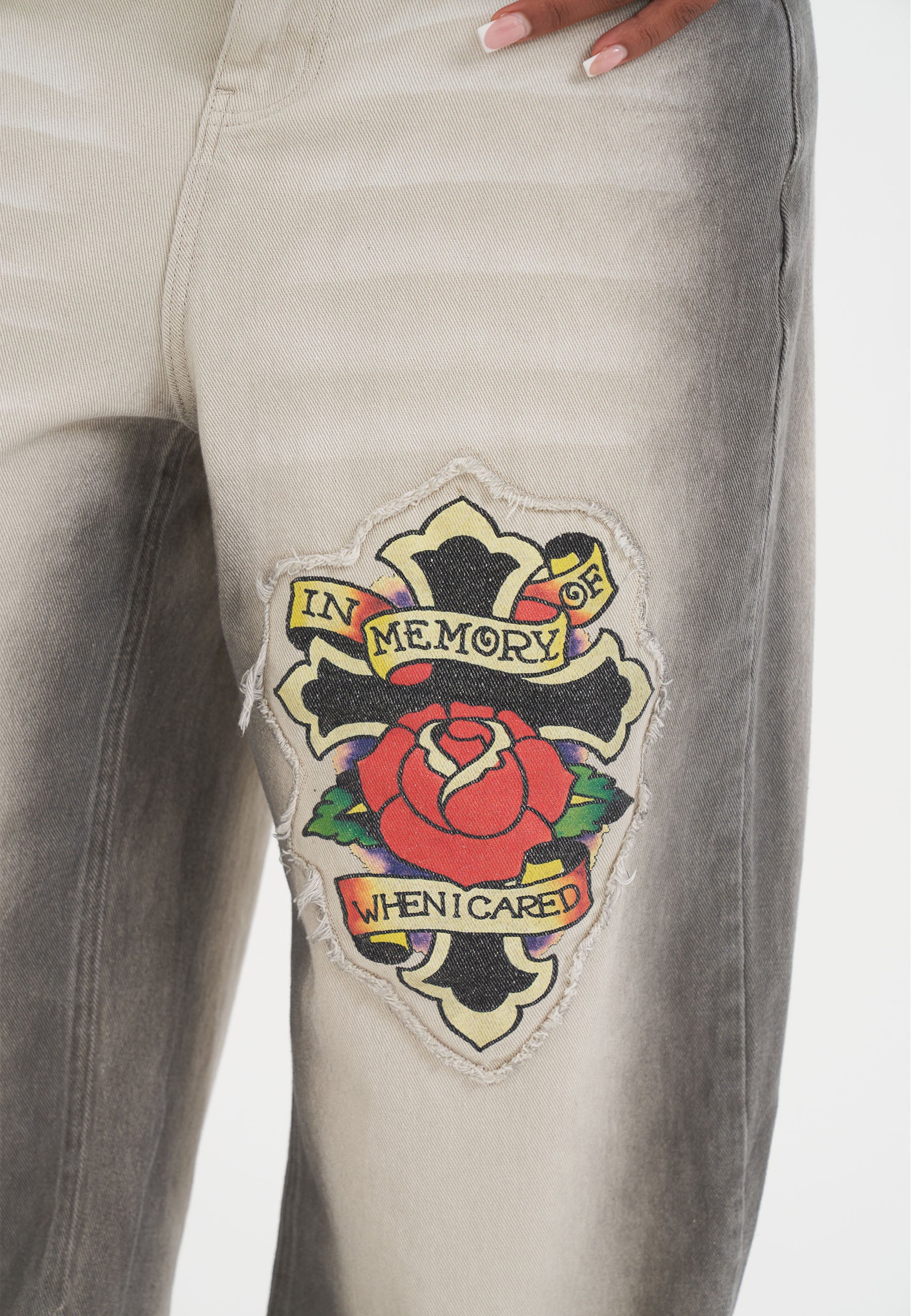 - RAW EDGE DENIM APPLIQUE WITH CROSS AND HEART TATTOO PRINT