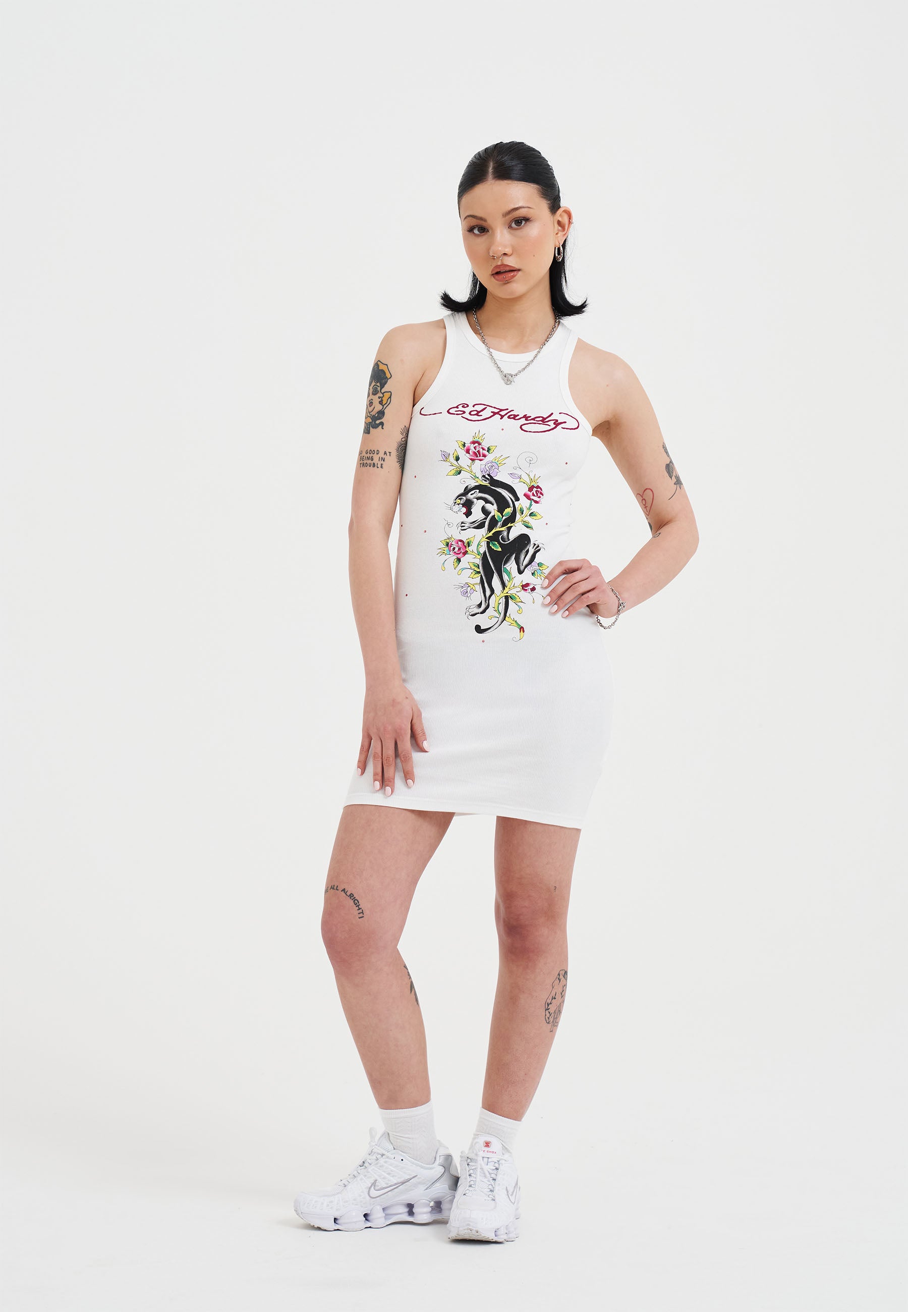 Womens Panther And Flowers Diamante Tank Dress - White