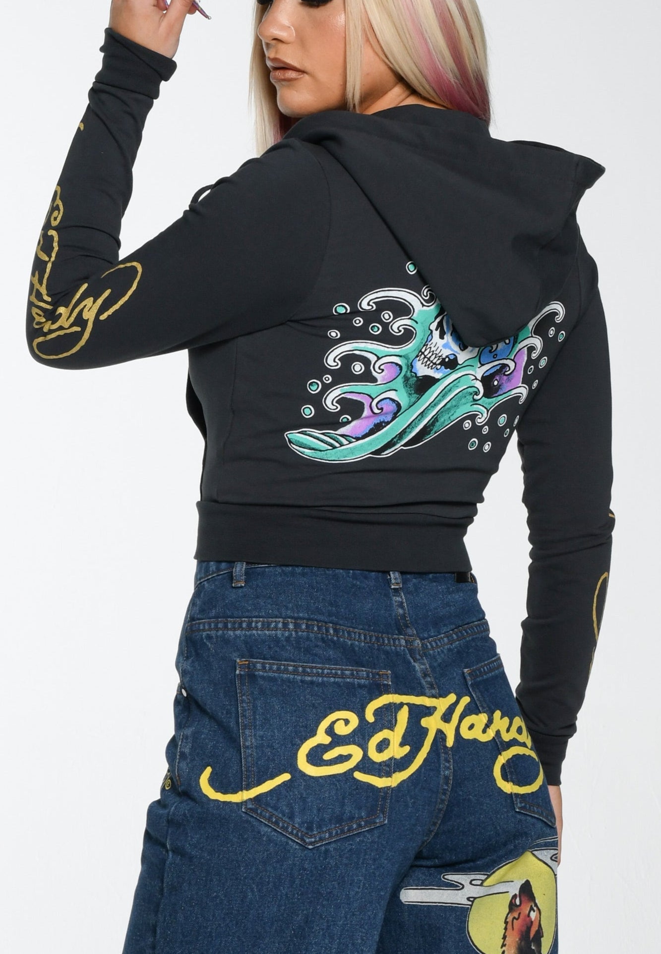 Womens Pray-For-Surf Cropped Graphic Zip Through Hoodie - Charcoal