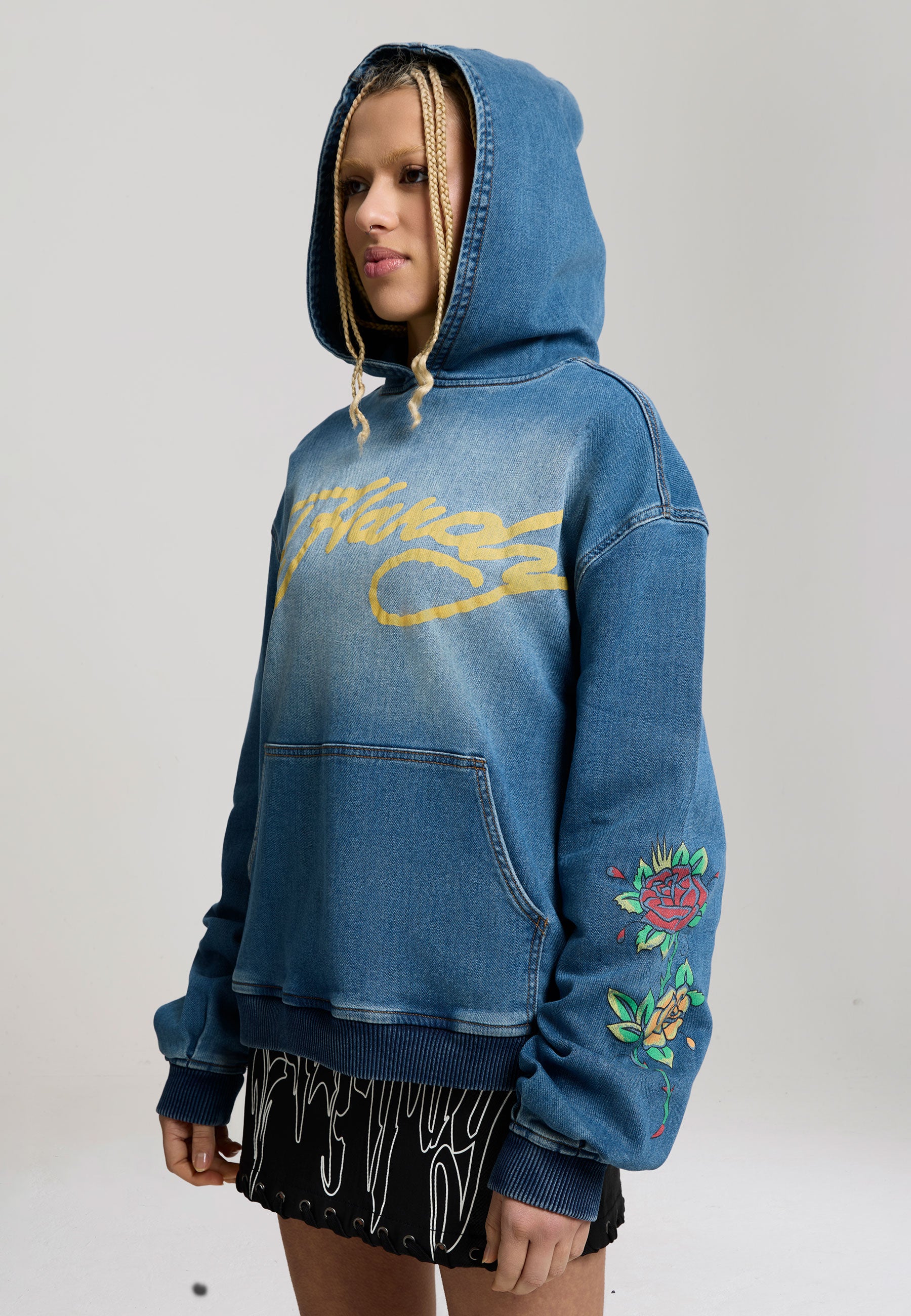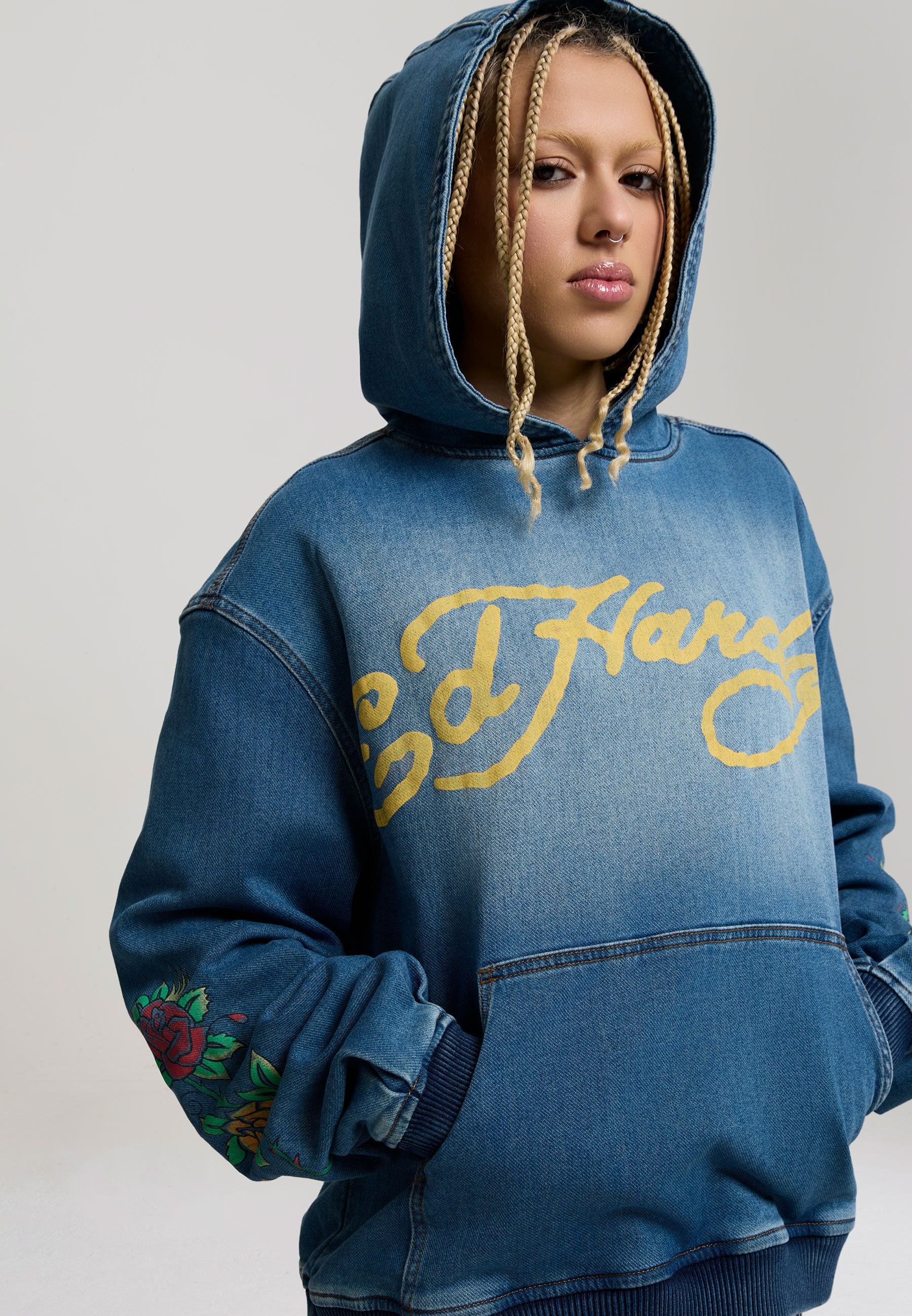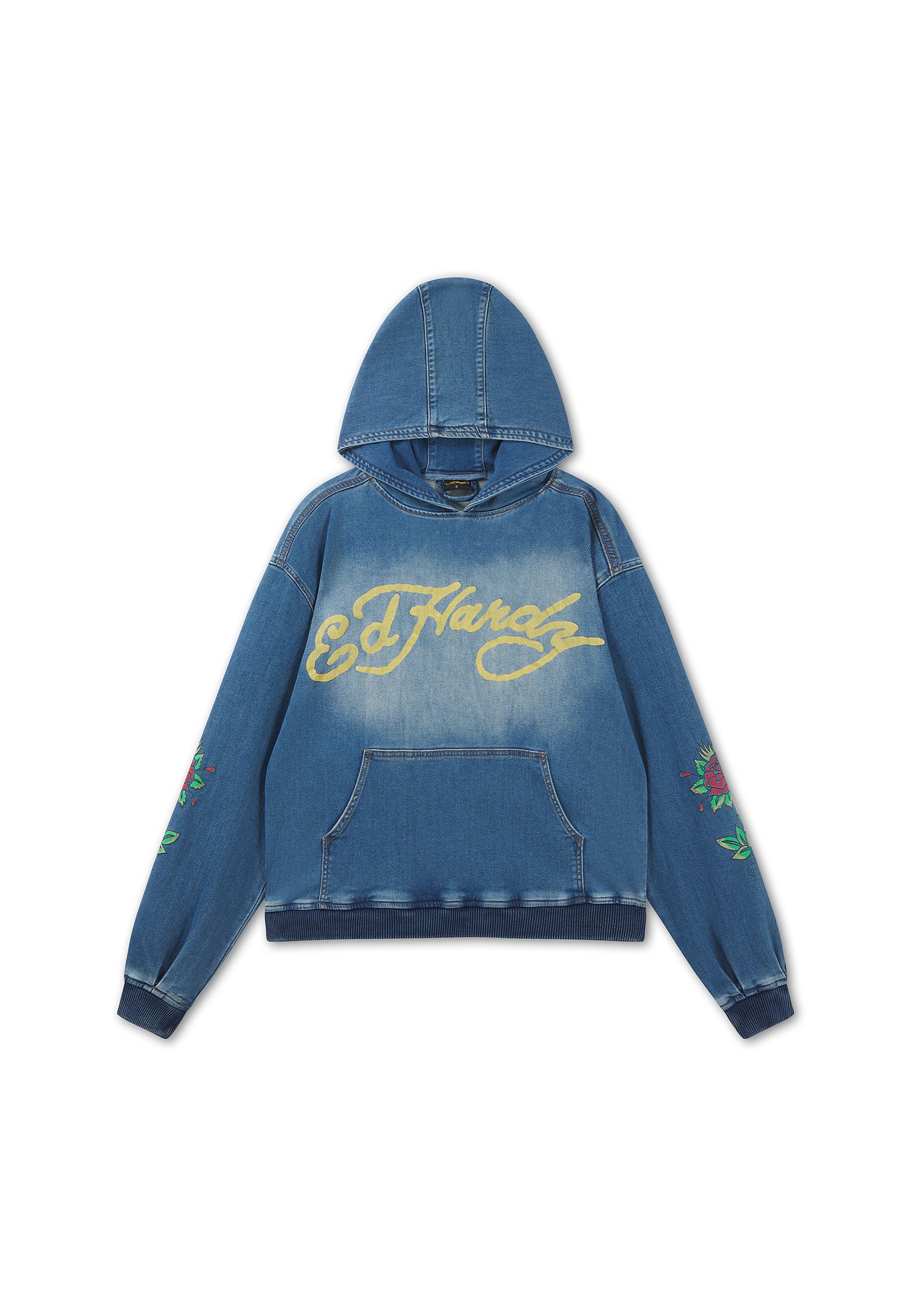 RELAXED FIT VINTAGE BLEACH WASH 63% COTTON 16% POLYESTER 1% ELASTANE ED HARDY SIGNATURE PRINT TO FRONT FLORAL PRINT TO BOTH SLEEVES BACK GRAPHIC IN PRINT LONG SLEEVE KANGAROO POCKET 3 PANEL HOOD