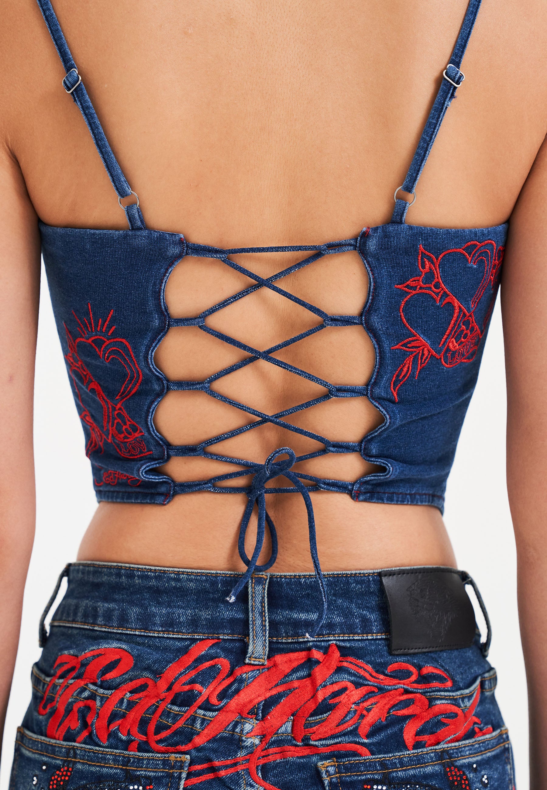 This indigo corset top features a striking red heart graphic that channels Ed Hardy’s bold tattoo artistry. Designed for a tight fit, it’s crafted from washed denim for a vintage feel. Adjustable straps and a lace-up back ensure a perfectly flattering fit that doesn’t compromise on style.