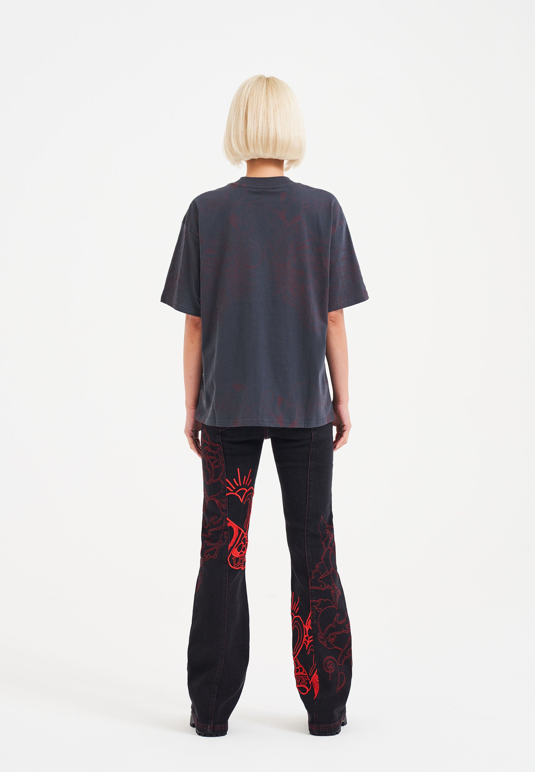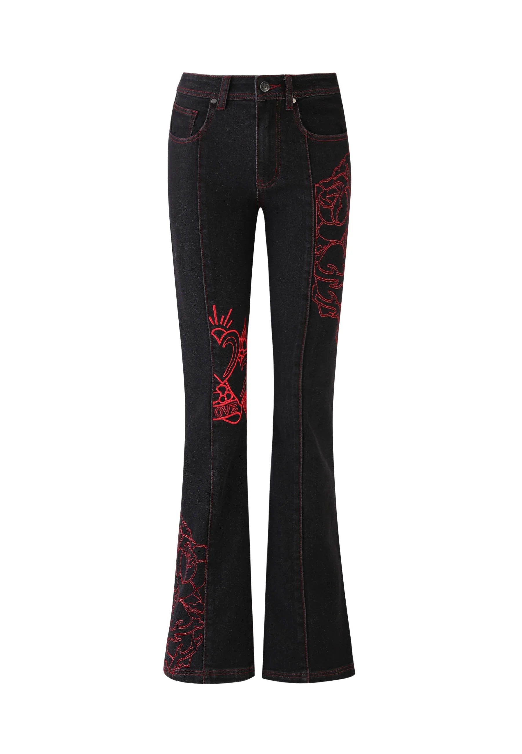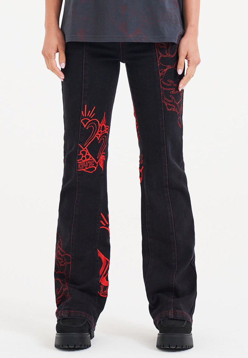 Womens Rouge Hearts Flared Denim Trousers Jeans - Black