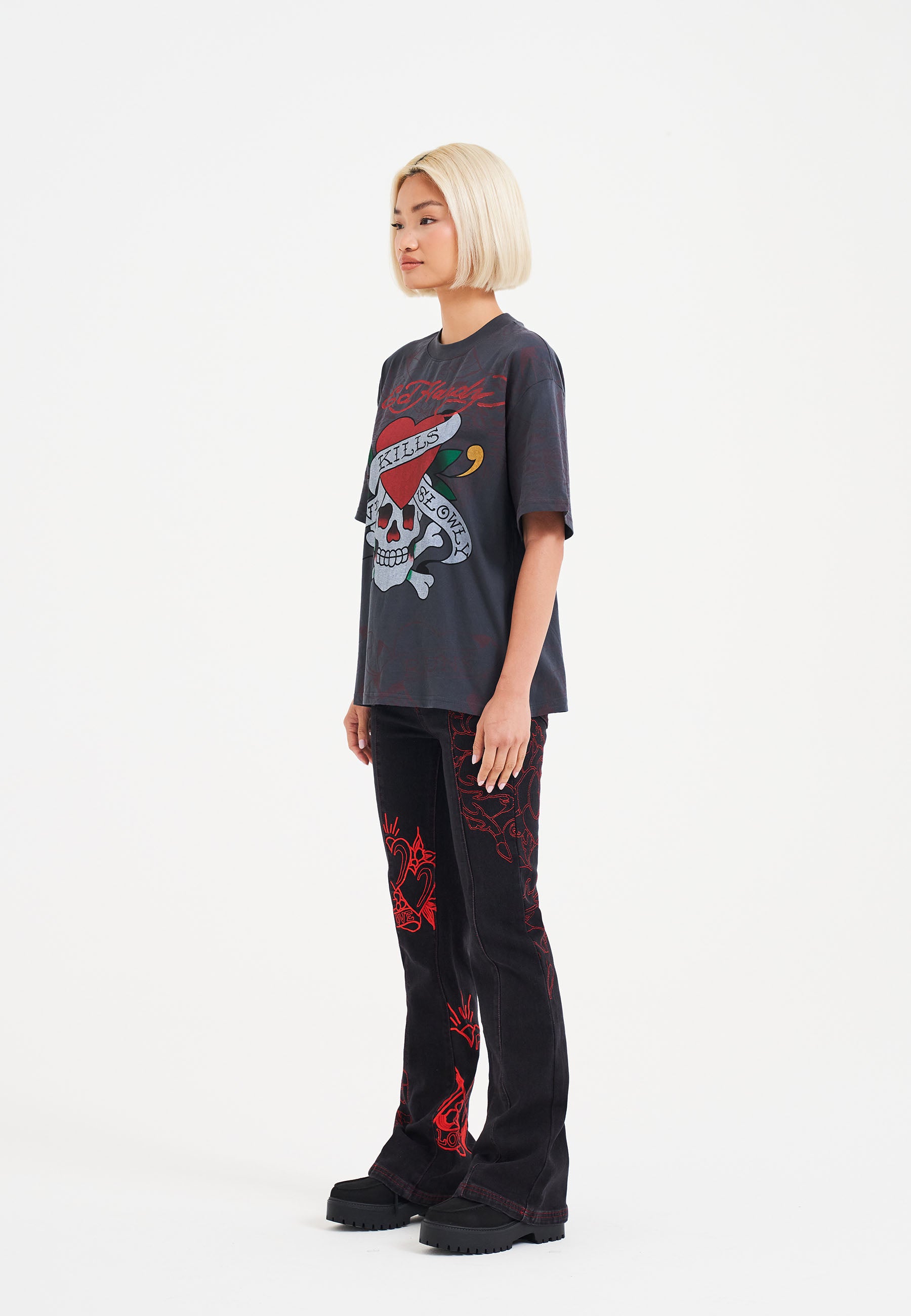 These black flared jeans offer an extra tight fit that accentuates your silhouette. Featuring bold red heart embroidery and chain stitch detailing, these jeans embody Ed Hardy's iconic graphic style. The design includes panel embroidery, contrast stitching, and center-front seams for added flair. Finished with two front pockets, the Ed Hardy signature on the yoke, and a leather embossed tag.