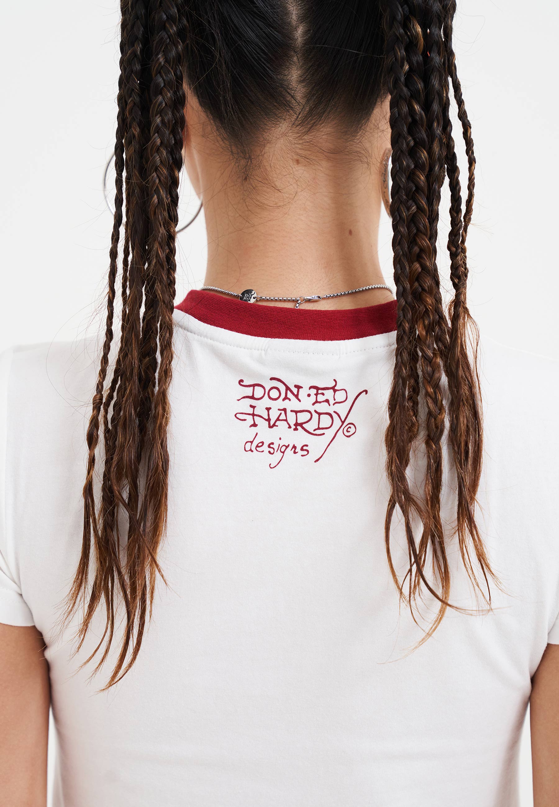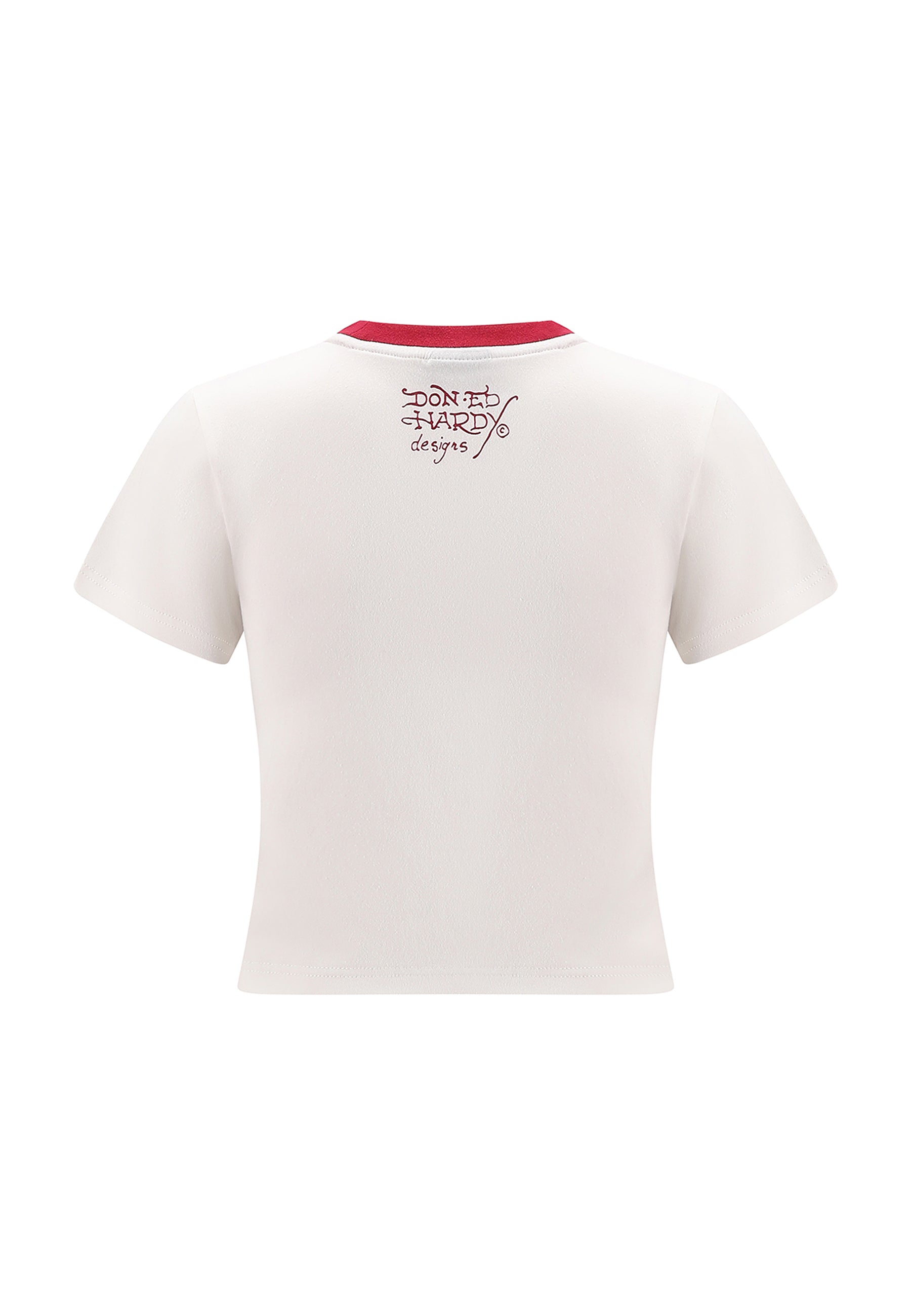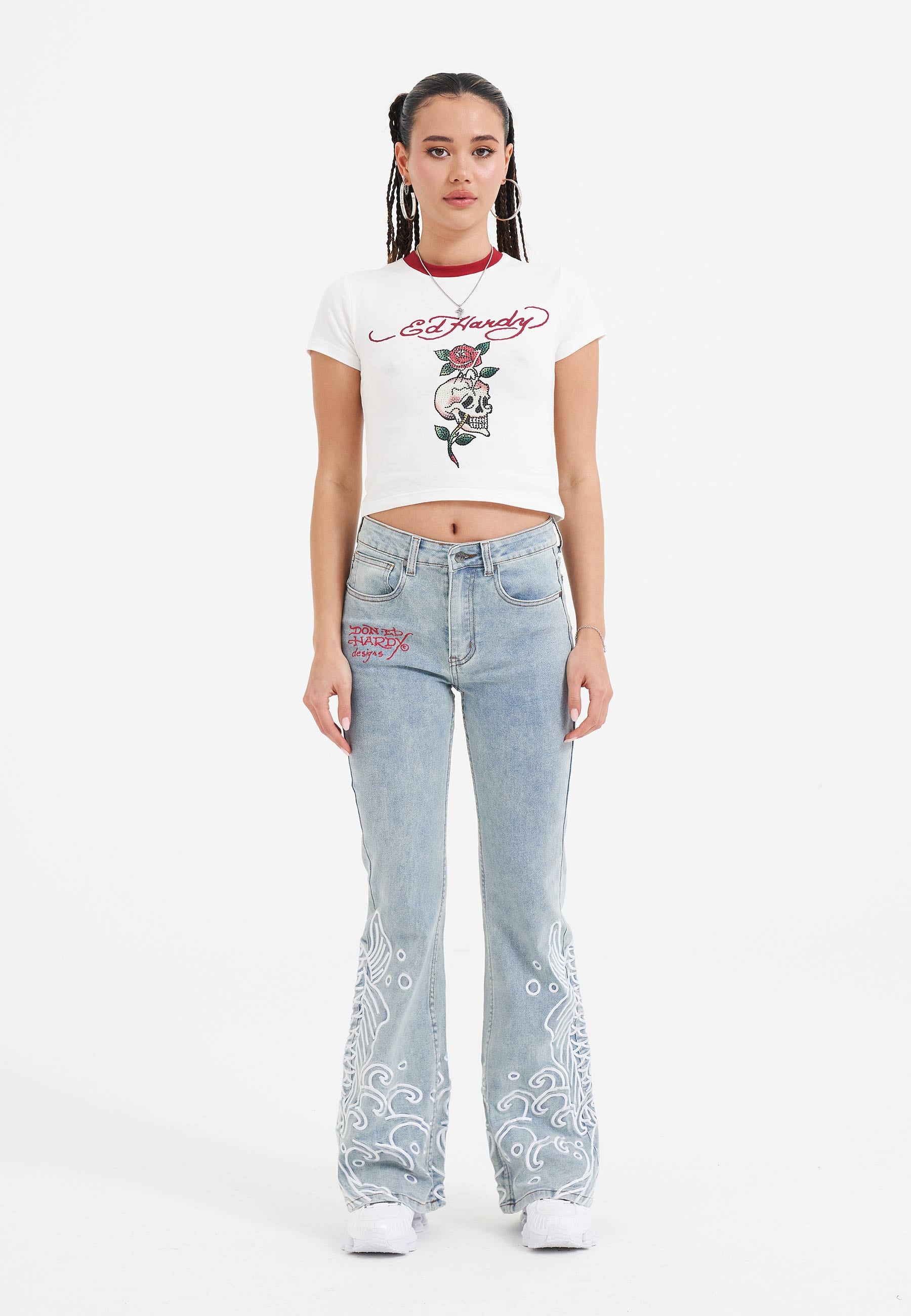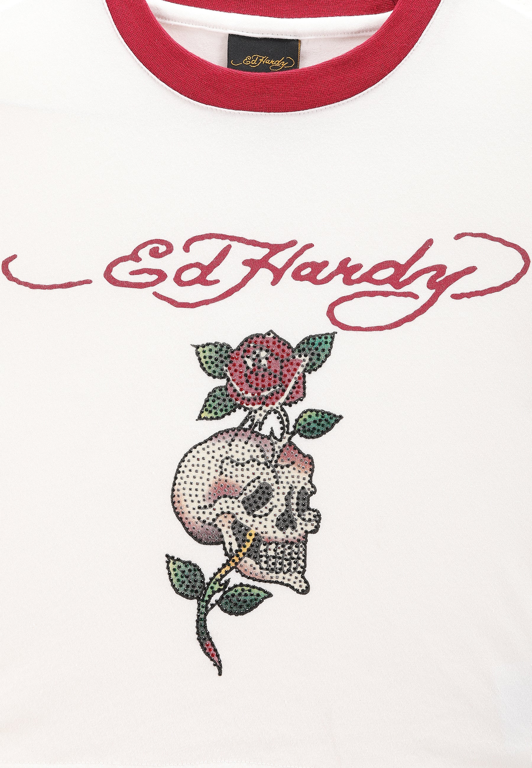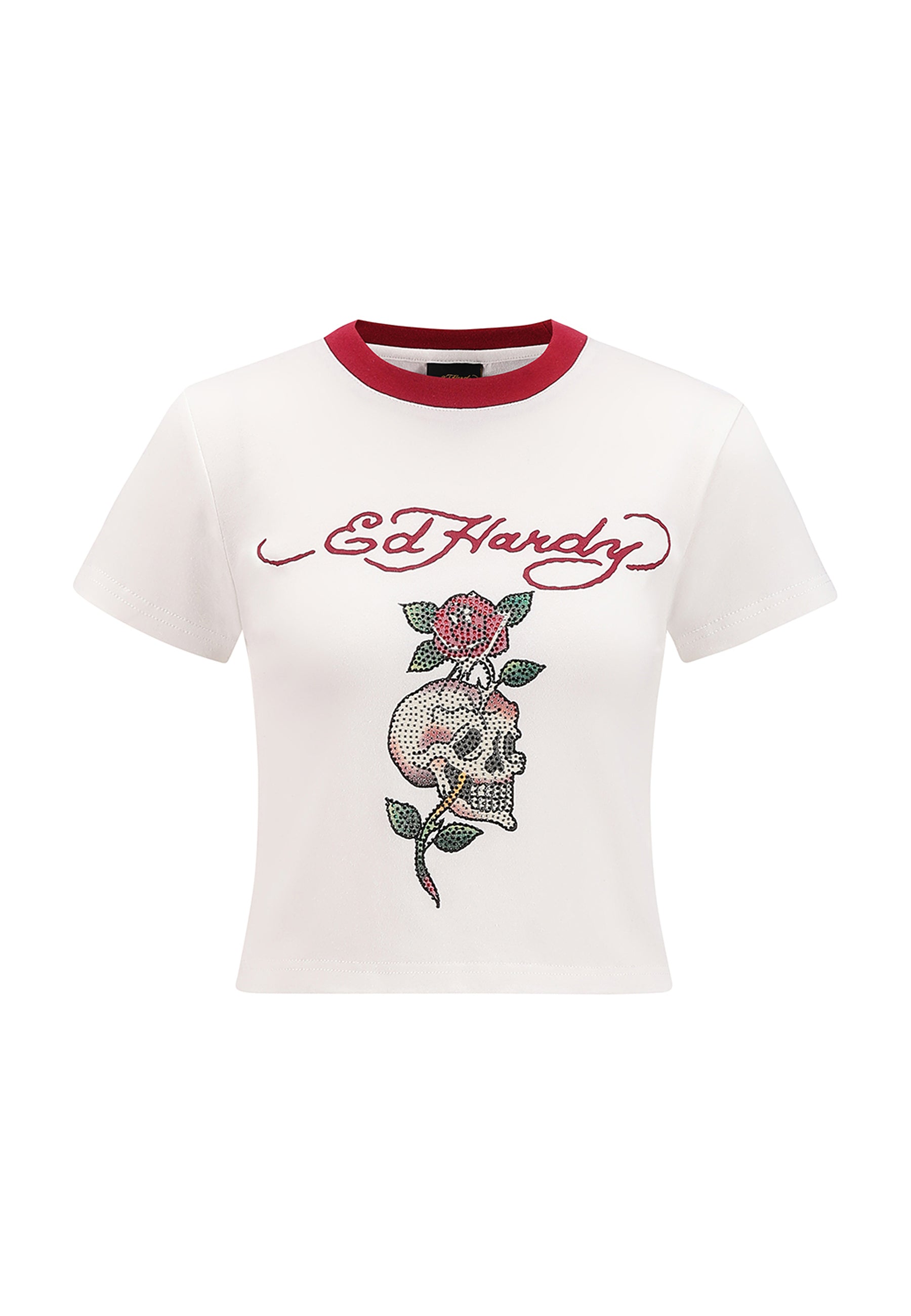 Womens Skull Rose Diamante Baby T-Shirt Top - White