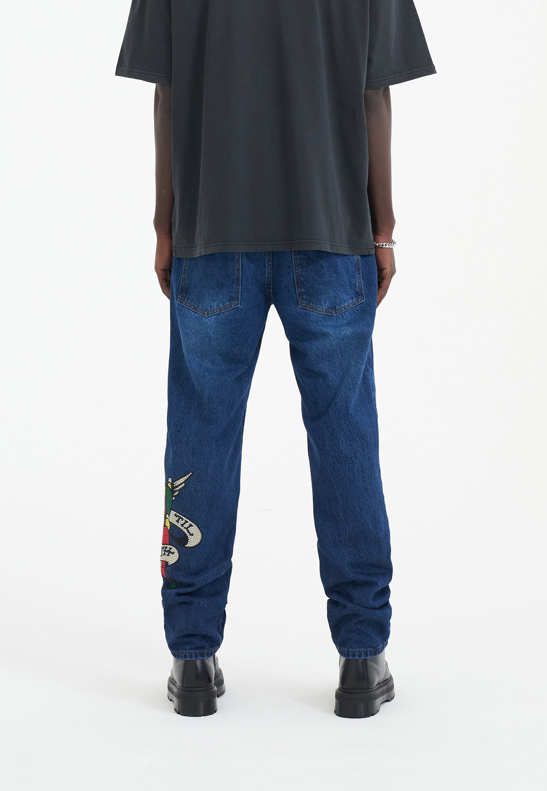 Mens True-Till-Death Diamante Denim Byxor Jeans - Indigo
