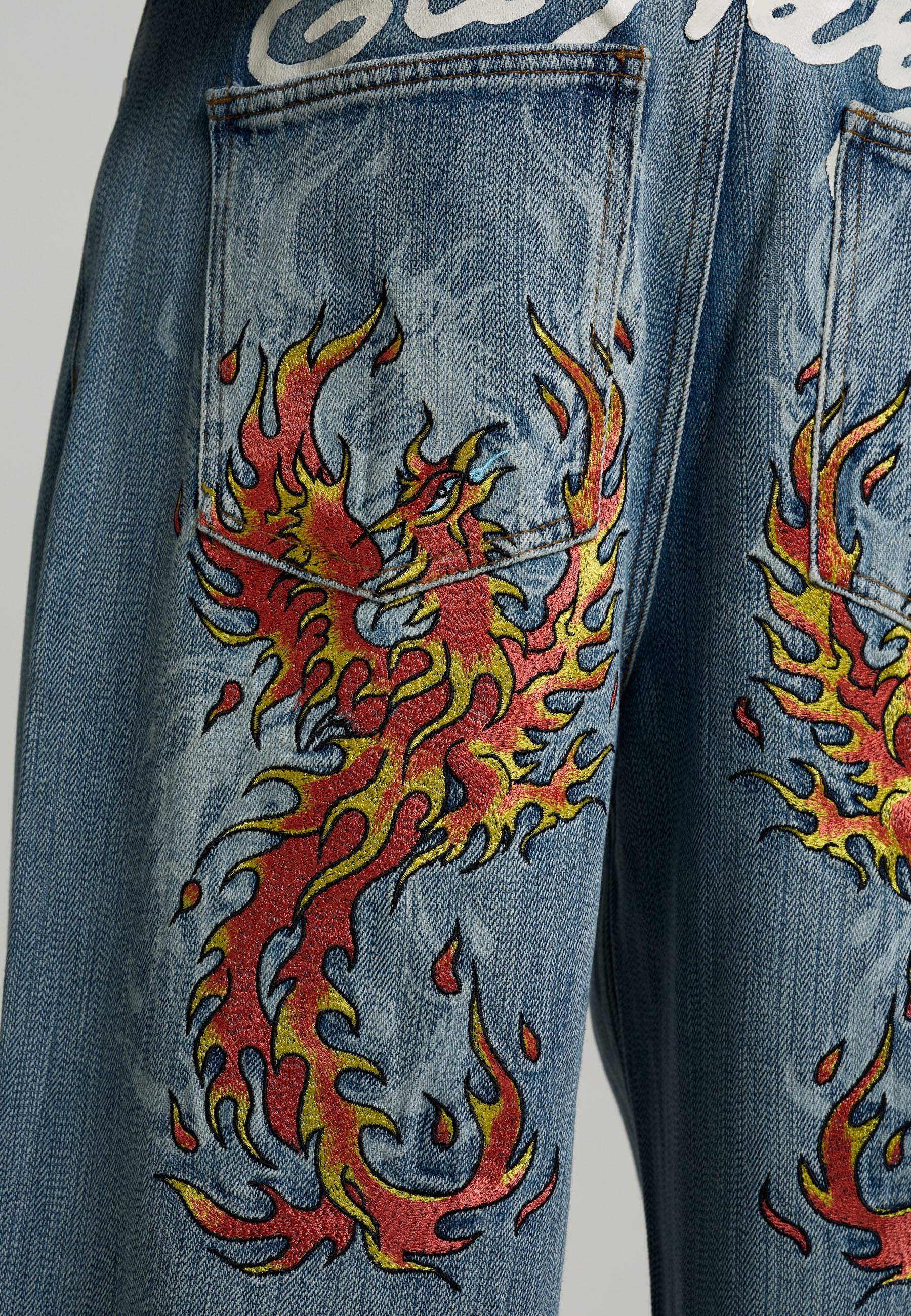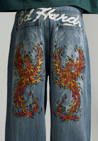 100% COTTON SLUB 12OZ XXTRA RELAXED FIT ED HARDY PRINT AT BACK FLAMING ANGEL EMBROIDERY DISTRESSED DETAIL
