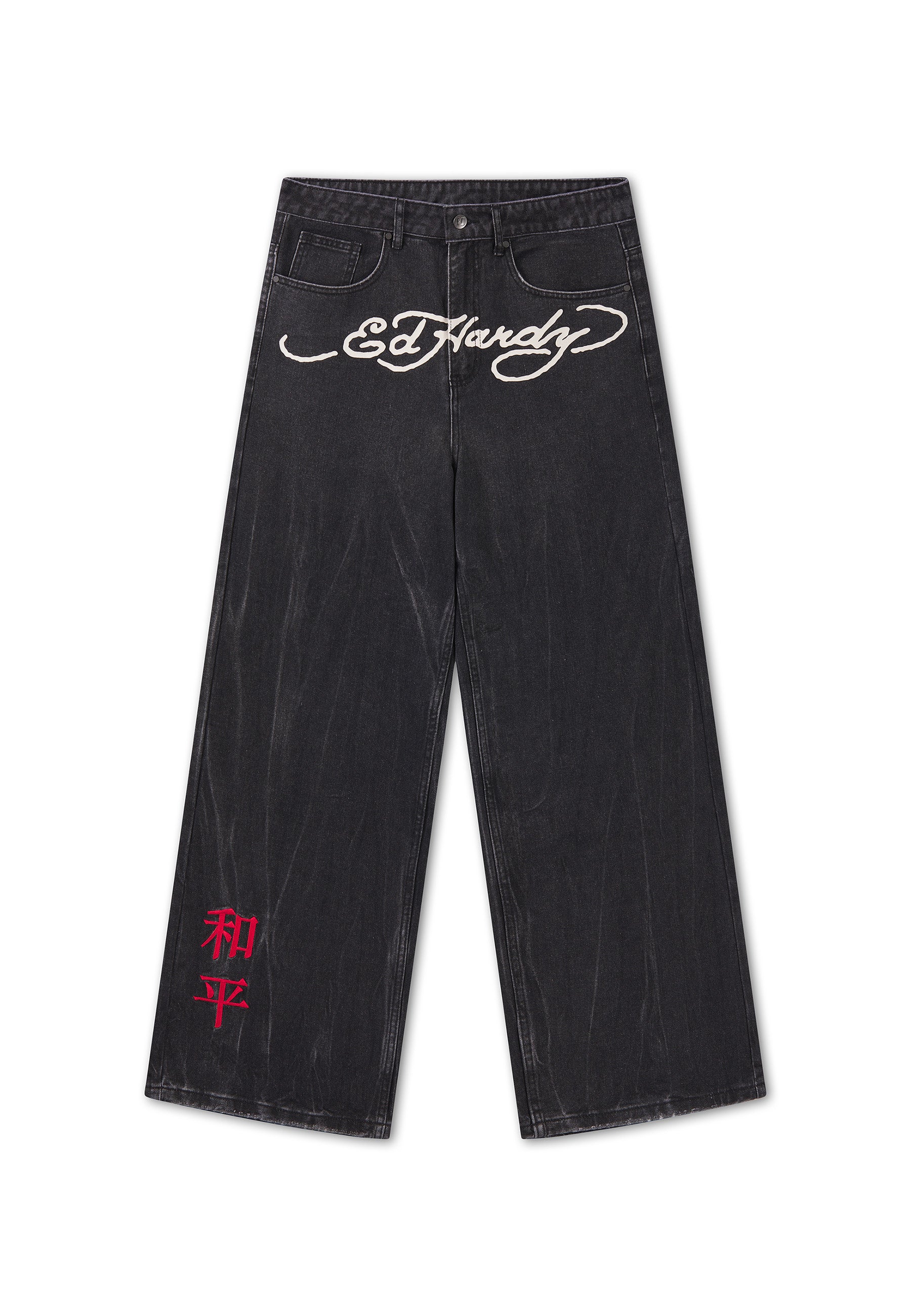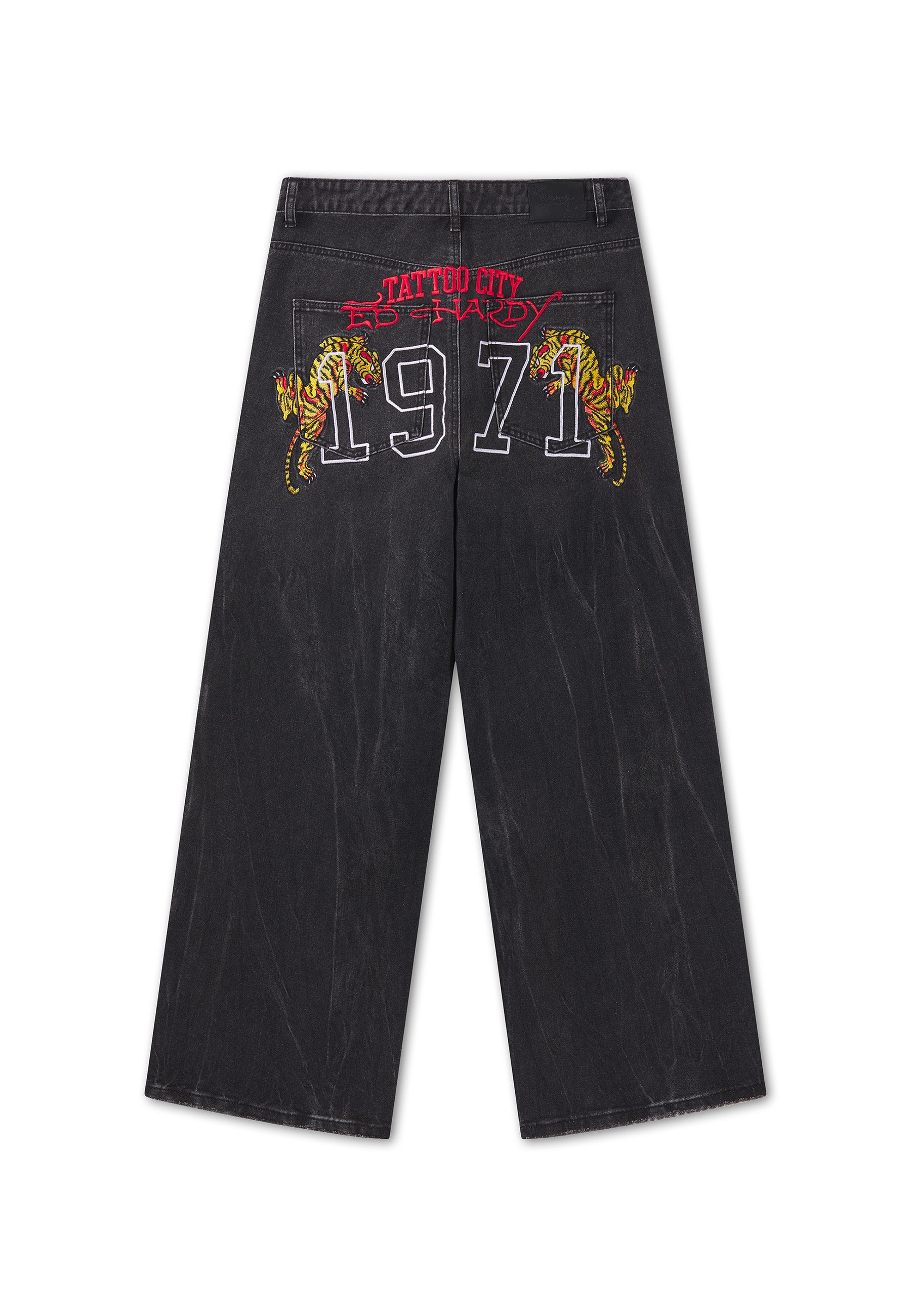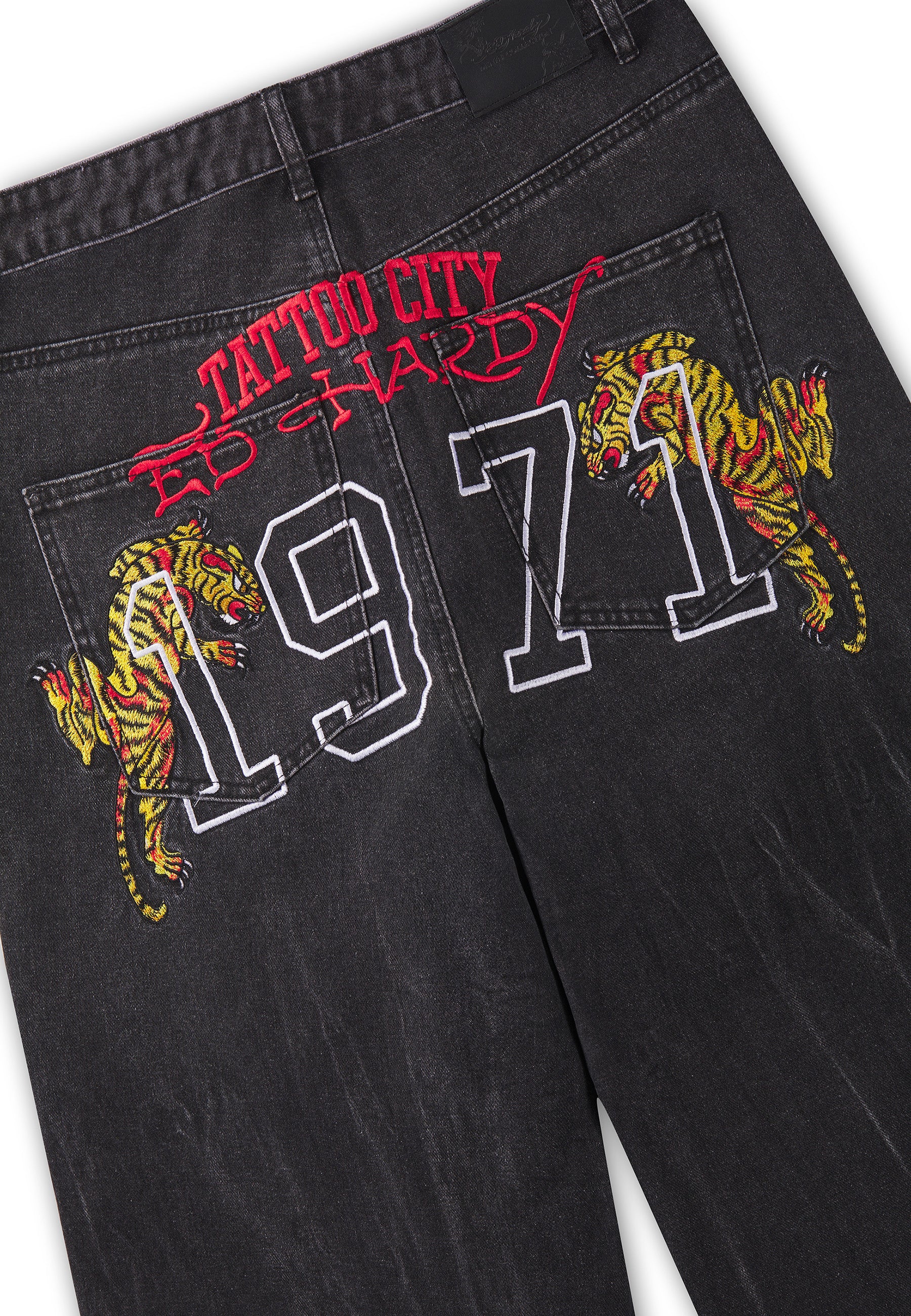 100% COTTON 12OZ XXTRA RELAXED FIT DISTRESSED WASH EMBROIDERED 1971 TIGER GRAPHIC PRINTED SIGNATURE ED HARDY LIGHT DISTRESSING BRANDED SHANK