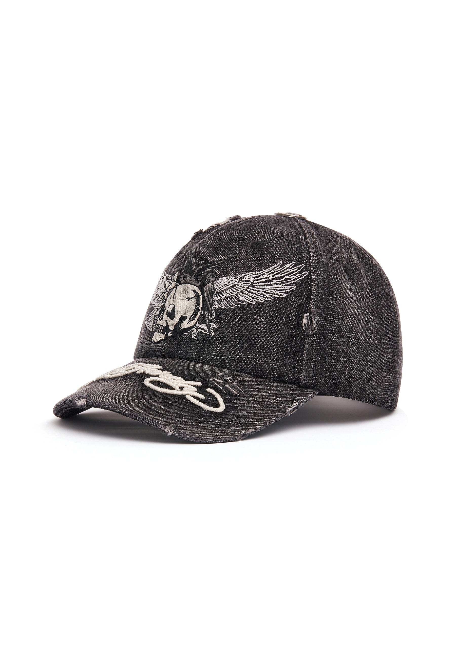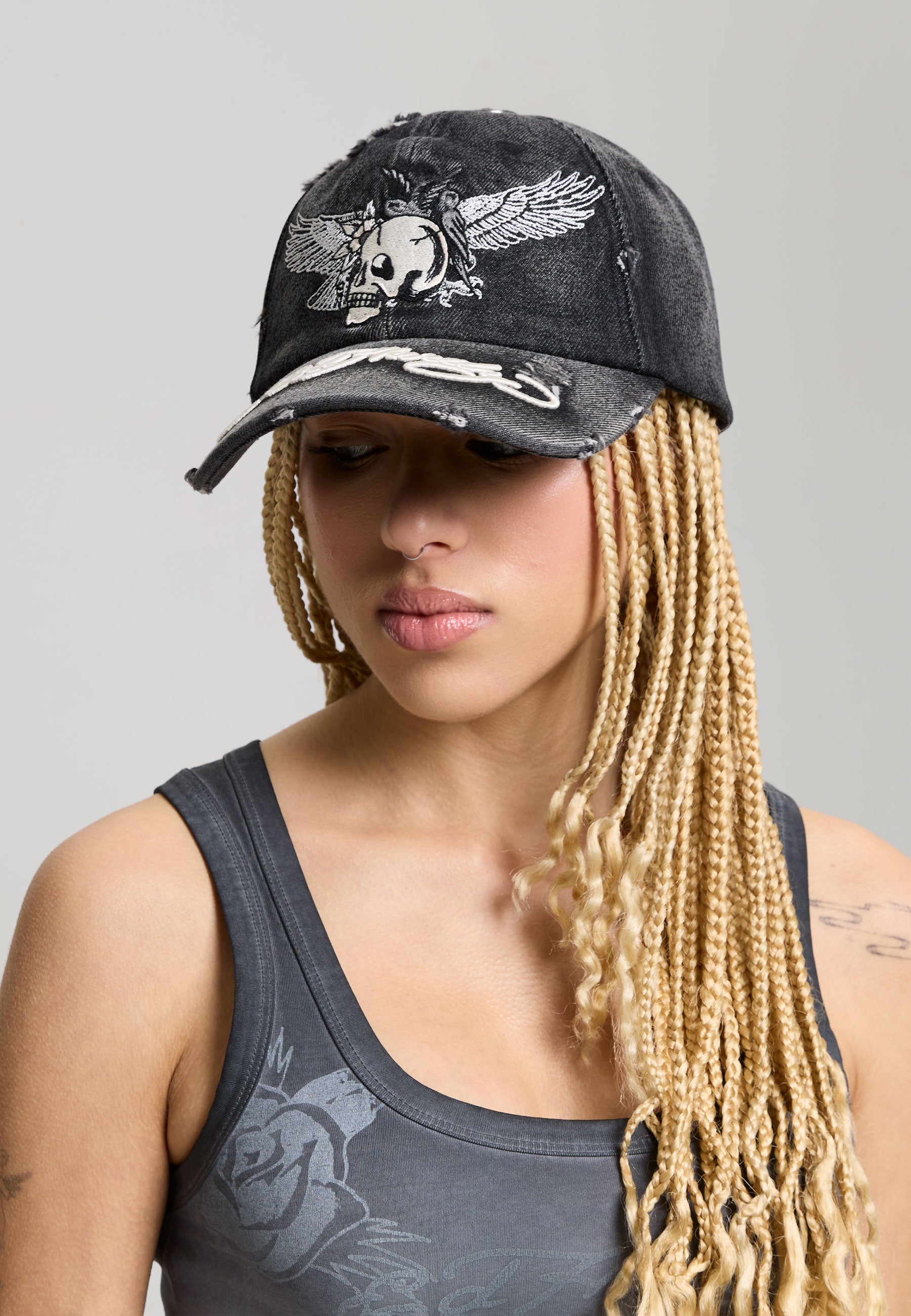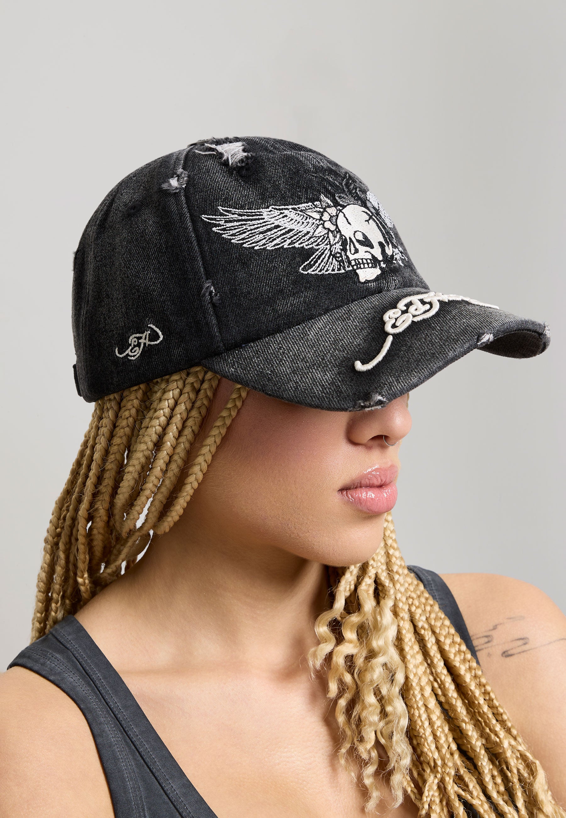 Unisex Flying Skull Distressed Washed 6 Panel Cap - Black