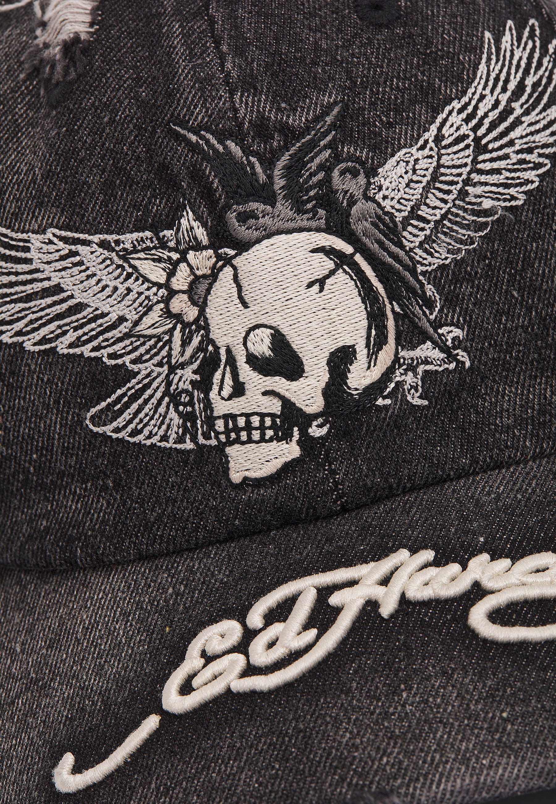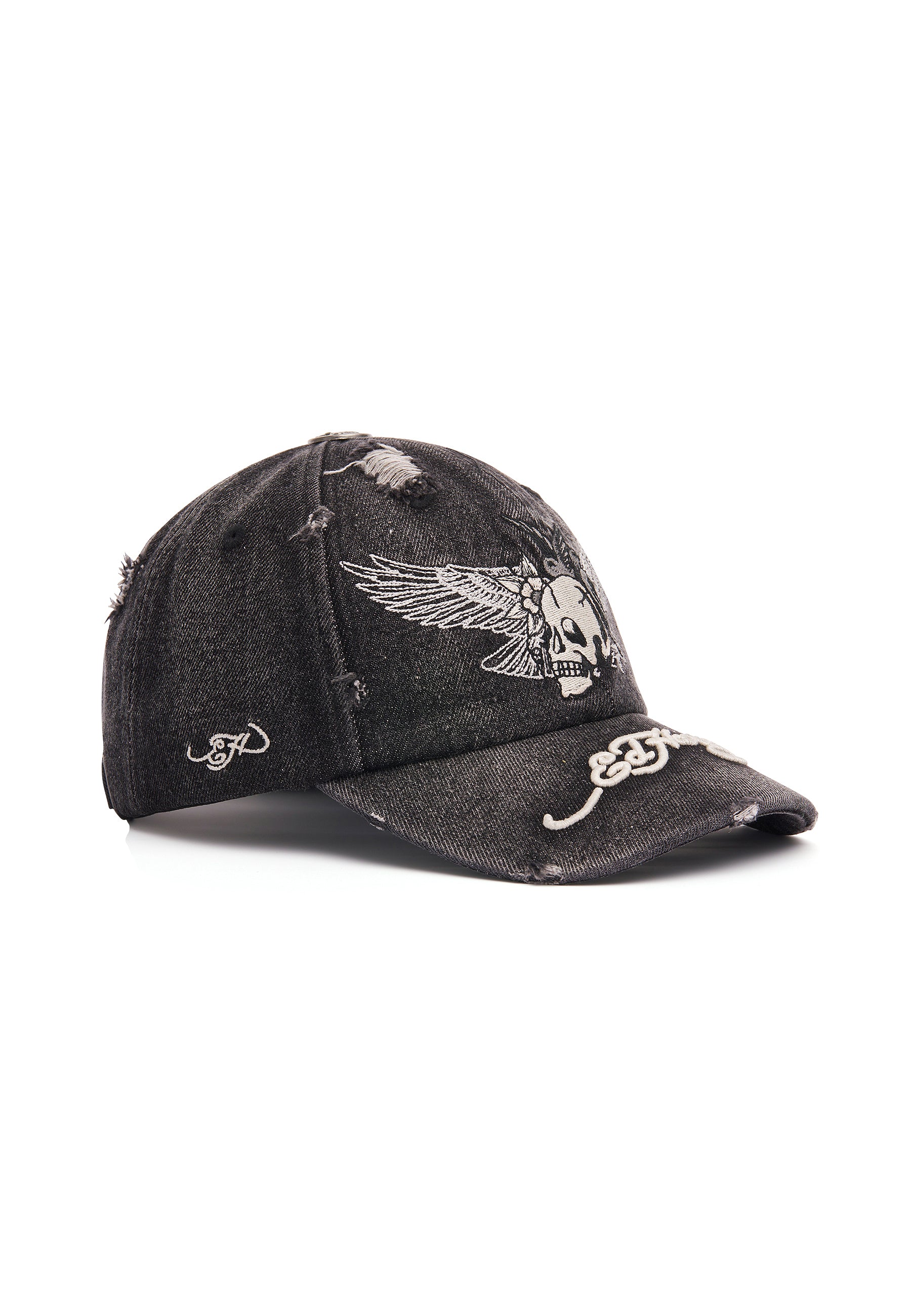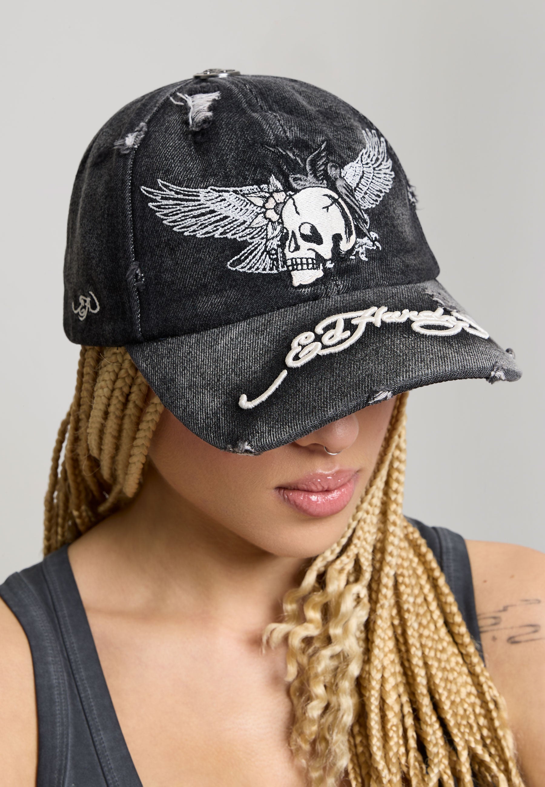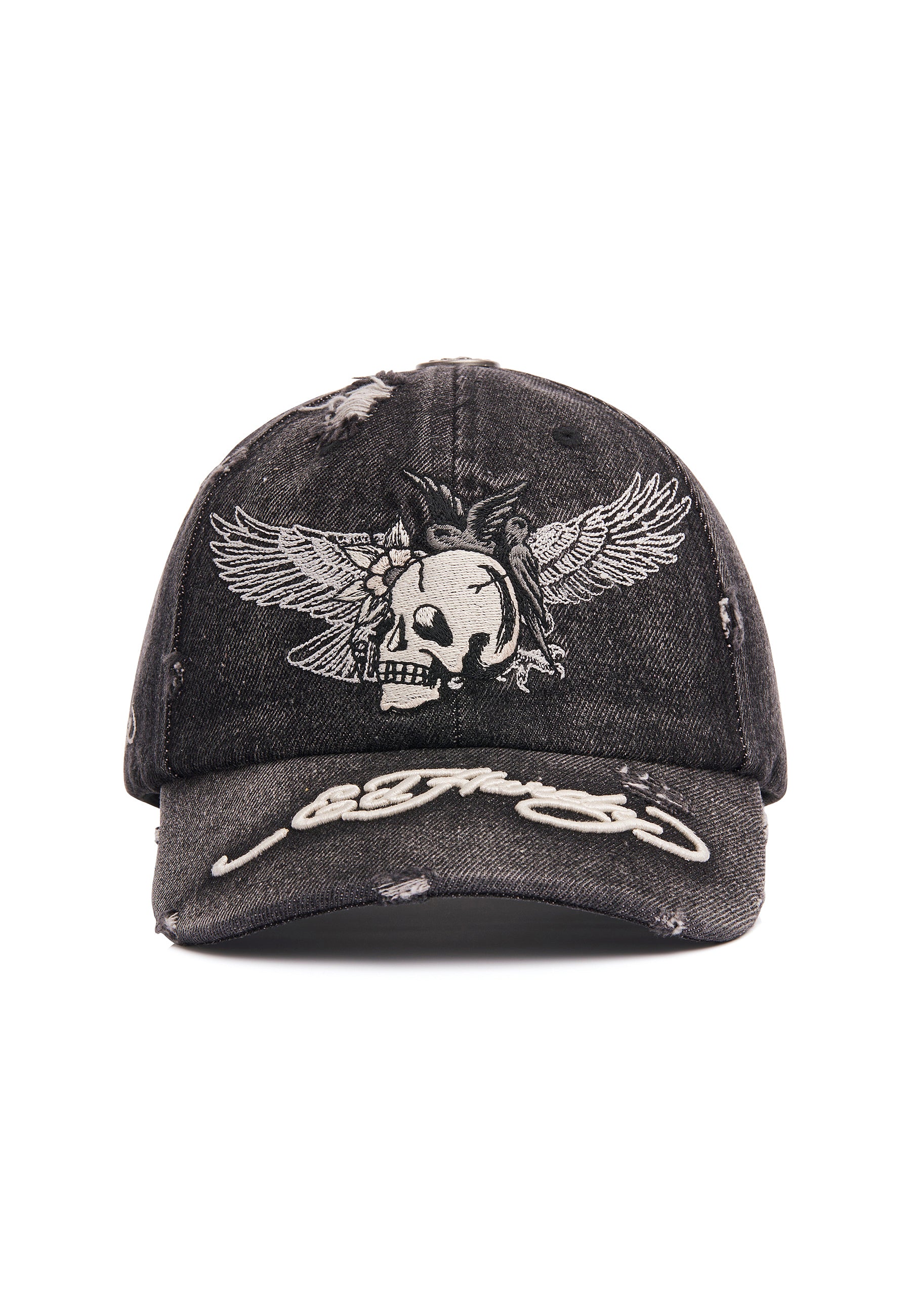 Unisex Flying Skull Distressed Washed 6 Panel Cap - Black
