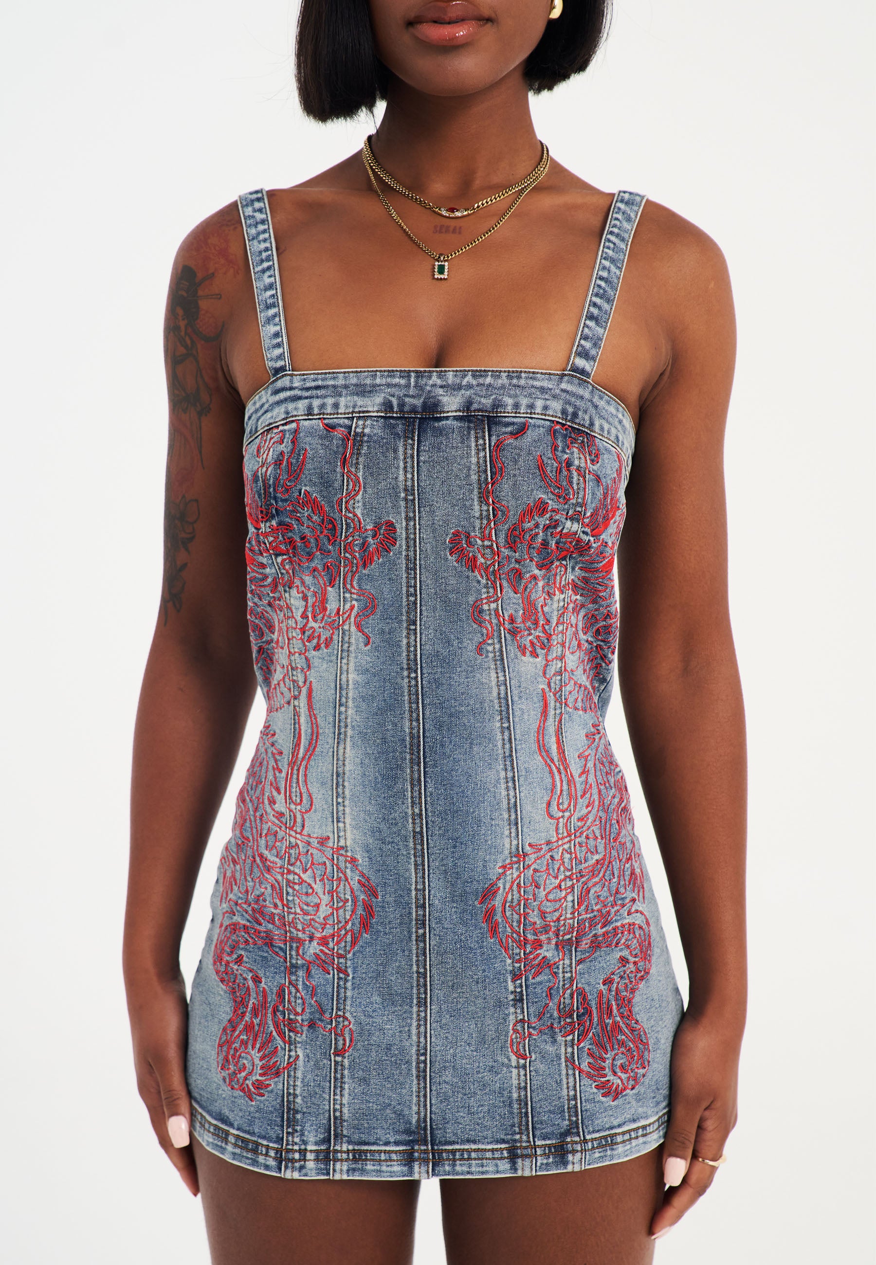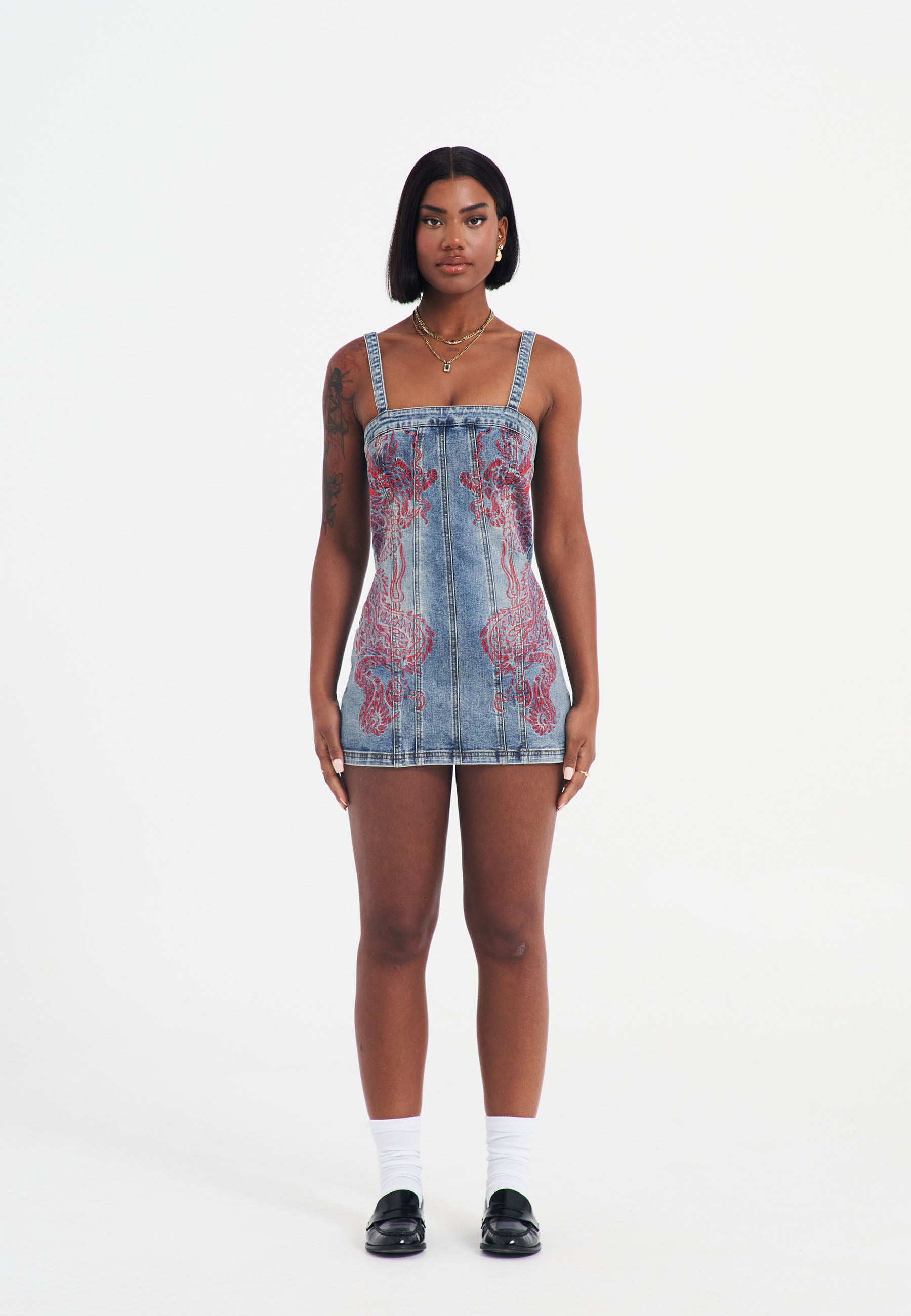 Womens Dragon Flame Denim Mini Dress - Mid Blue