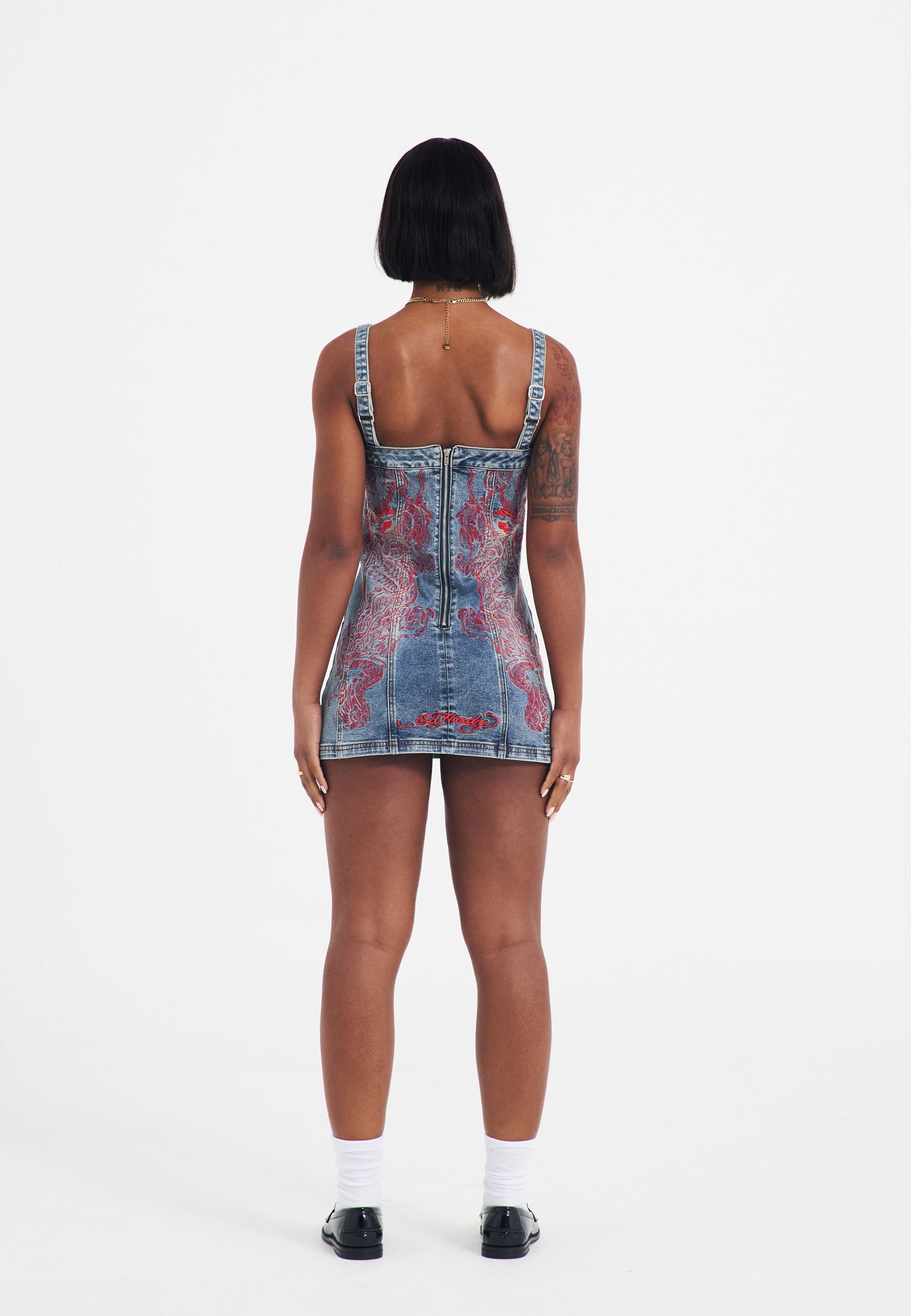 This ultra-mini dress in mid-blue washed denim features striking mirrored dragon flame embroidery from the Ed Hardy tattoo archive, featured on both the front and back. Designed for a tight fit, it includes adjustable straps for a customized look and a center-back zip closure for easy wear. Finished with Ed Hardy's signature logo on the back hem, this dress is bold and iconic.