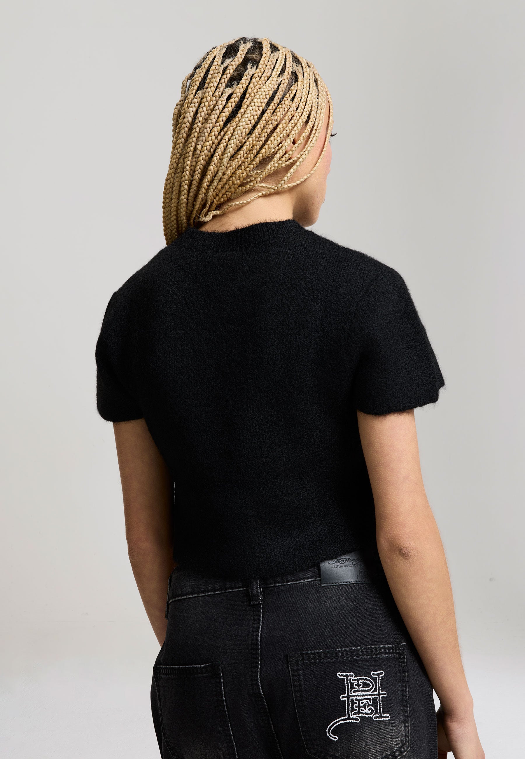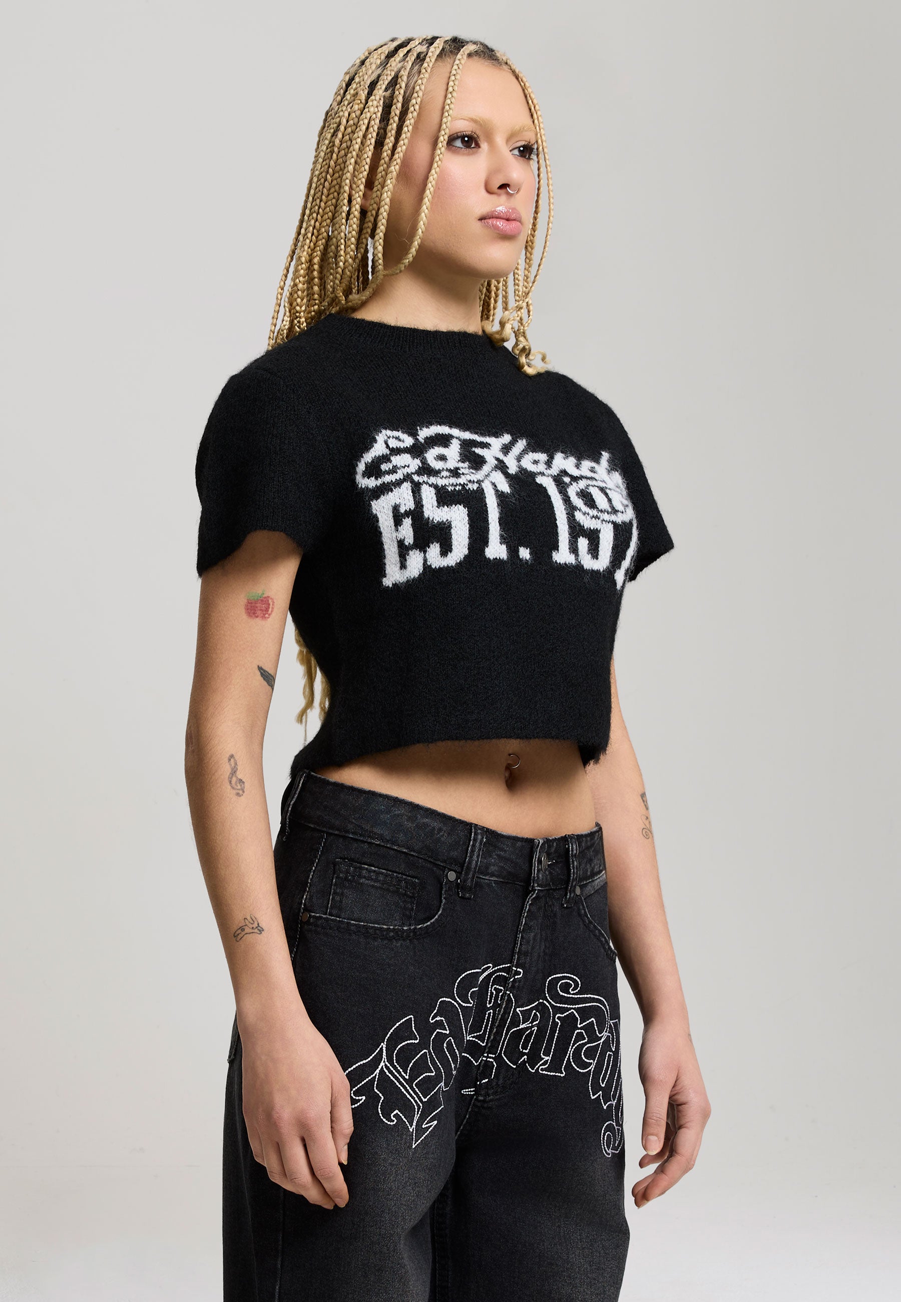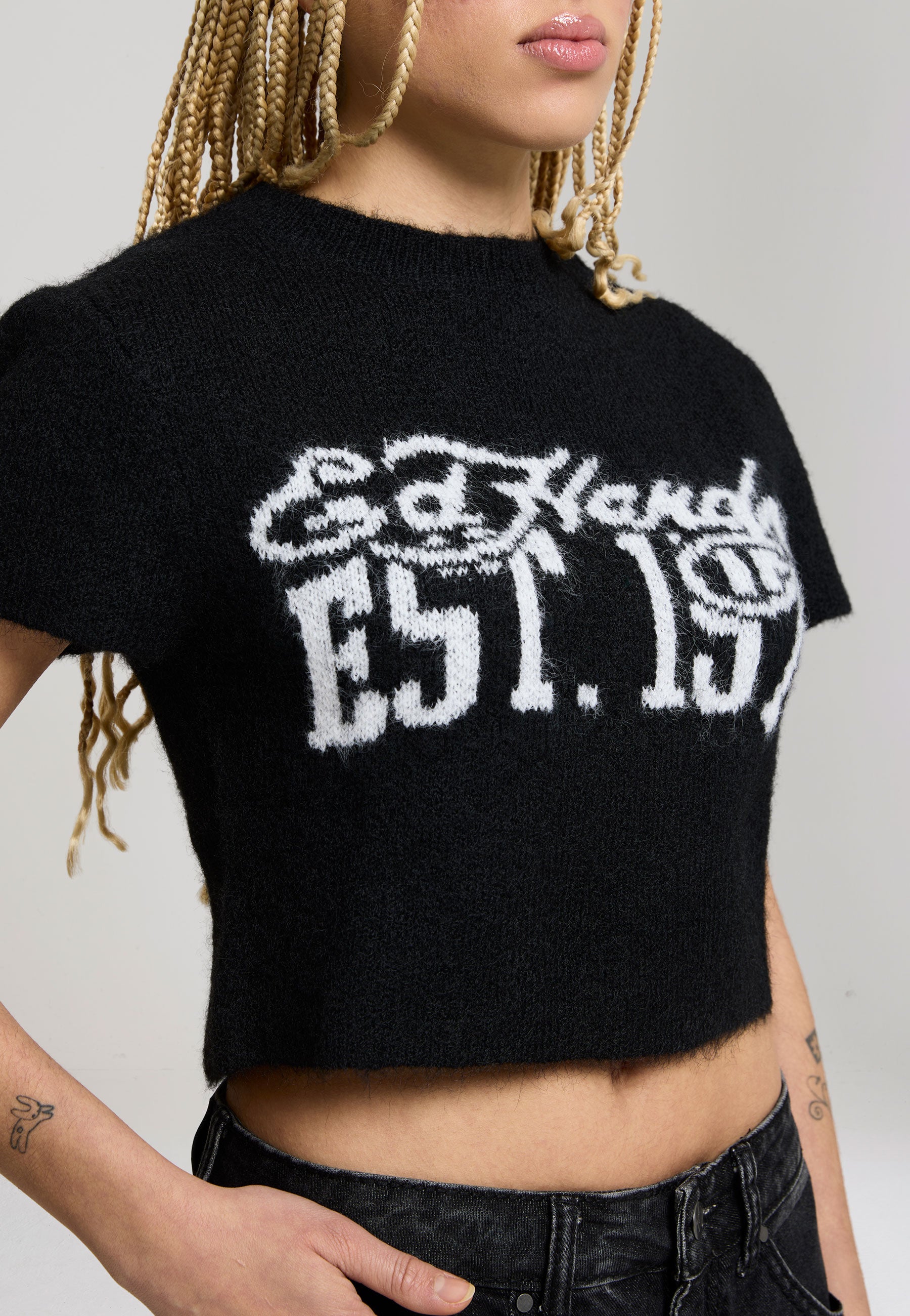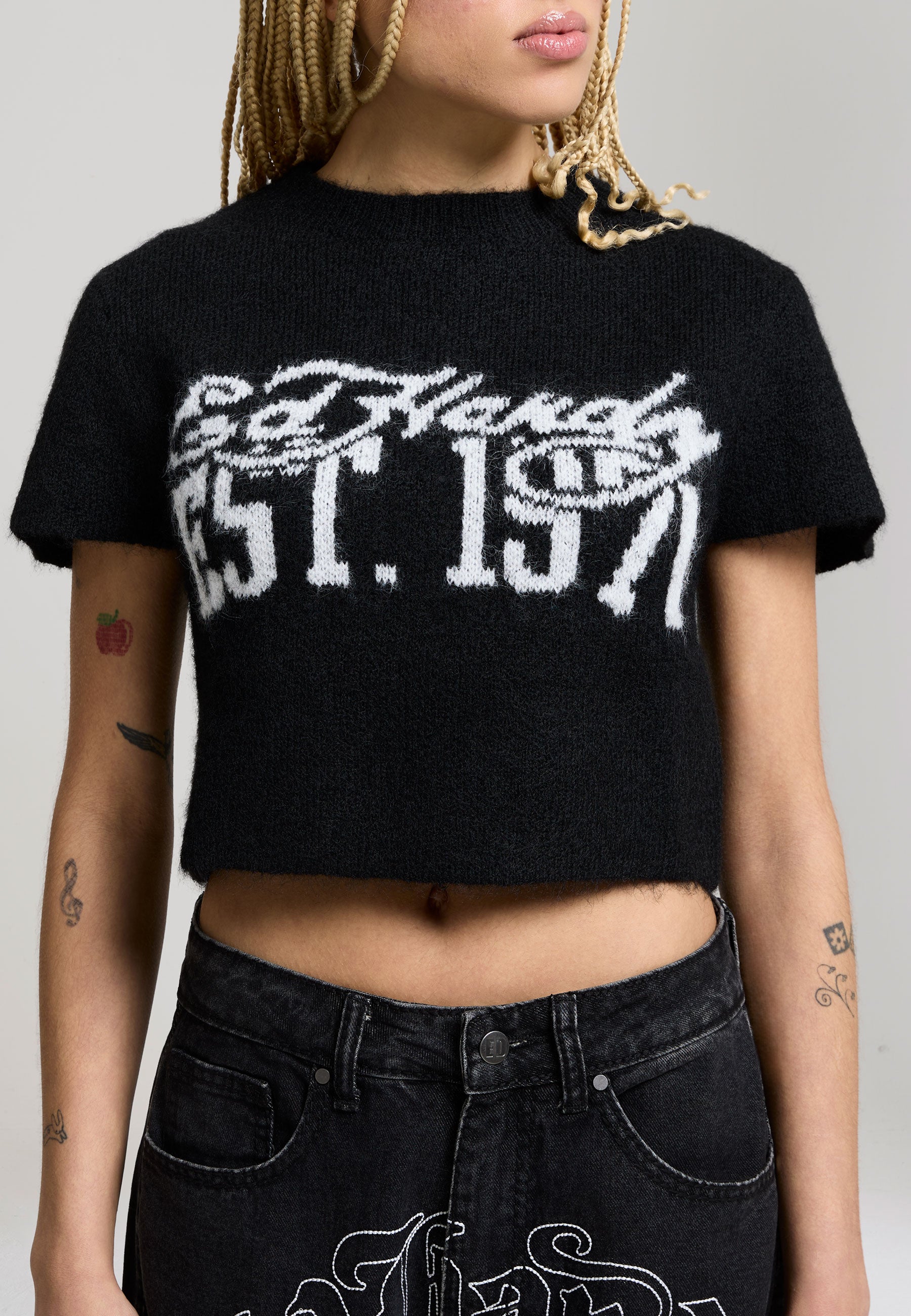 Womens Ed Hardy 1971 Fluffy Knitted Cropped Tight Fit T-shirt - Black